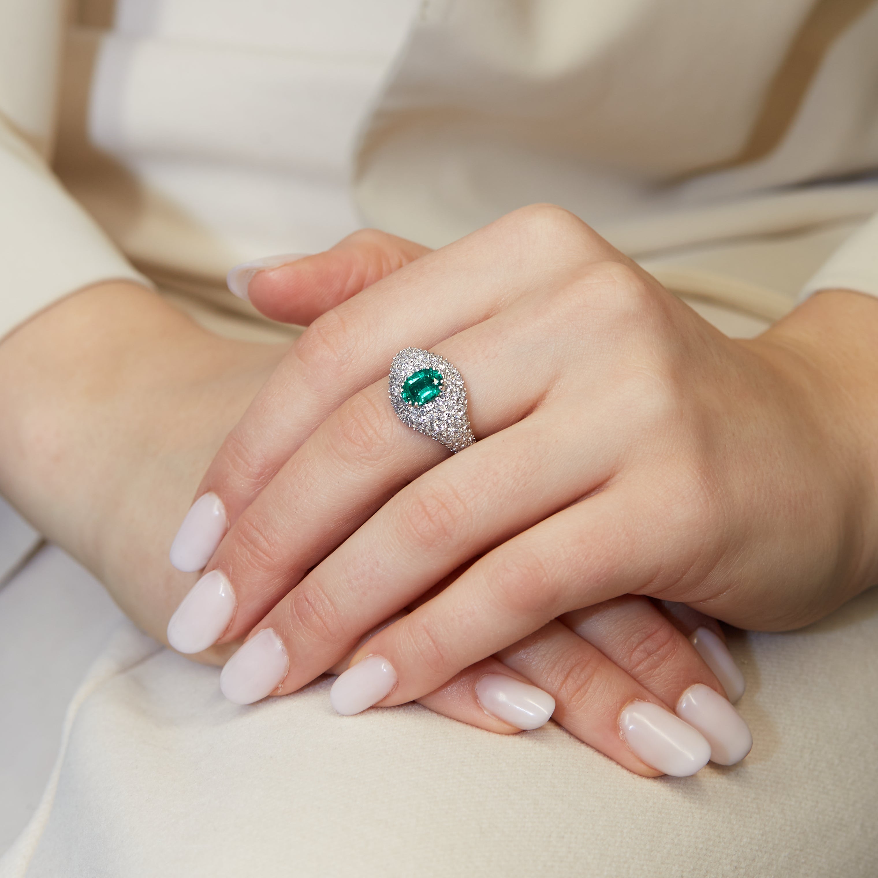 Una fascia dal carattere deciso, realizzata in oro bianco 18kt, con al centro uno smeraldo Lab-Grown taglio ovale da 1,09 carati, intenso e vibrante nel colore, incorniciato da una superficie interamente ricoperta di luce.