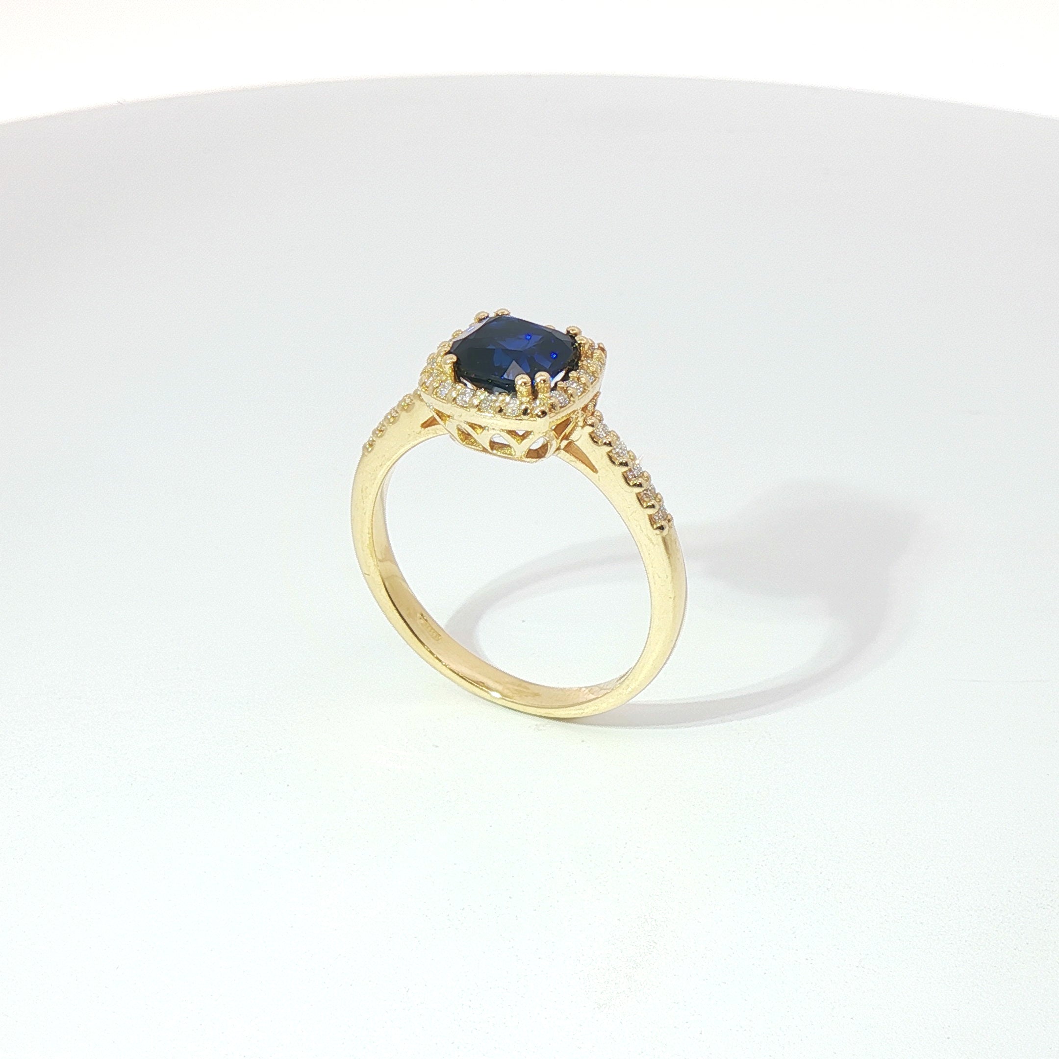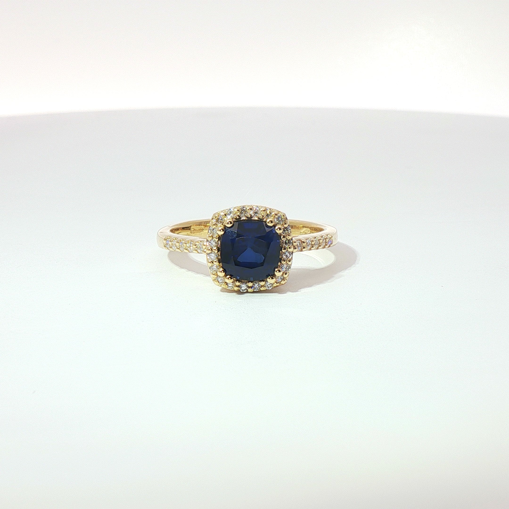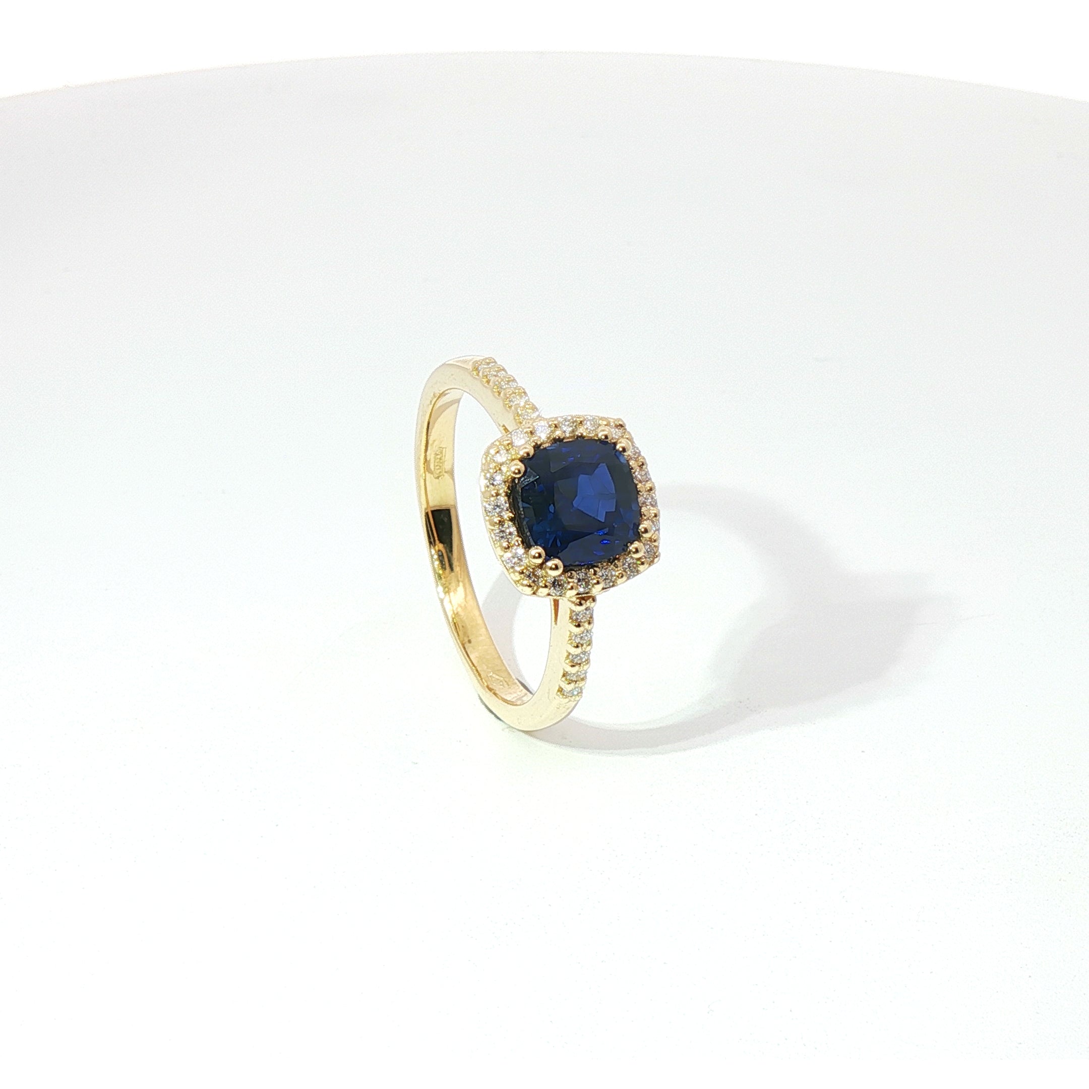L’anello in oro giallo 18kt è illuminato al centro da uno zaffiro Lab-Grown taglio cuscino da 1,44 carati, dal blu profondo e vibrante, incorniciato da 19 diamanti Lab-Grown taglio brillante.