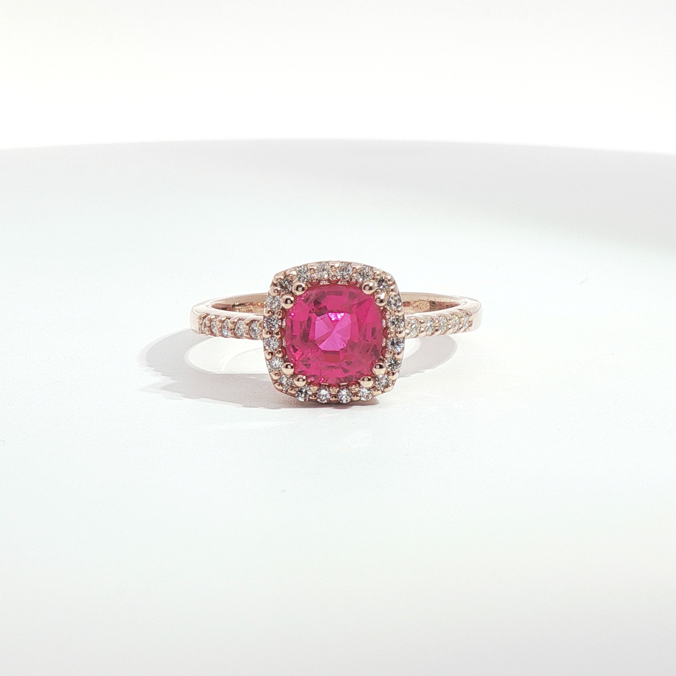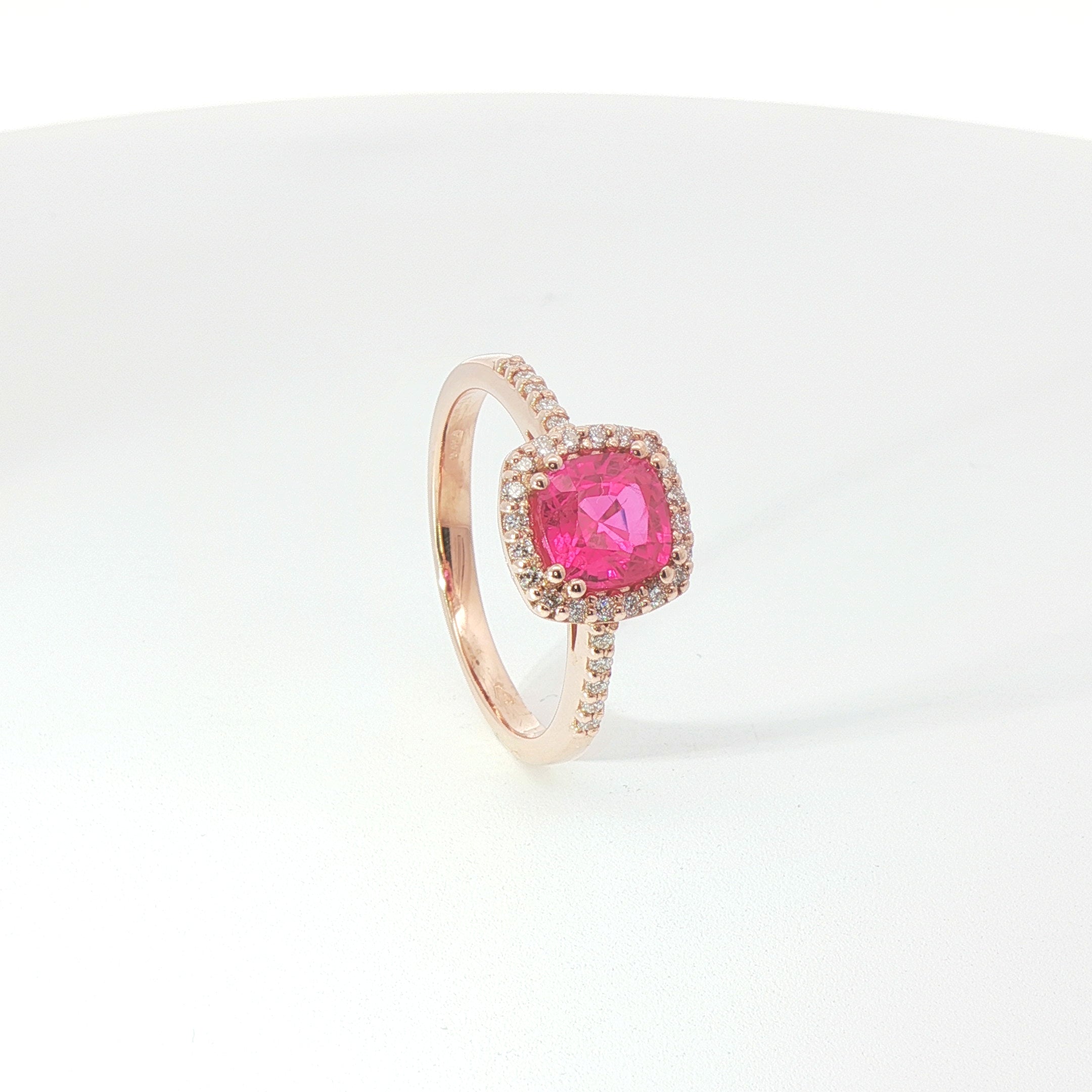 Anello in oro rosa con zaffiro rosa Lab-Grown taglio cuscino e diamanti Lab-Grown taglio brillante.