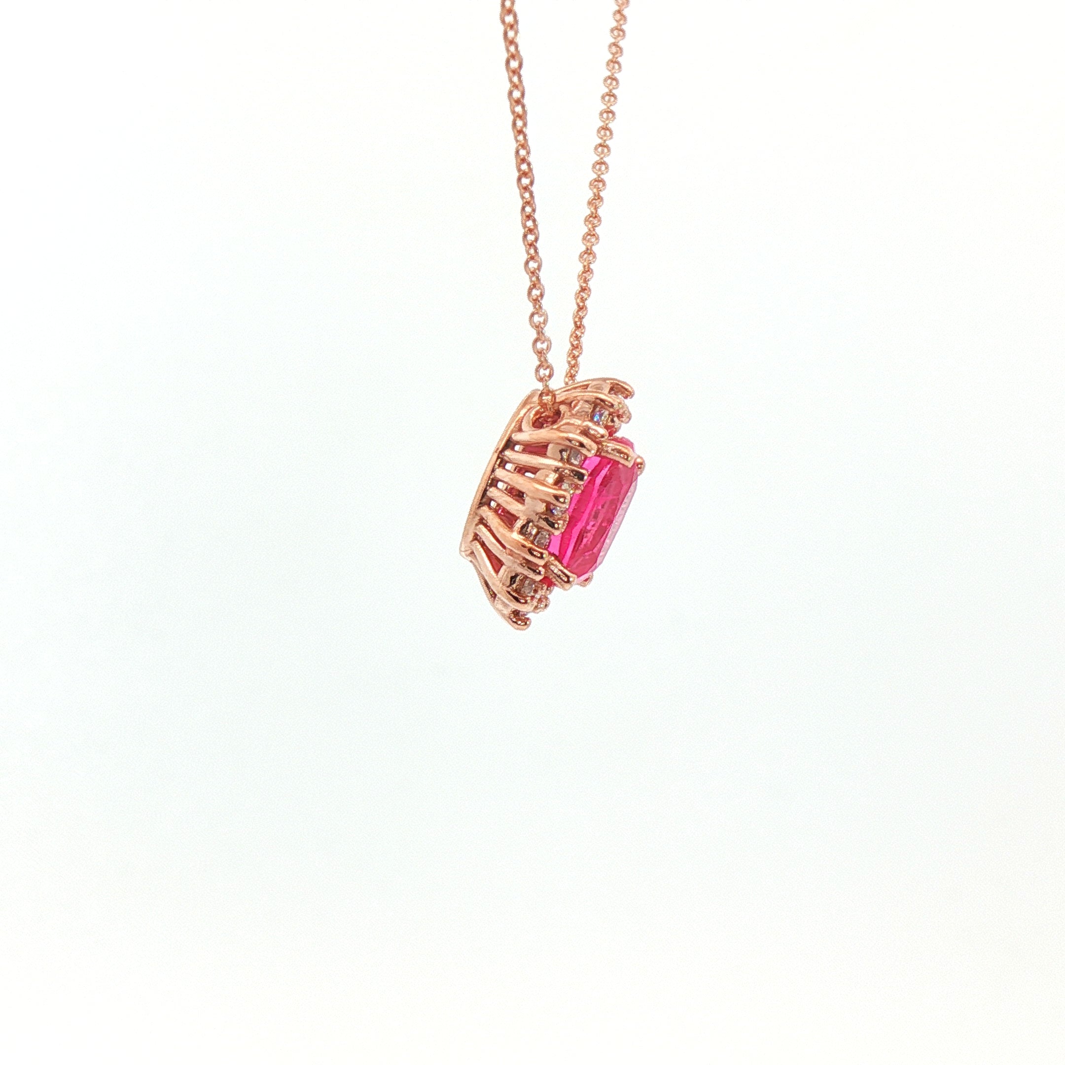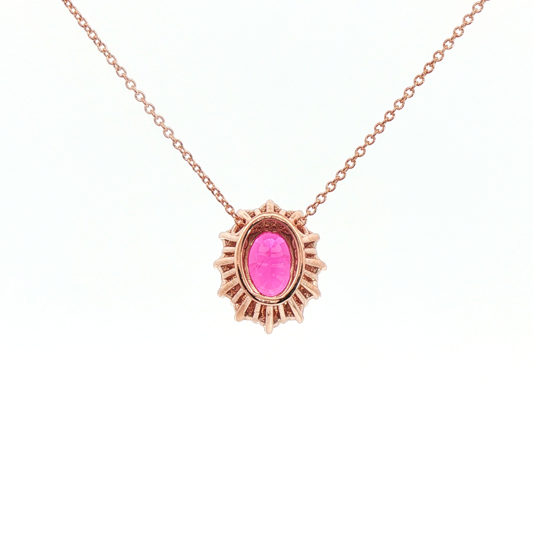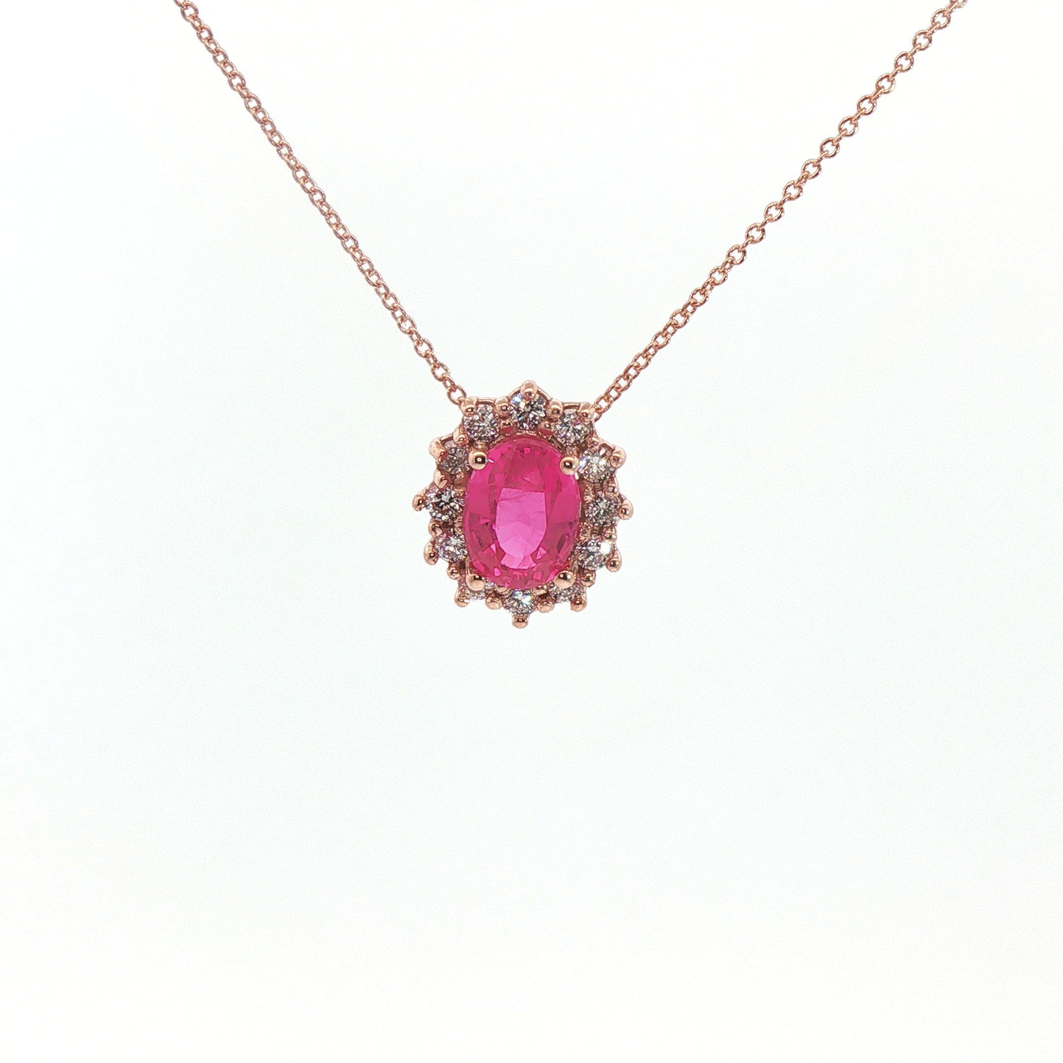 Un raffinato zaffiro rosa Lab-Grown taglio ovale da 1,13 carati è il protagonista di questo girocollo in oro rosa 18 kt, circondato da una corona di 12 diamanti Lab-Grown taglio brillante per un totale di 0,22 carati, selezionati per colore E/F e purezza VS.