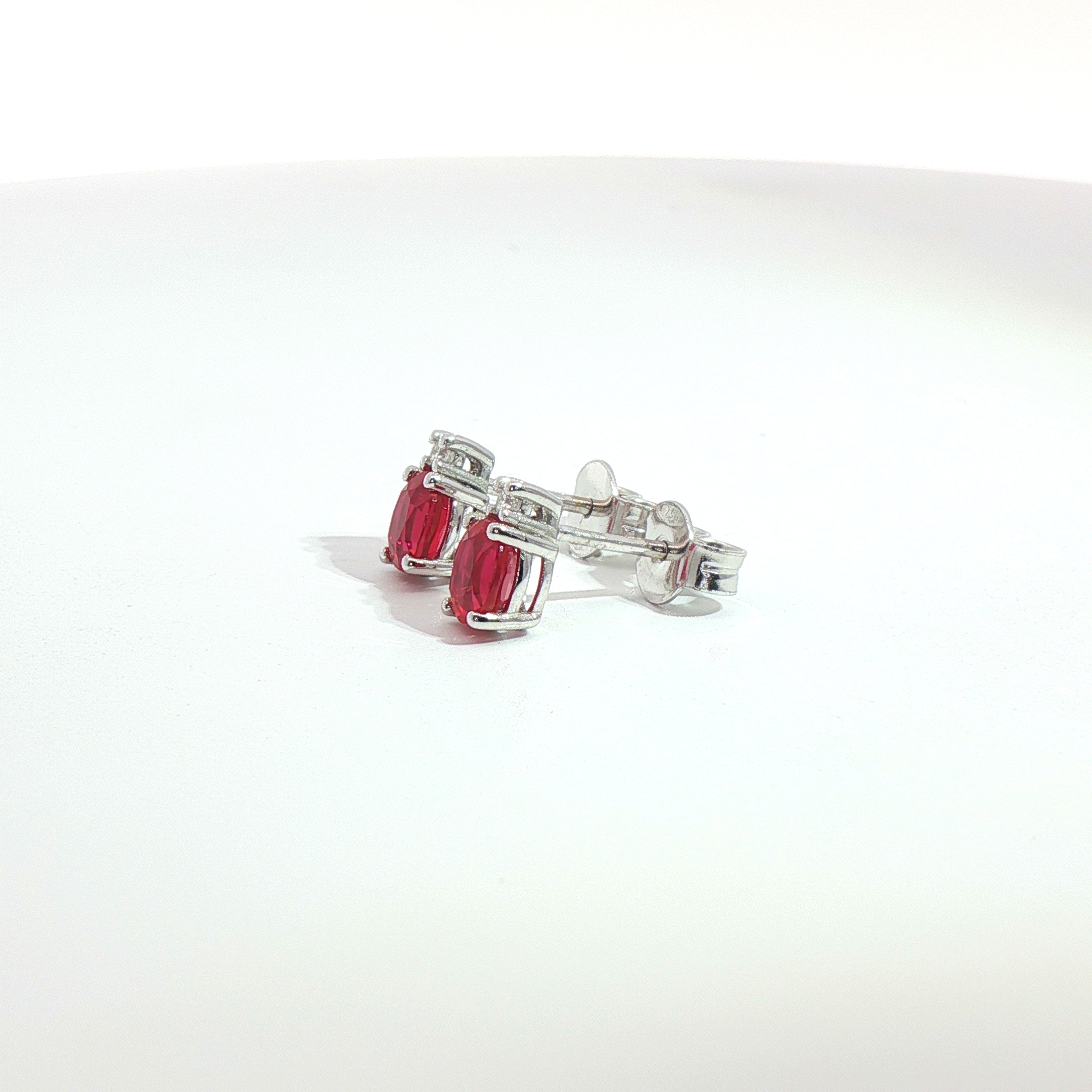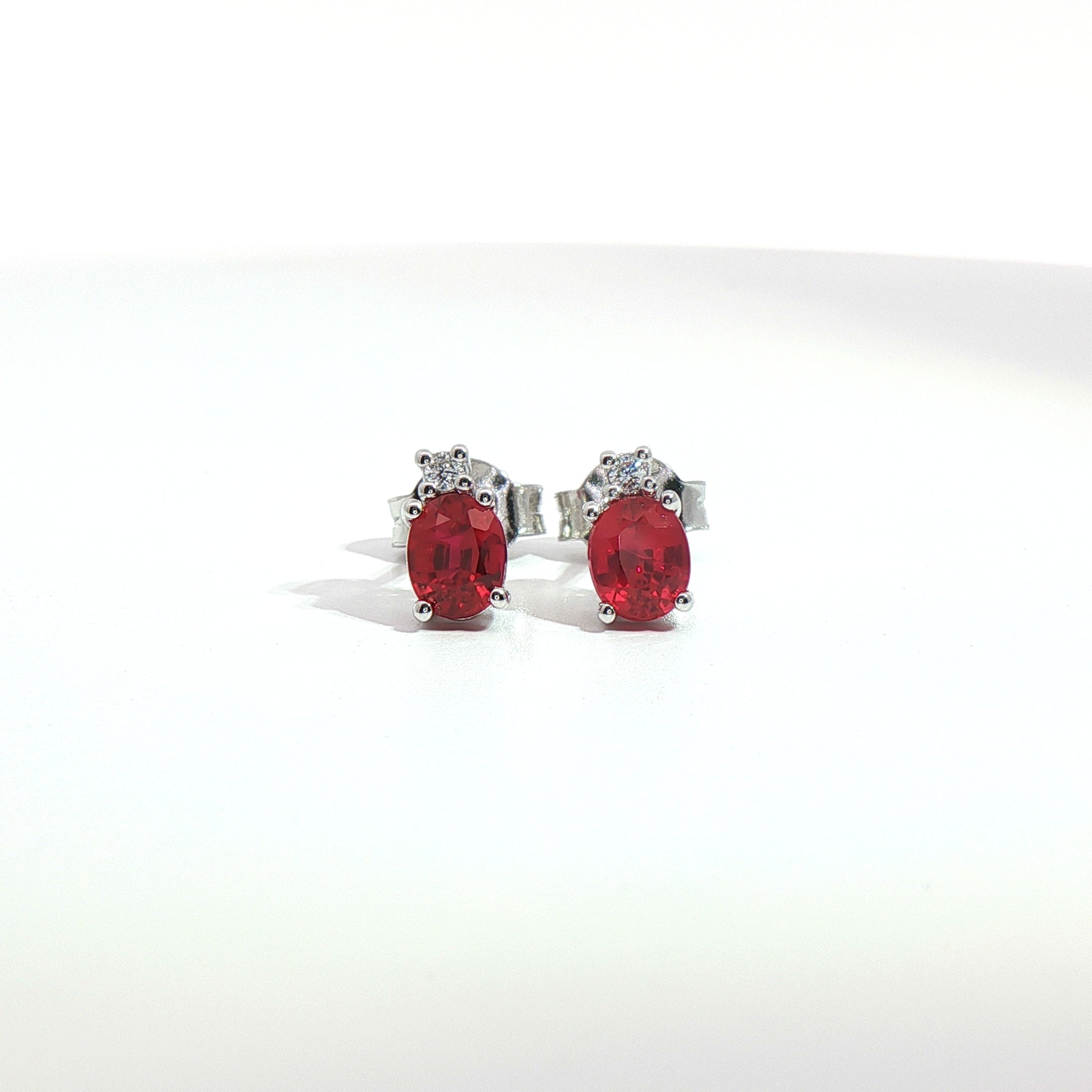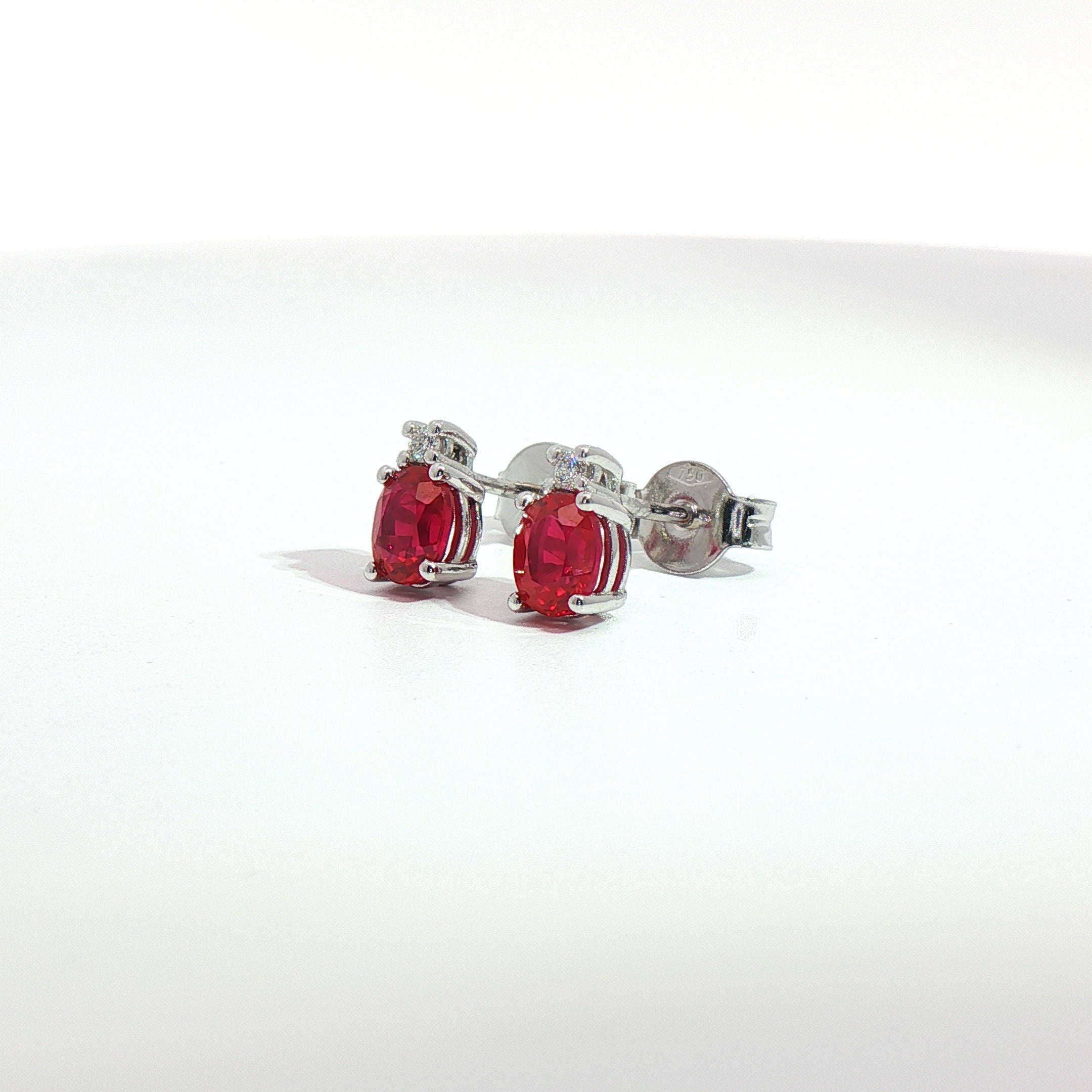 Orecchini punto luce in oro bianco 18kt con rubini Lab-Grown taglio ovale dal colore rosso intenso per un totale di 1,11 carati, sormontati da diamanti Lab-Grown taglio brillante da 0,03 carati complessivi, selezionati per colore E/F e purezza VS.