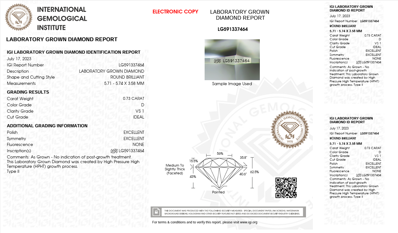 0,73 CERTIFICATO IGI: LG591337464 - COLORE D - PUREZZA VS1