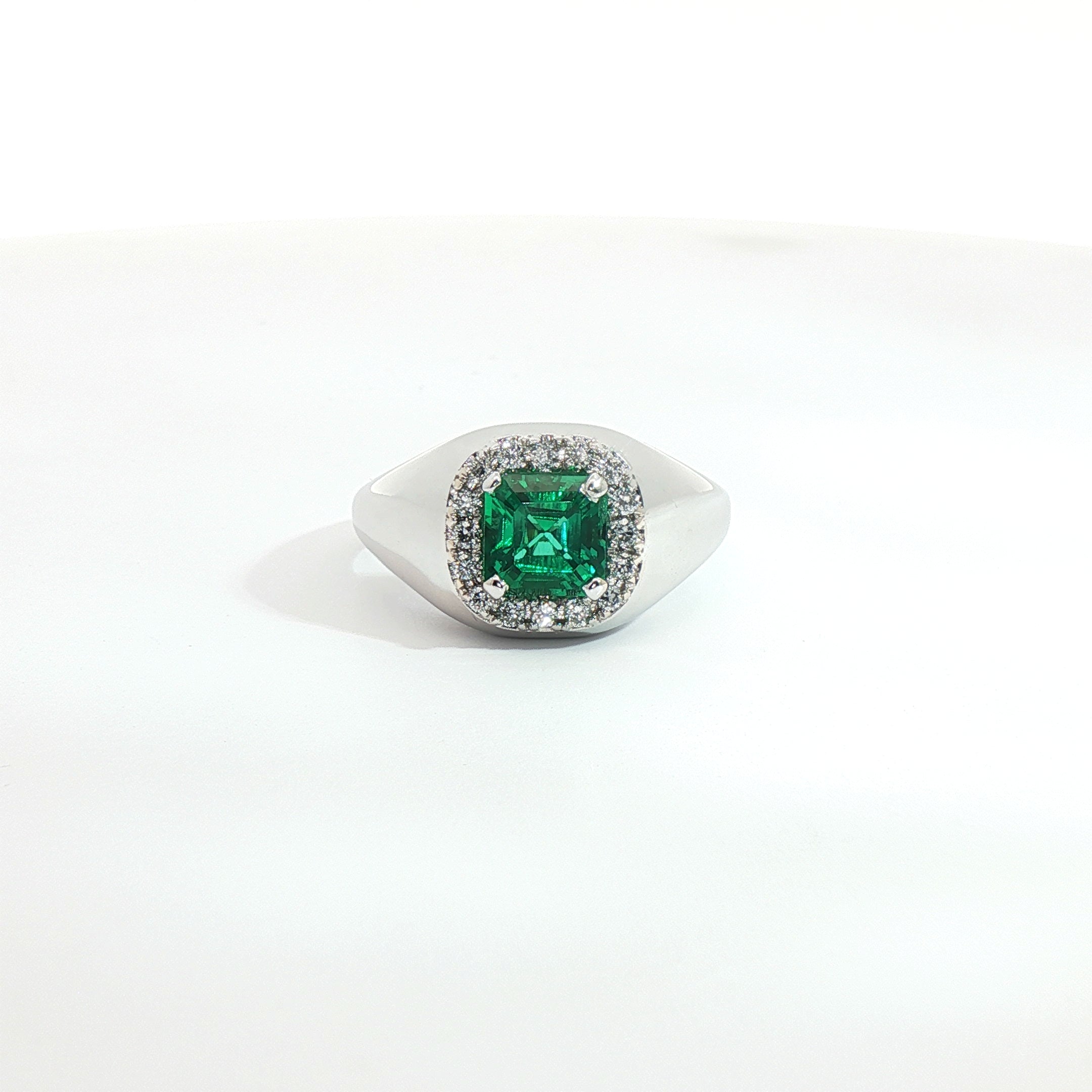 Anello a sigillo in oro bianco con smeraldo Lab-Grown taglio asscher e diamanti Lab-Grown taglio brillante.