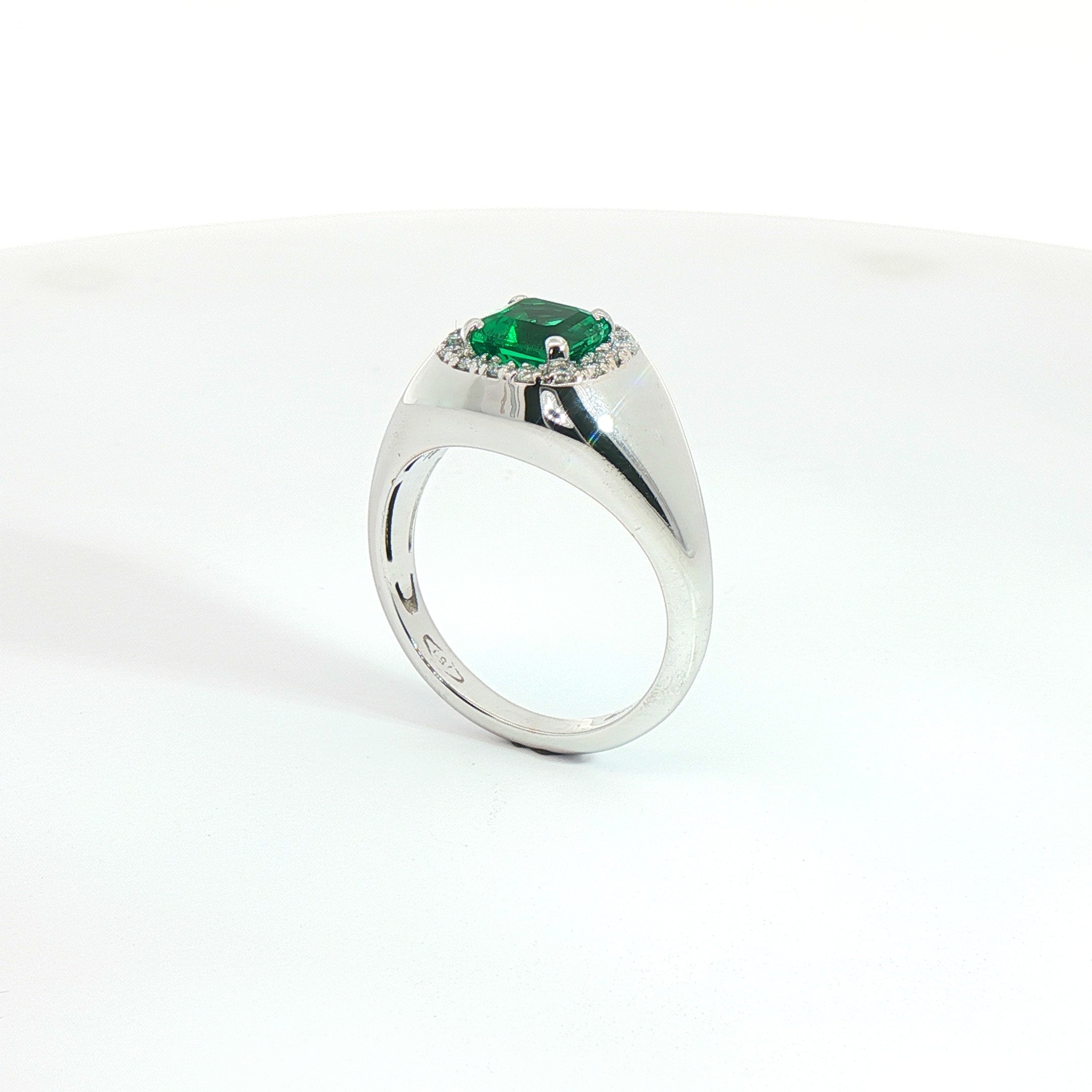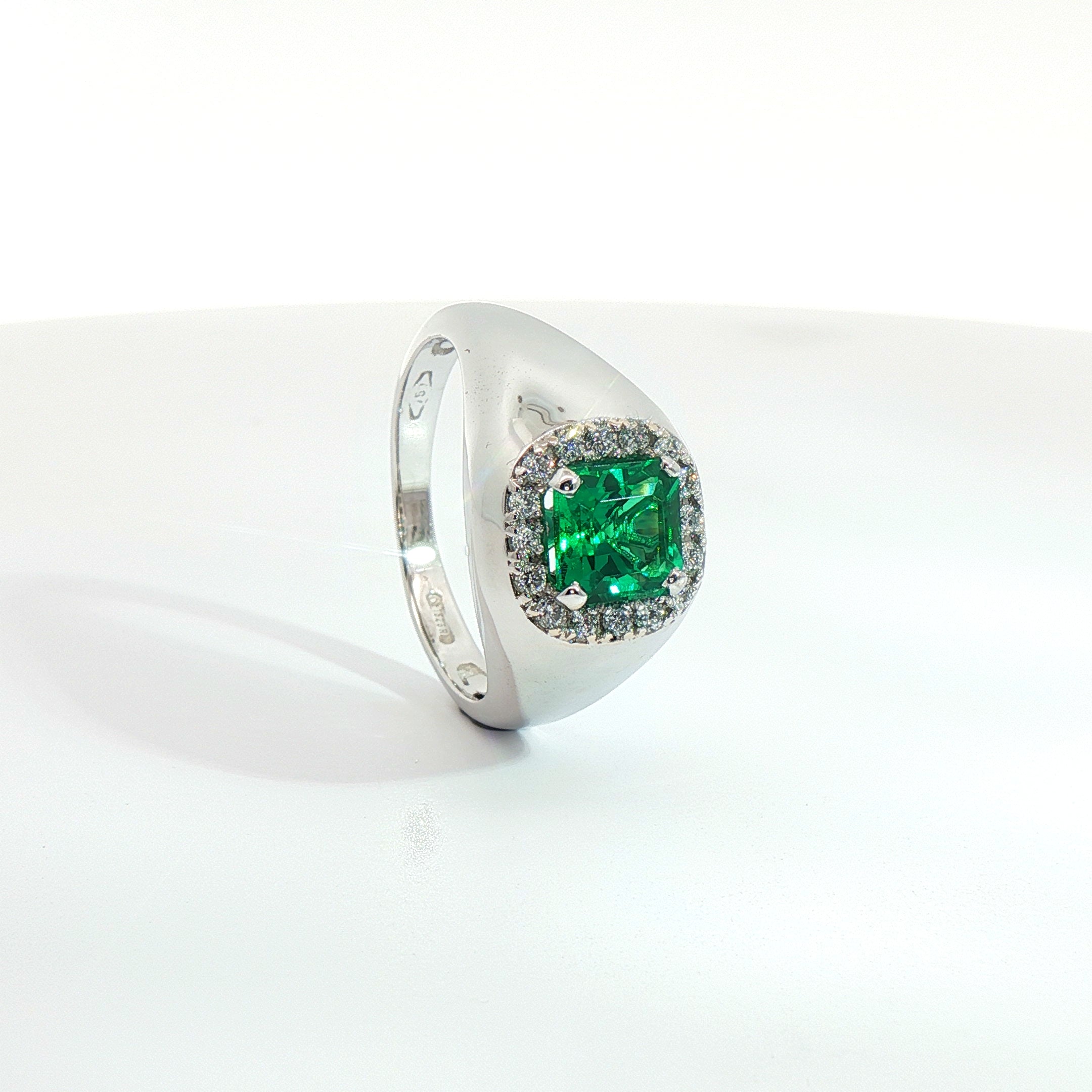 Anello a sigillo in oro bianco 18kt, dal design deciso ma sofisticato, con al centro uno smeraldo Lab-Grown taglio Asscher da 1,01 carati, scelto per il suo taglio geometrico e la profondità del colore.