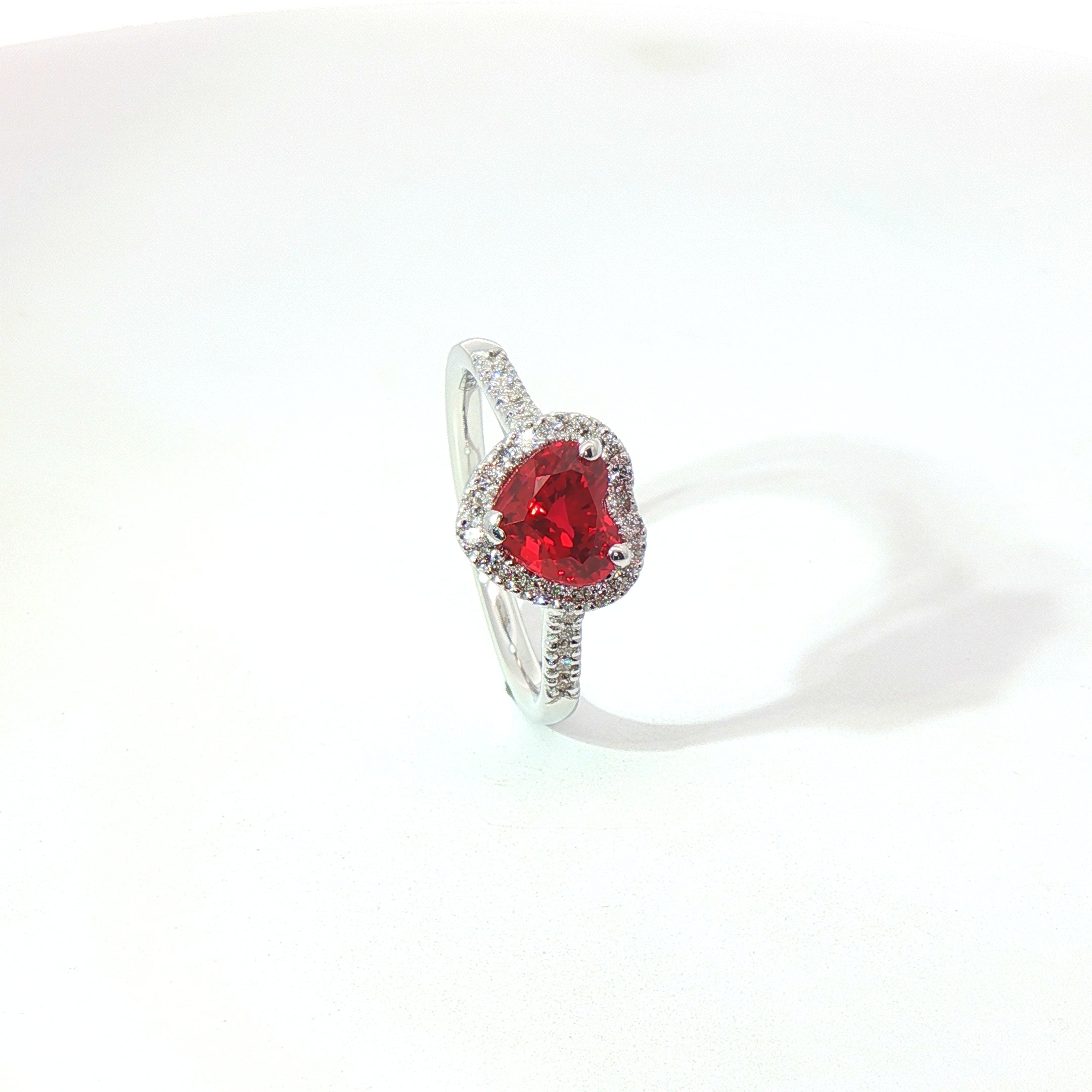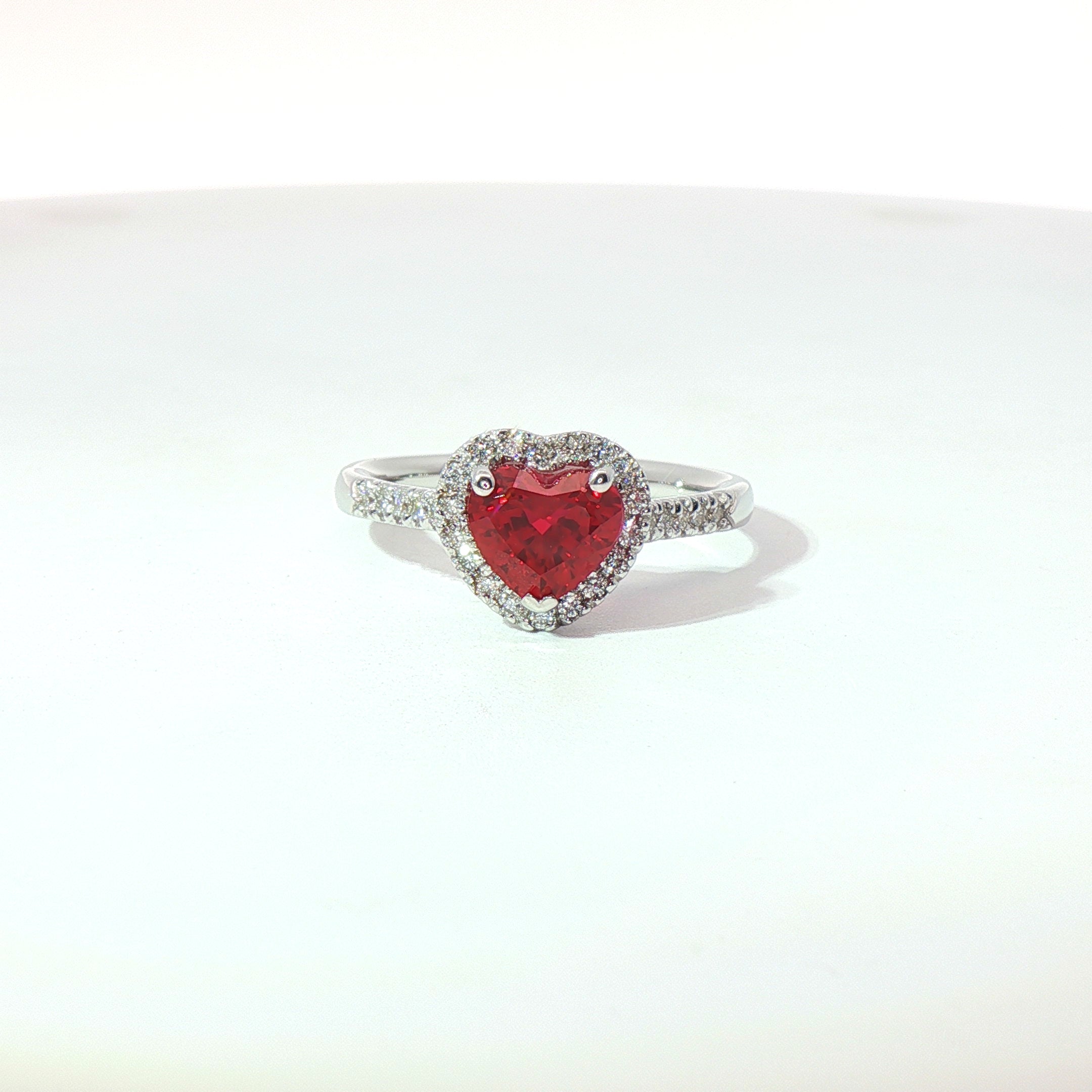 Un anello in oro bianco 18 kt dal fascino romantico, con protagonista un rubino Lab-Grown taglio cuore da 1,53 ct, simbolo di passione ed eleganza.
