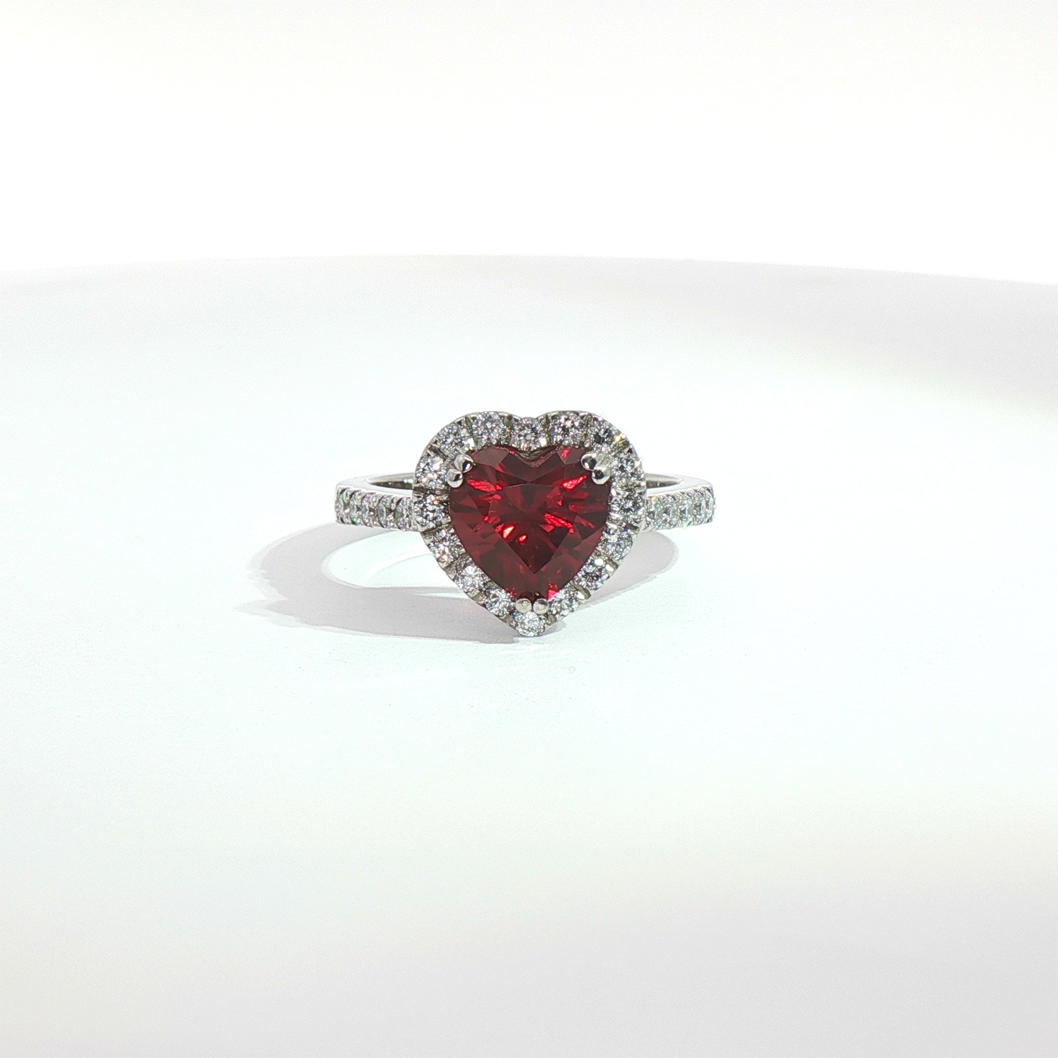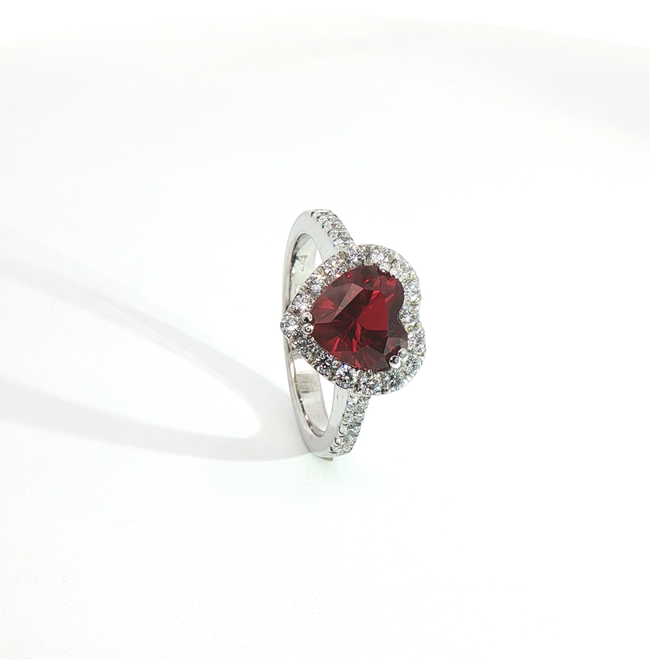Anello in oro bianco 18kt con rubino Lab-Grown taglio cuore da 2,65 carati, certificato IGI, incorniciato da 16 diamanti Lab-Grown taglio brillante che ne esaltano la forma e l’intensità del colore.