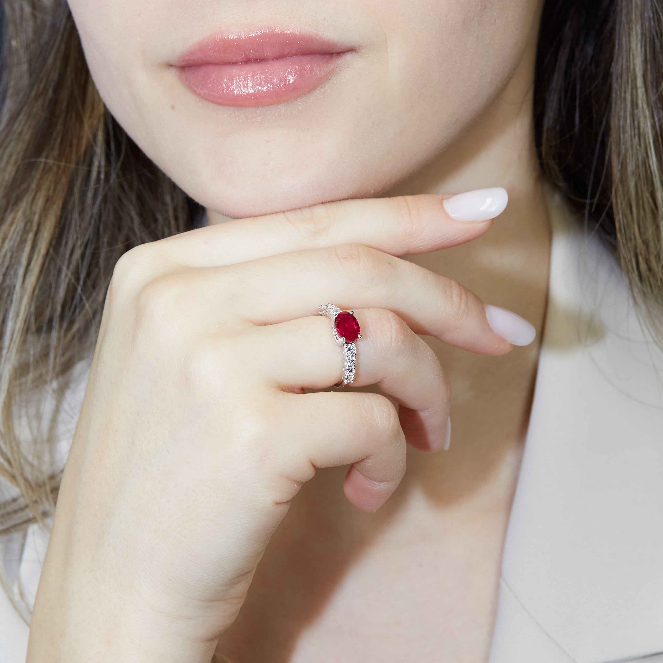 Anello in oro bianco con rubino Lab-Grown taglio ovale e diamanti Lab-Grown taglio brillante.