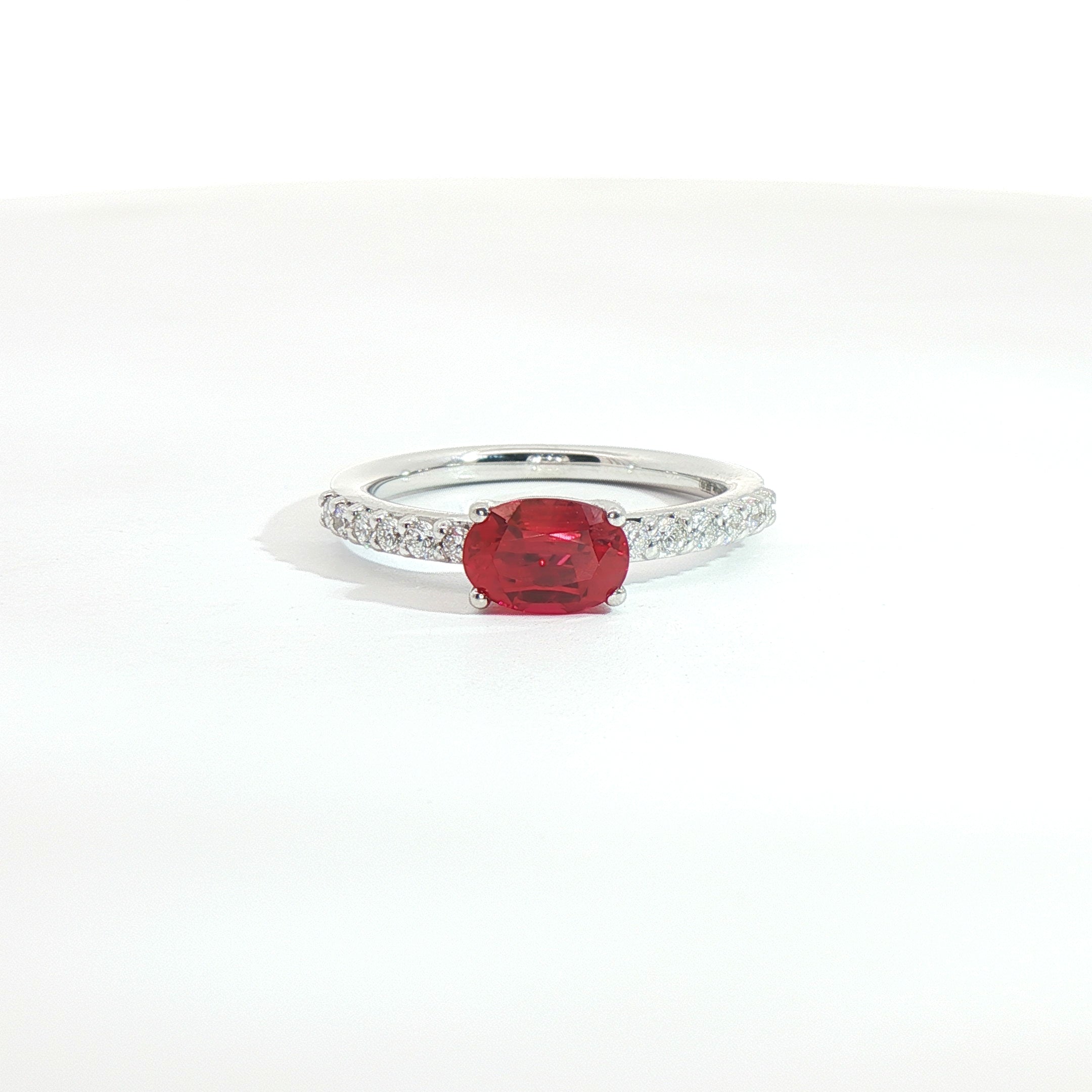 Realizzato in oro bianco 18kt, questo anello è un’elegante espressione di equilibrio e colore. Al centro, un rubino Lab-Grown taglio ovale da 1,24 carati cattura lo sguardo con il suo rosso profondo e vivido, valorizzato da una lavorazione precisa che ne esalta la forma allungata.