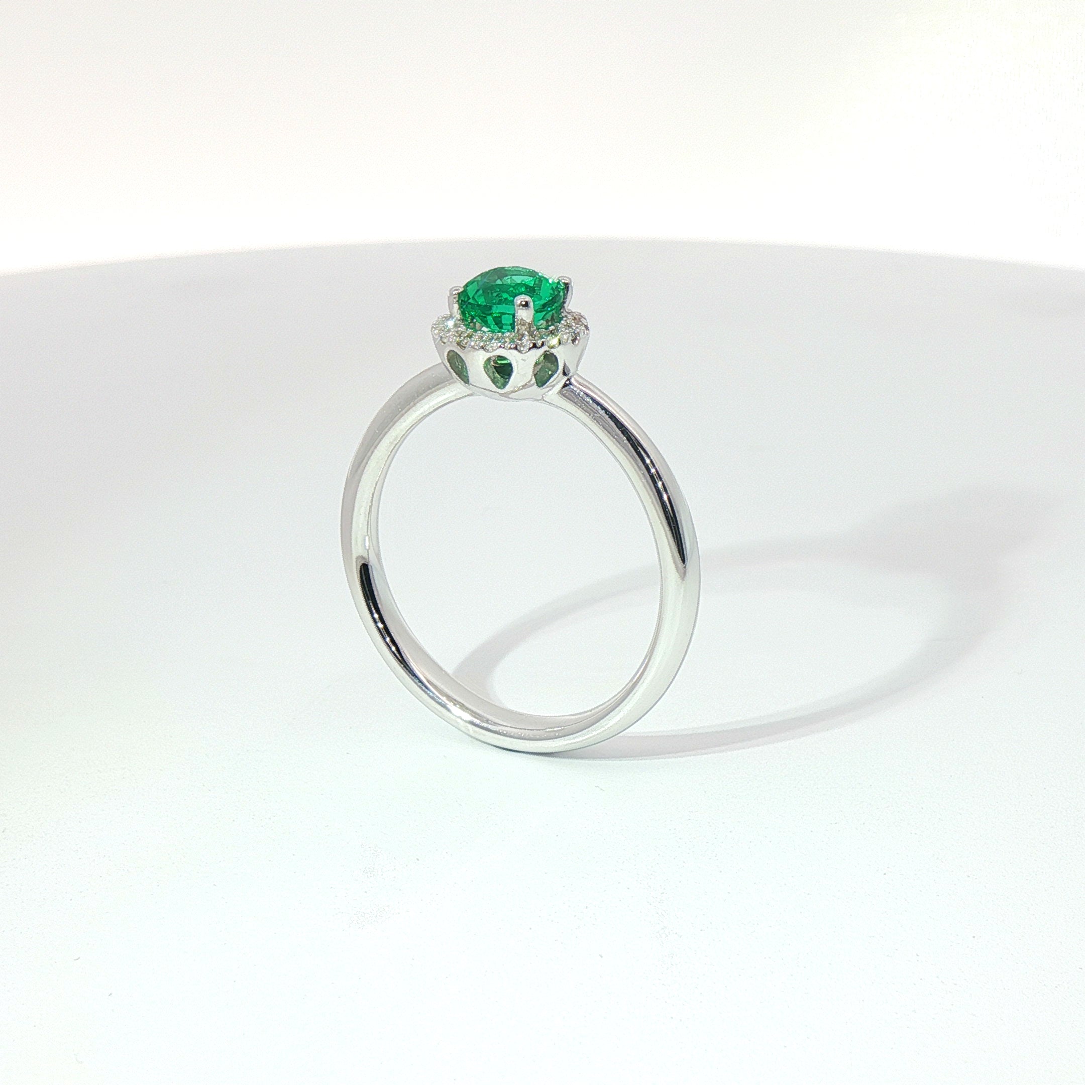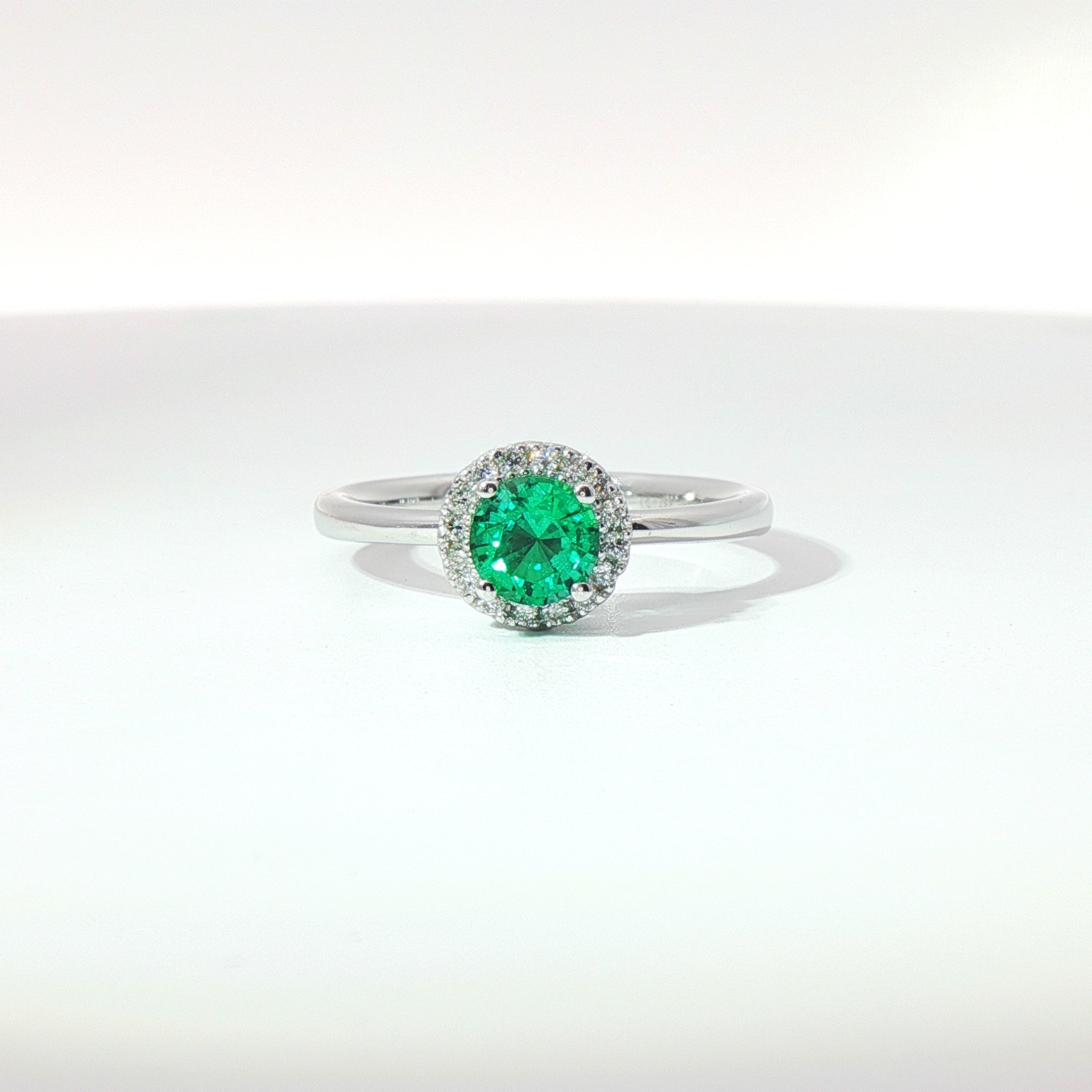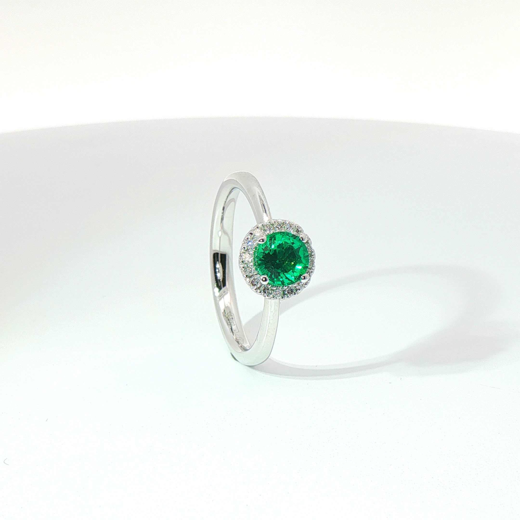 Anello in oro bianco 18kt con smeraldo Lab-Grown taglio brillante da 0,50 carati, incorniciato da una raffinata corona composta da 16 diamanti Lab-Grown taglio brillante per un totale di 0,10 carati, selezionati per colore E/F e purezza VS.