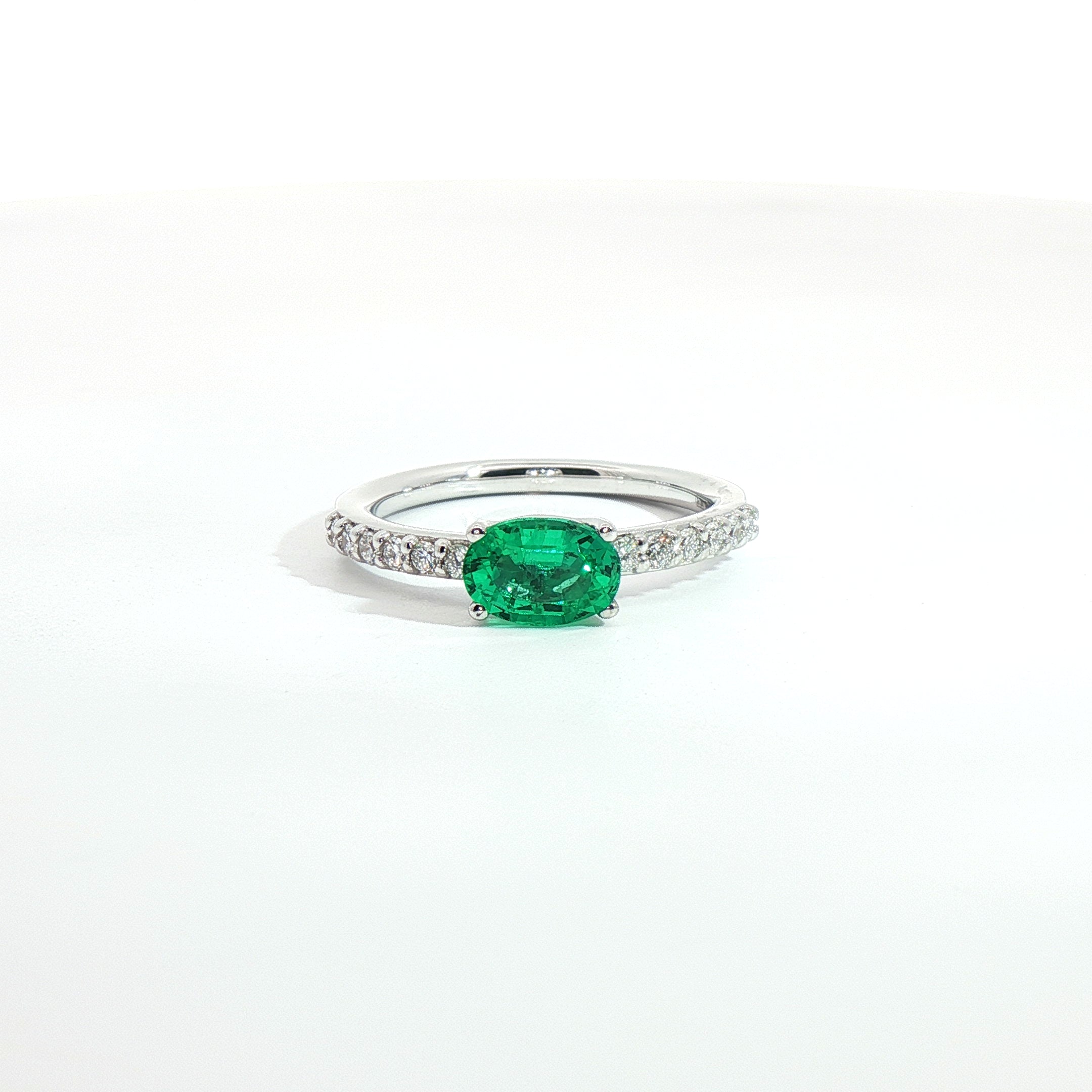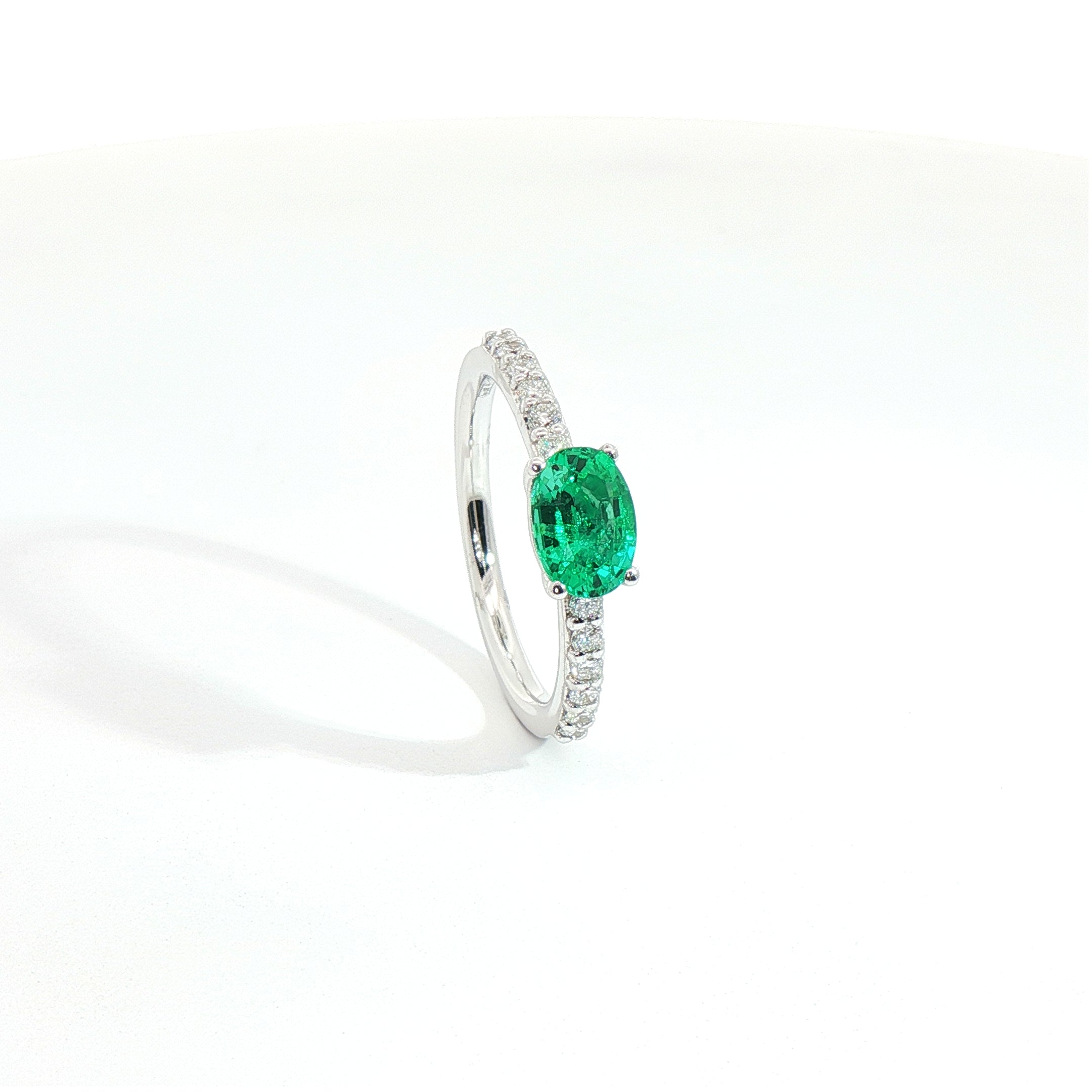 Anello in oro bianco con smeraldo Lab-Grown taglio ovale e diamanti Lab-Grown taglio brillante.