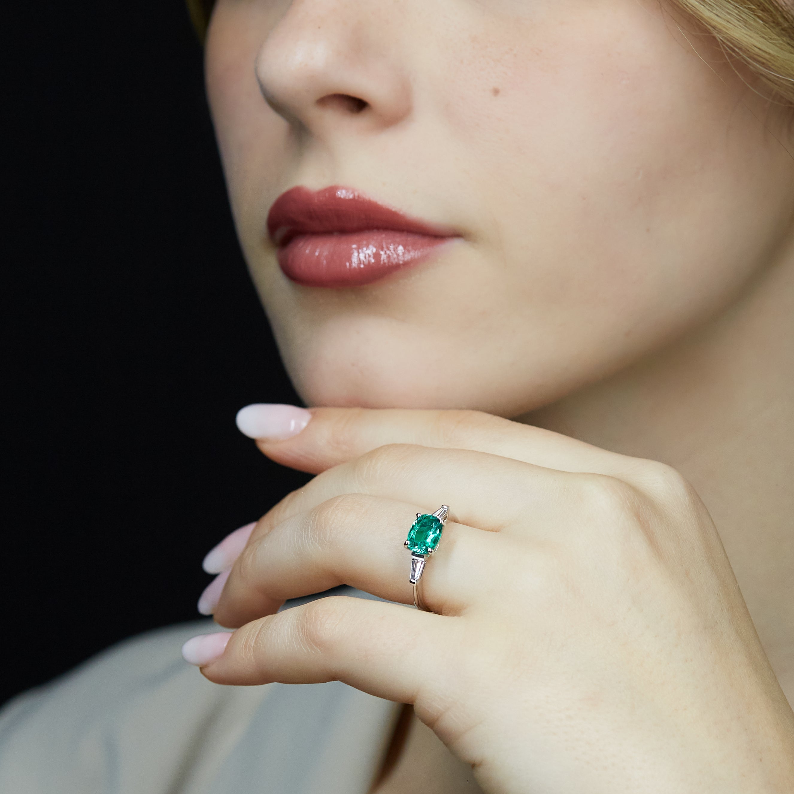 Anello in oro bianco 18 kt impreziosito da uno Smeraldo Lab-Grown taglio ovale da 1,32 carati, affiancato da due diamanti Lab-Grown taglio taper per un totale di 0,29 carati, selezionati per colore E/F e purezza VS.