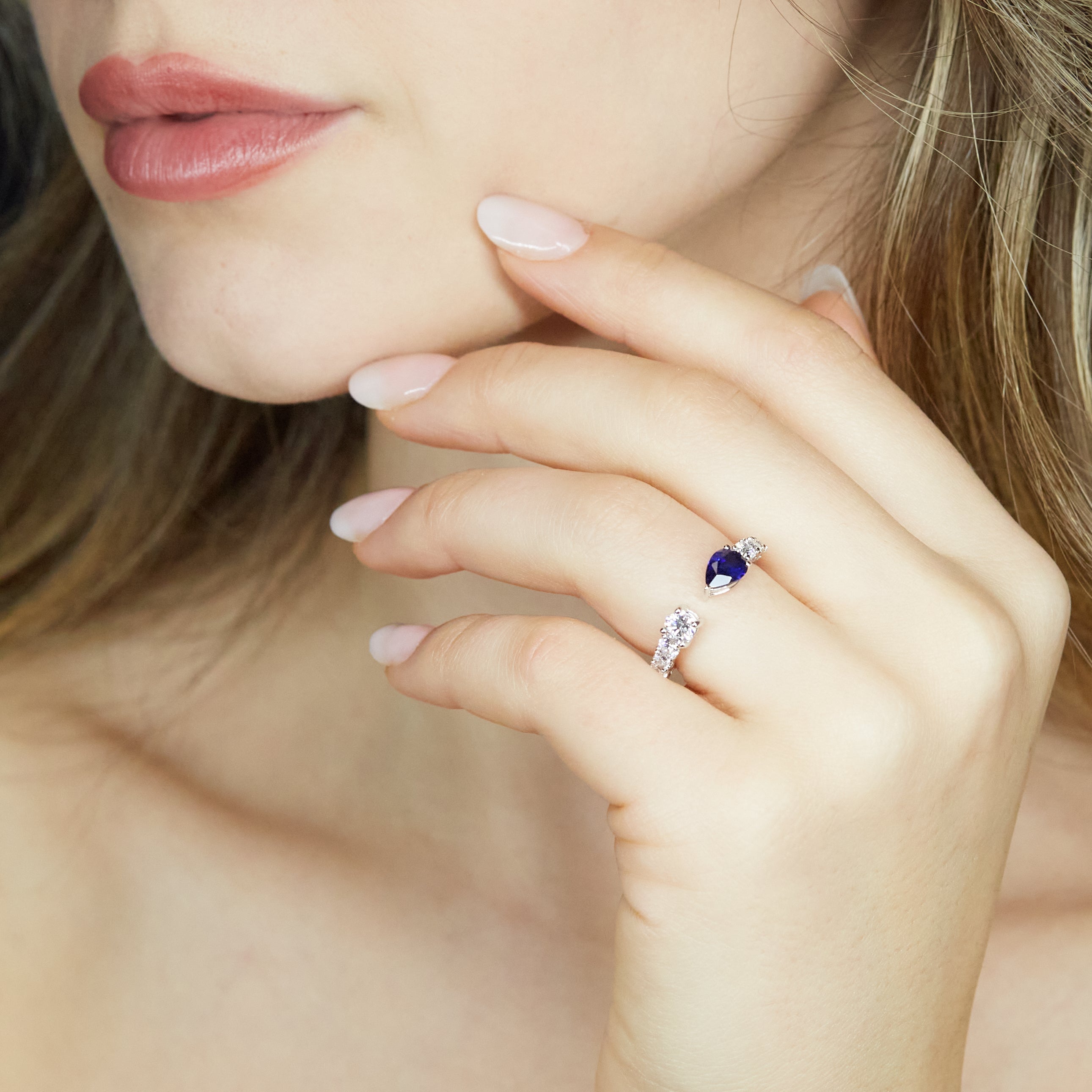Anello aperto in oro bianco 18 kt con zaffiro Lab-Grown taglio goccia da 0,92 carati e diamanti Lab-Grown taglio brillante per un totale di 0,75 carati.