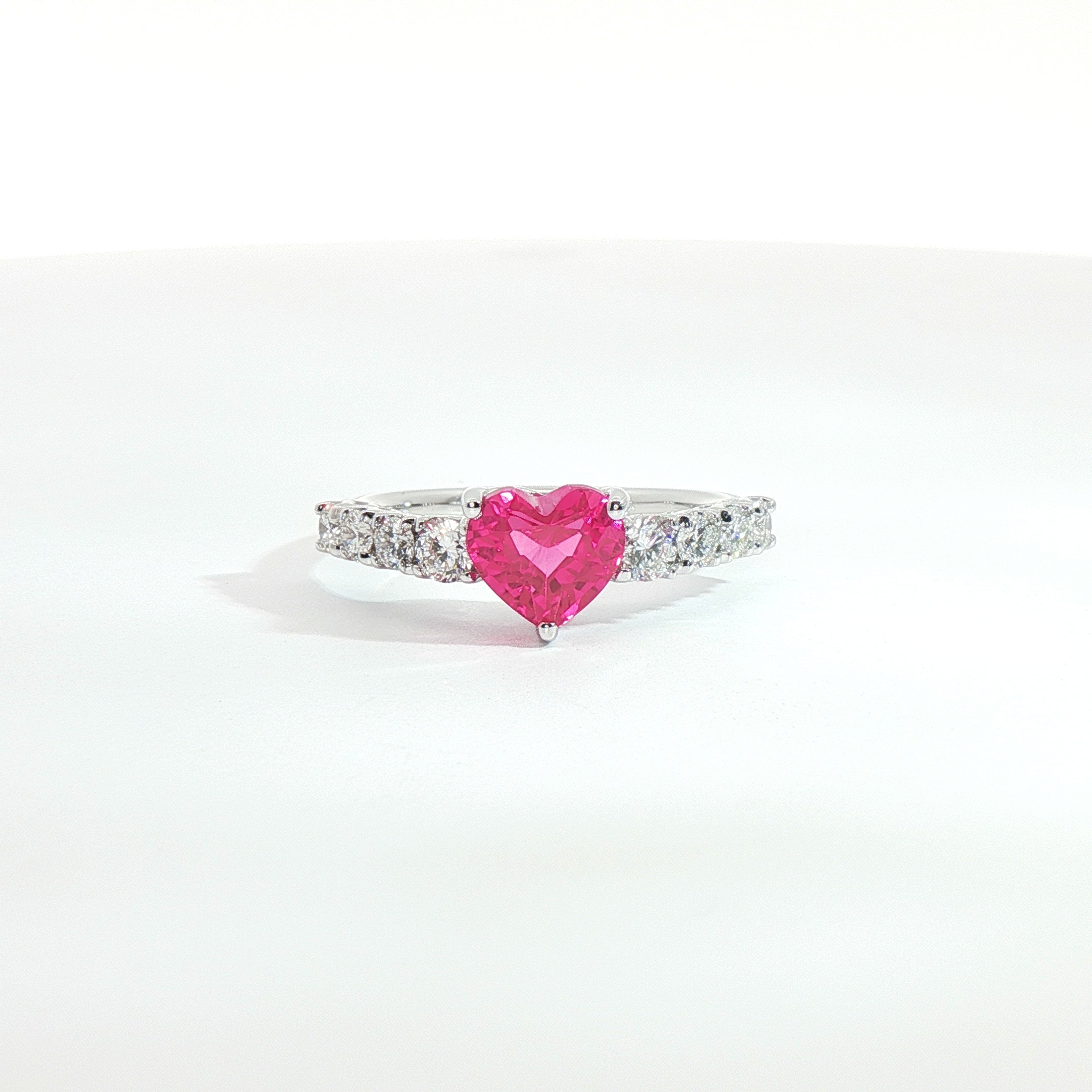 Un cuore rosa intenso e brillante si fa protagonista in questo anello in oro bianco 18kt, impreziosito da uno zaffiro rosa Lab-Grown taglio cuore da 1,50 carati, incastonato per valorizzare la delicatezza della forma e la vivacità della tonalità.