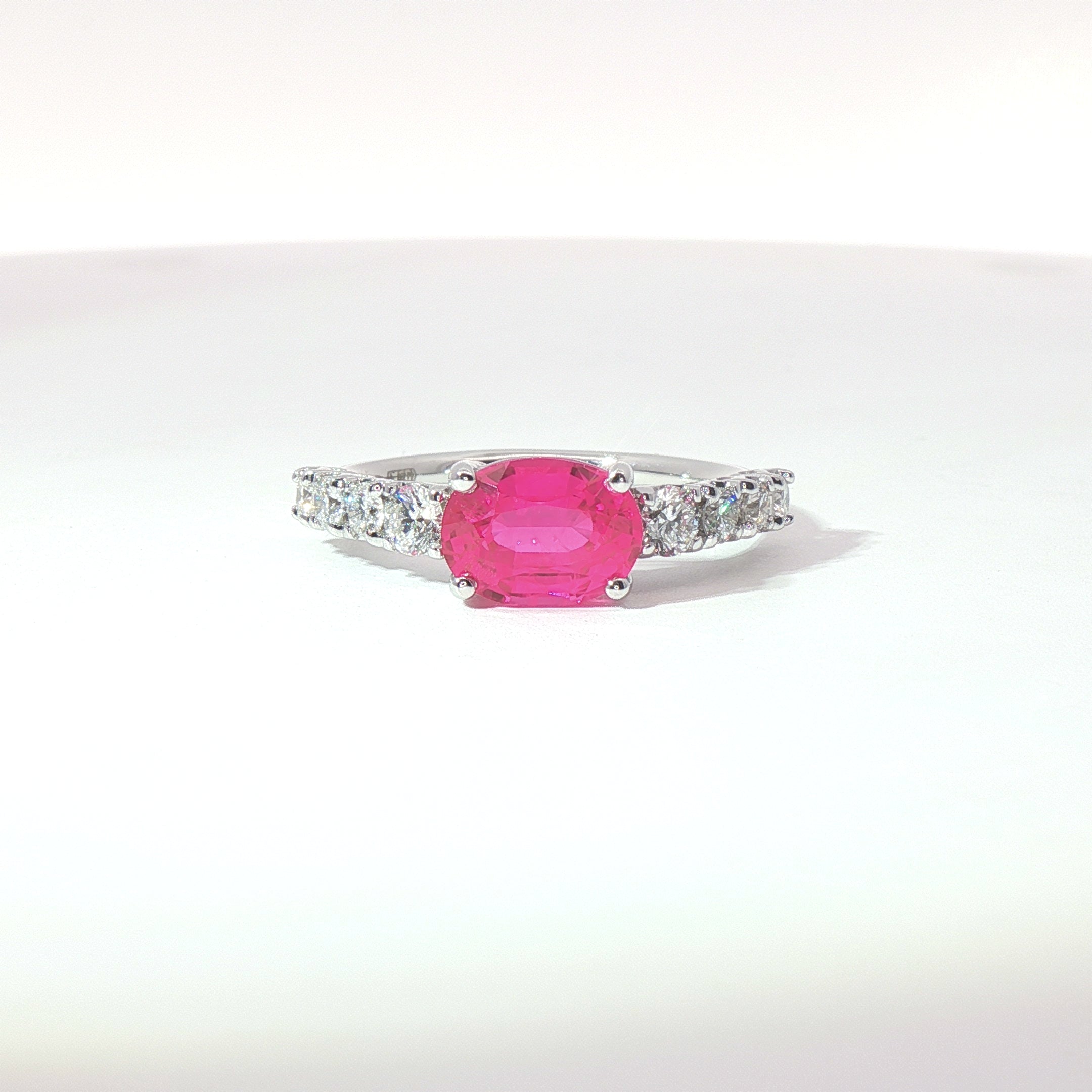 Anello in oro bianco 18 kt con zaffiro rosa Lab-Grown taglio ovale e diamanti Lab-Grown taglio brillante.