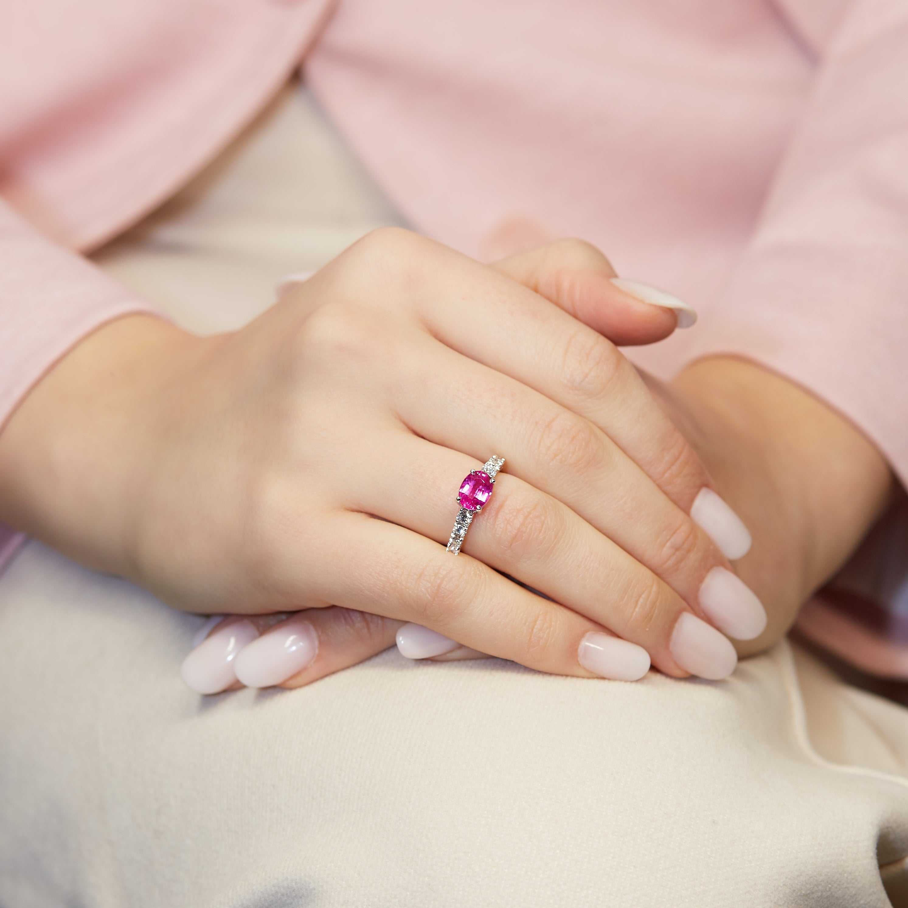 Al centro, uno zaffiro rosa Lab-Grown taglio ovale da 1,90 carati sprigiona un’intensa tonalità di rosa, accompagnato da quattro diamanti Lab-Grown a scalare per un totale di 0,50 carati, disposti con equilibrio per valorizzare la gemma principale.