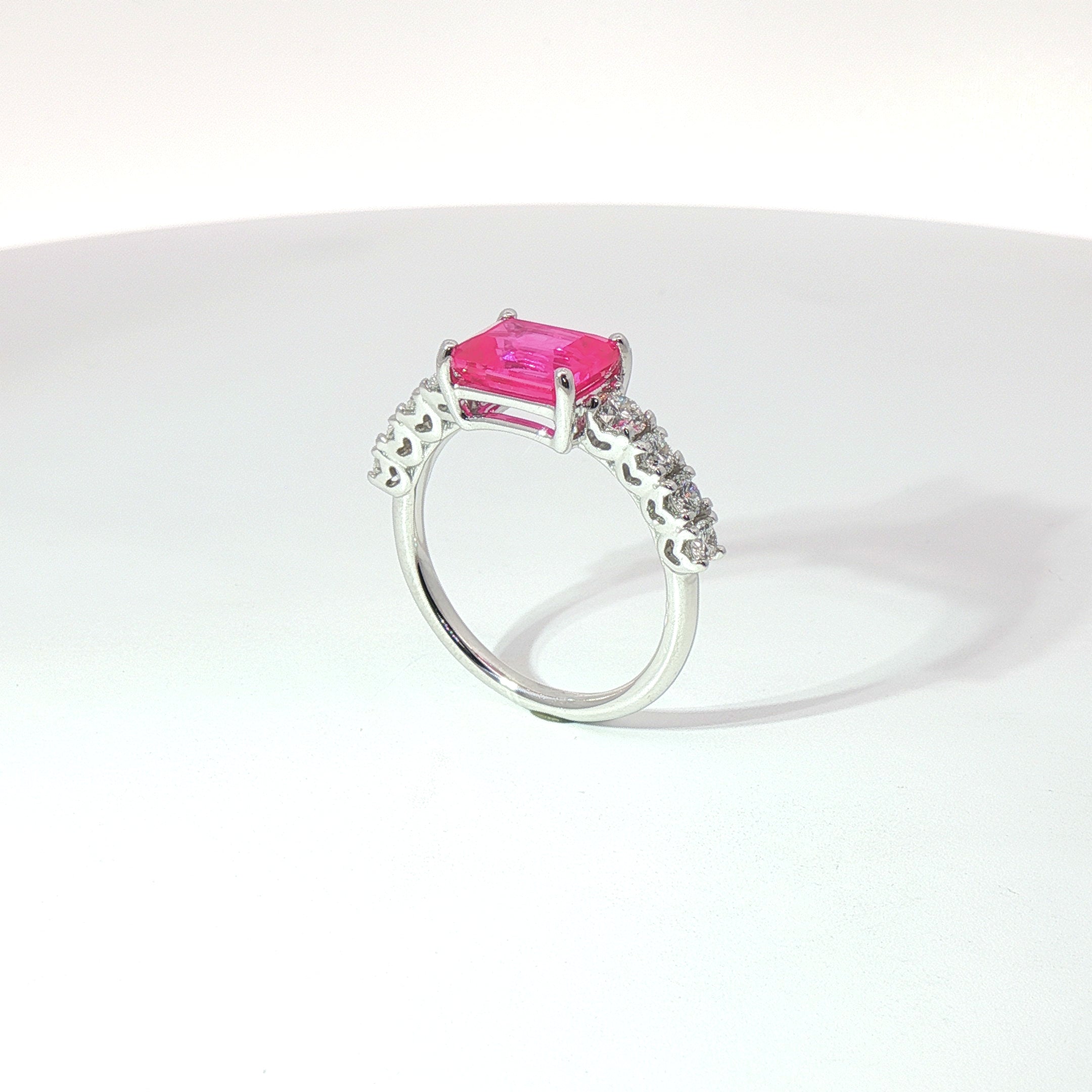 Anello in oro bianco 18 kt con zaffiro rosa Lab-Grown taglio smeraldo e diamanti Lab-Grown taglio brillante.