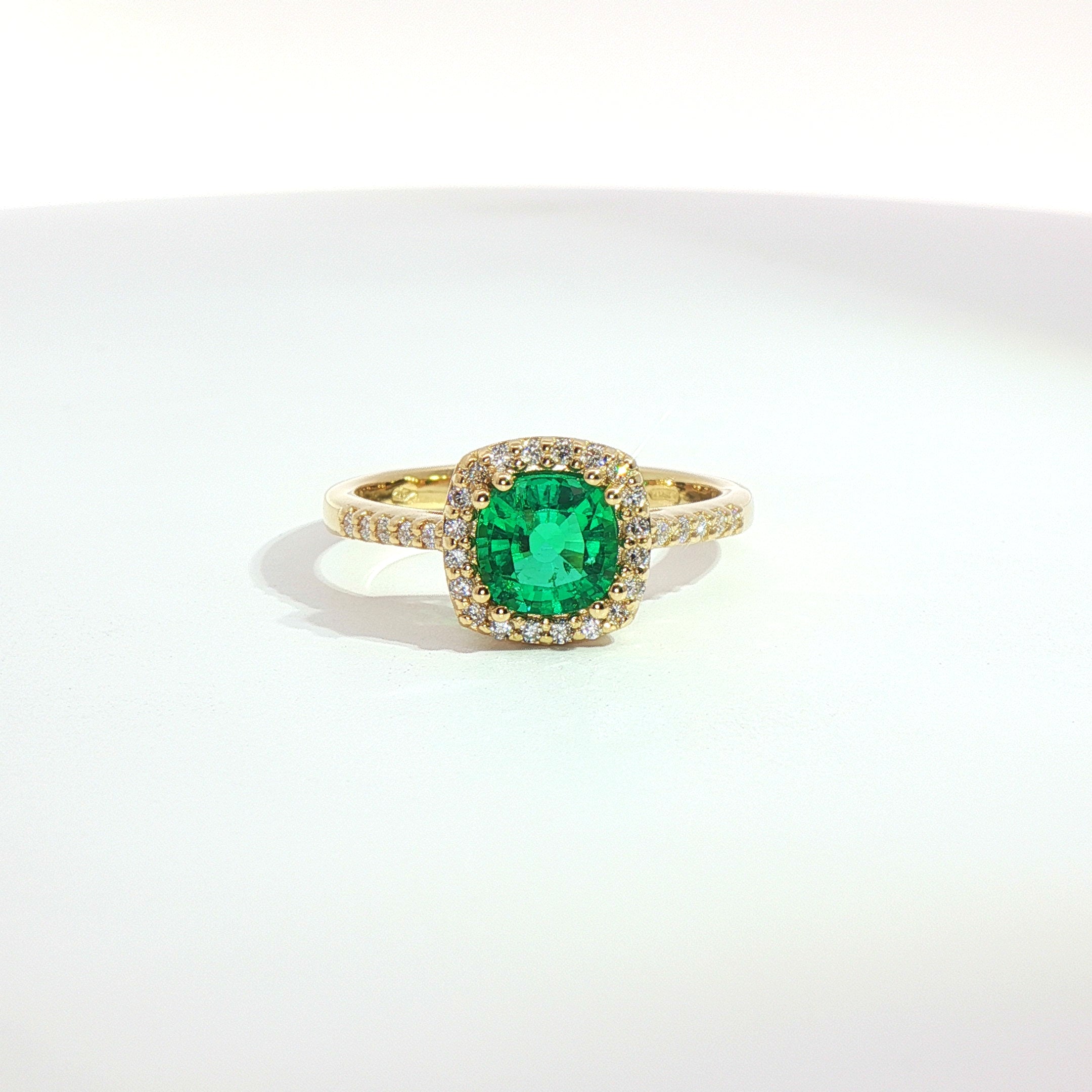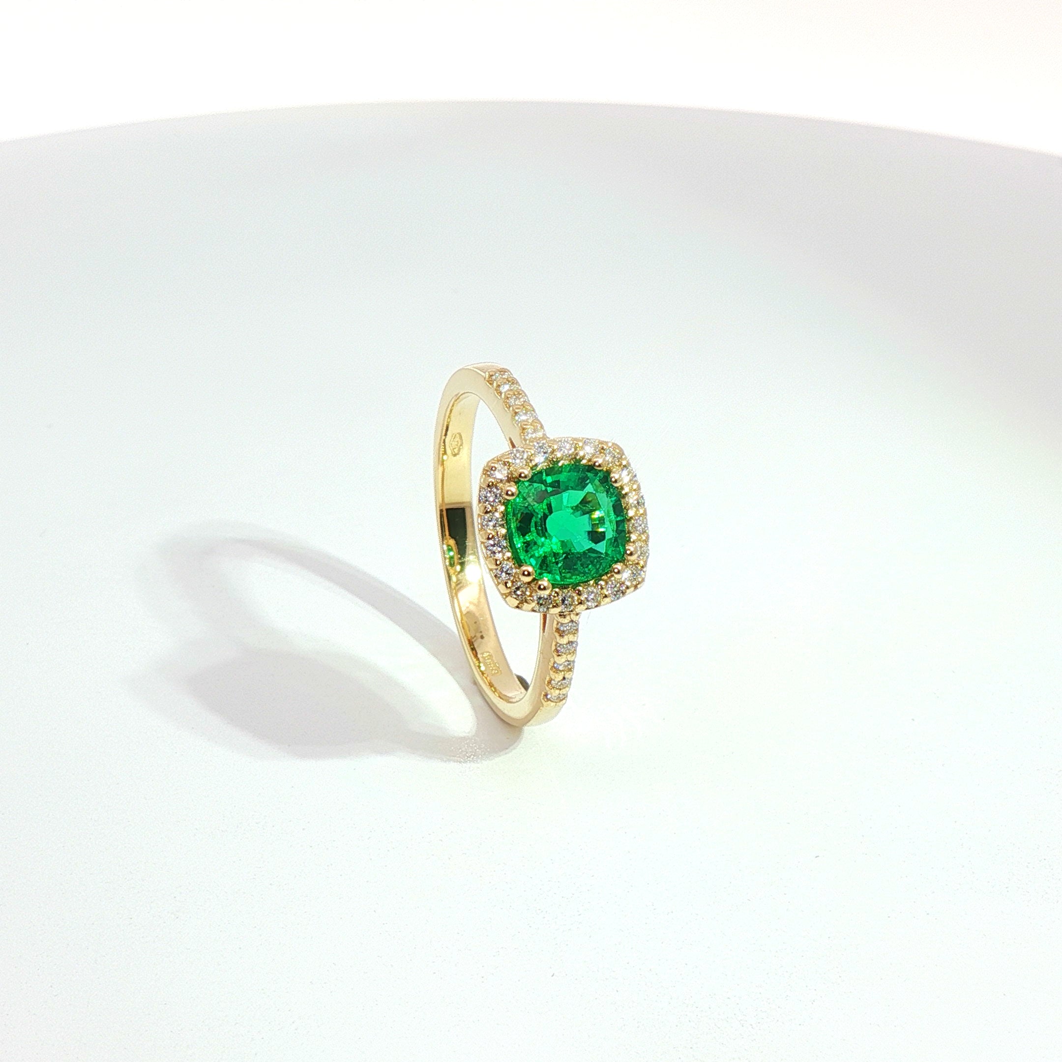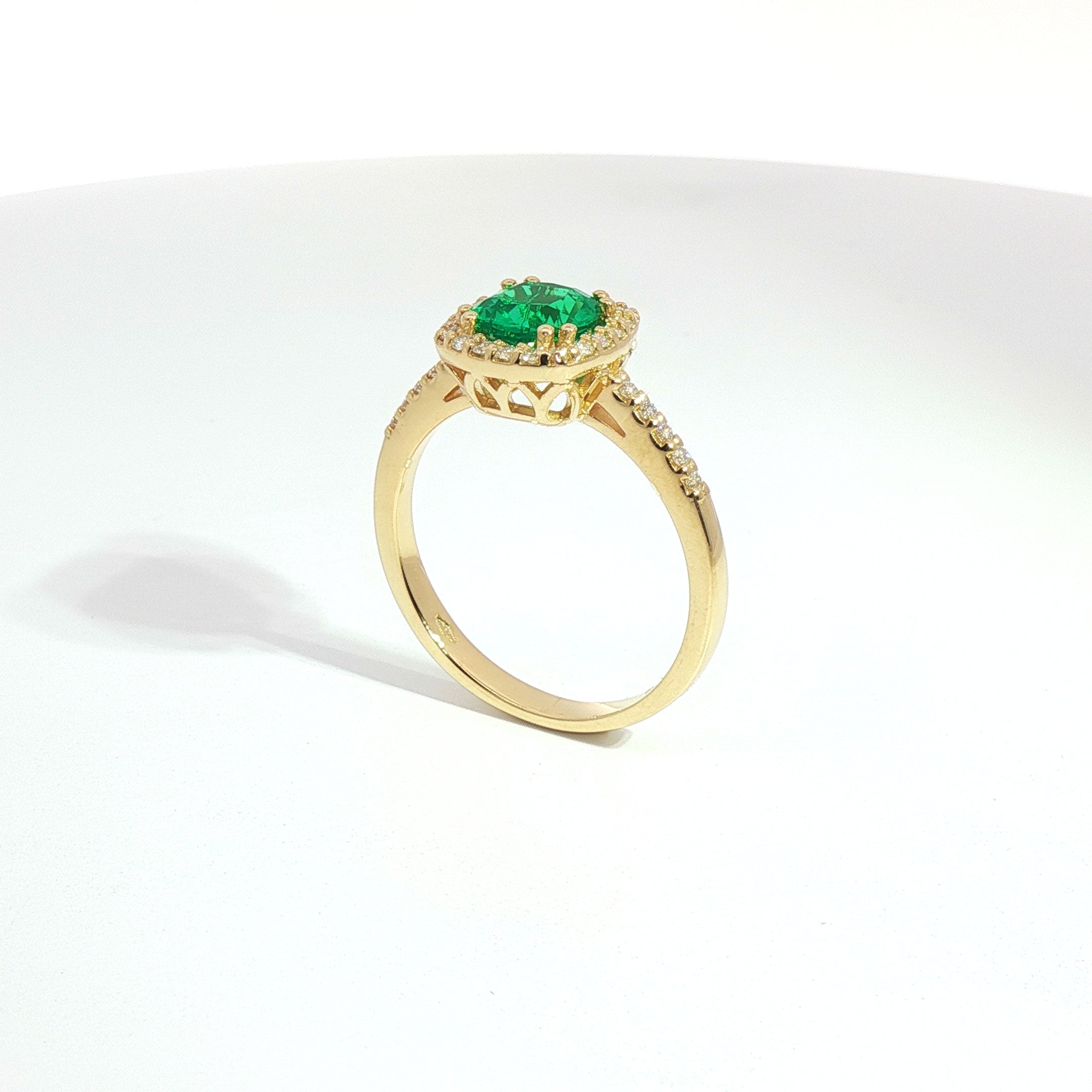 Anello in oro giallo 18kt con smeraldo Lab-Grown taglio cuscino da 0,82 carati al centro, incorniciato da 20 diamanti Lab-Grown taglio brillante. Lungo il gambo, 10 diamanti aggiuntivi (5 per lato) accompagnano il profilo dell’anello, portando la caratura totale dei diamanti a 0,23 carati, tutti selezionati per colore E/F e purezza VS.