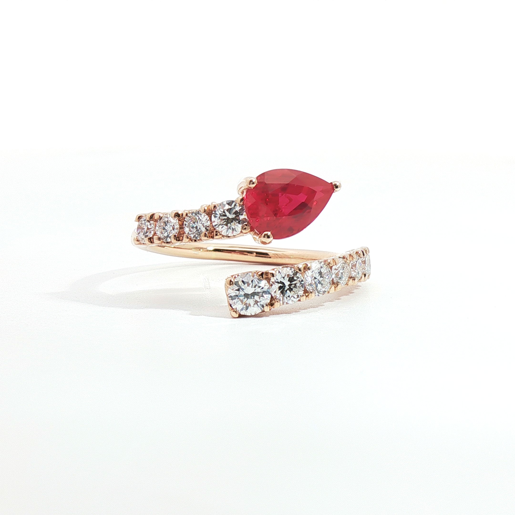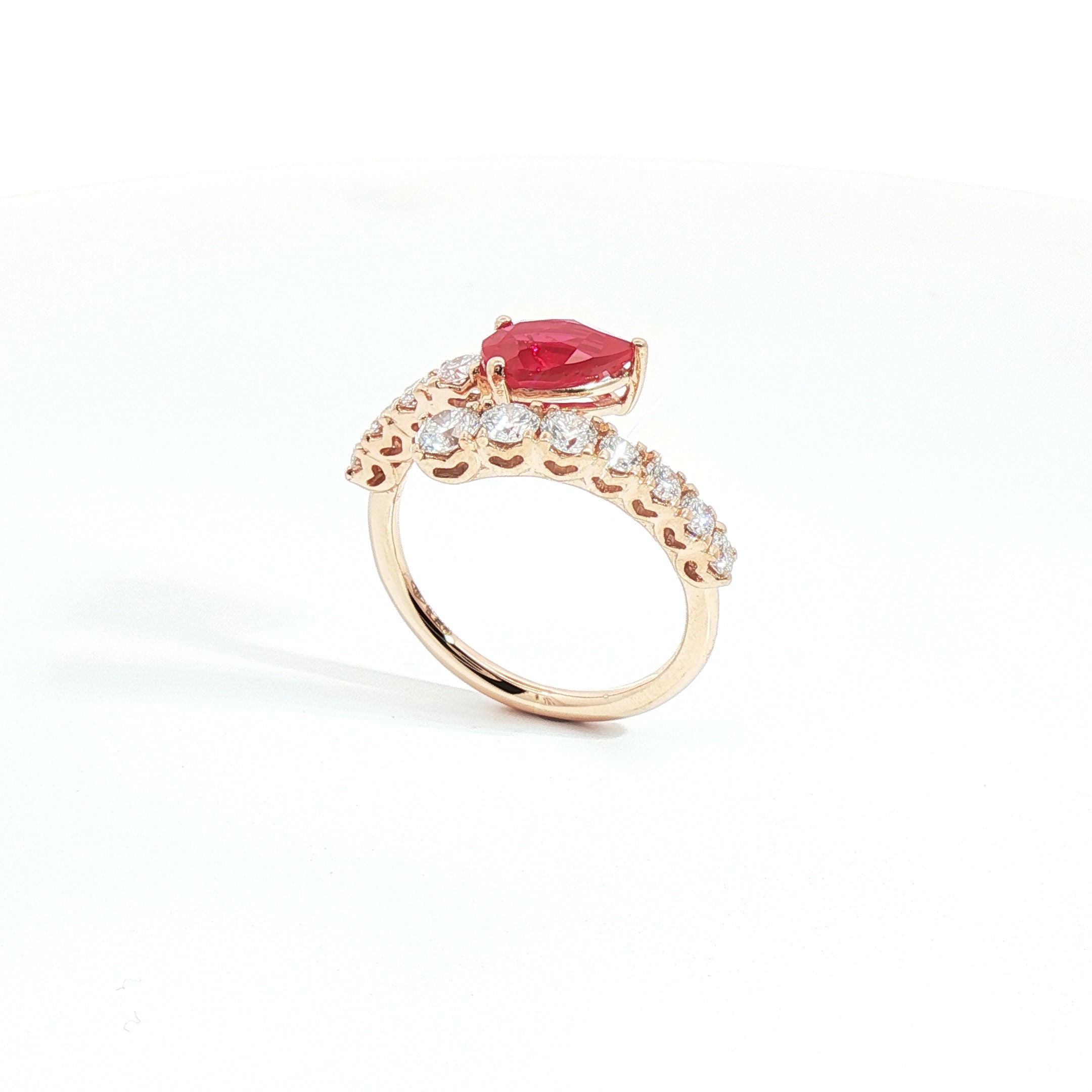 Protagonista della creazione è un rubino Lab-Grown taglio goccia da 1,42 carati, dal colore rosso intenso e profondo, incastonato in modo da catturare la luce da ogni angolazione. Il design, fluido e armonioso, valorizza il movimento naturale del gioiello sul dito.