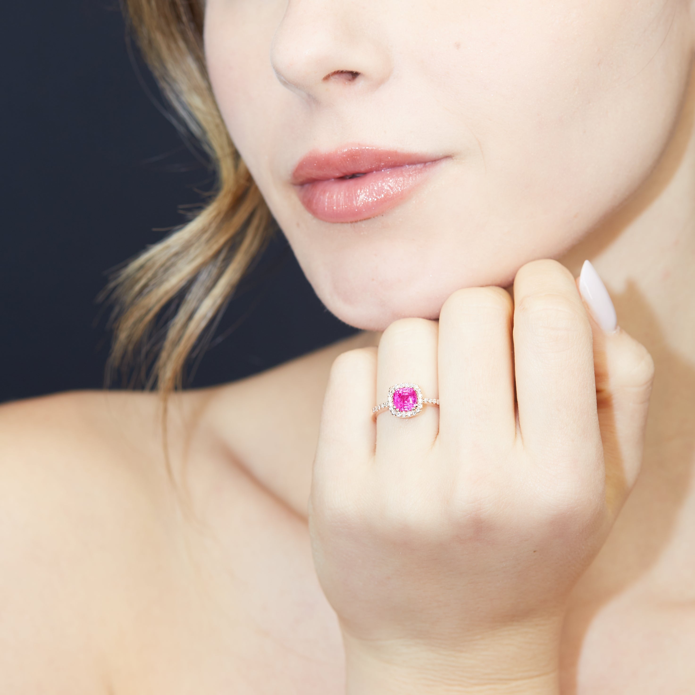 Anello in oro rosa con zaffiro rosa Lab-Grown taglio cuscino e diamanti Lab-Grown taglio brillante.