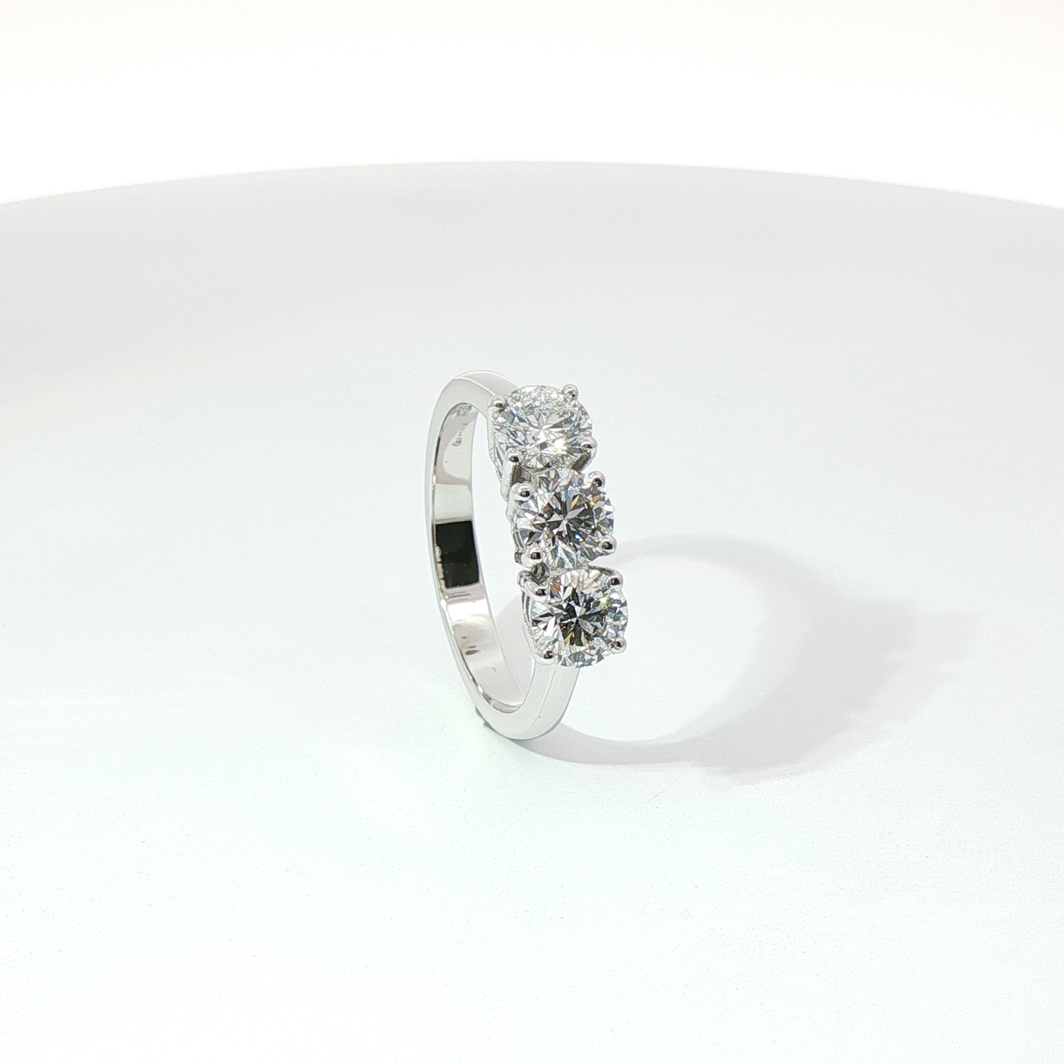 Anello Trilogy in oro bianco 18kt con tre diamanti Lab-Grown taglio brillante da 1,56 carati complessivi, ciascuno certificato IGI per garantire qualità e tracciabilità assoluta.