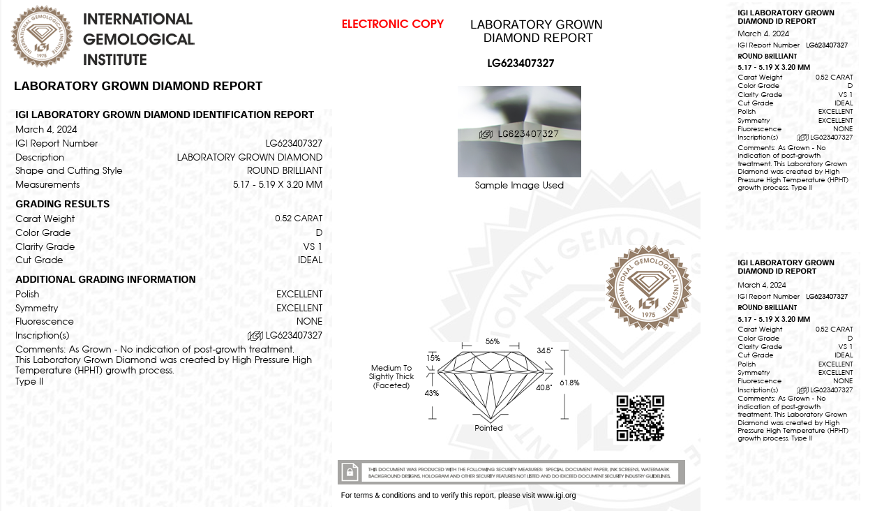 0,52 CERTIFICATO IGI: LG626479406 COLORE D PUREZZA VS1