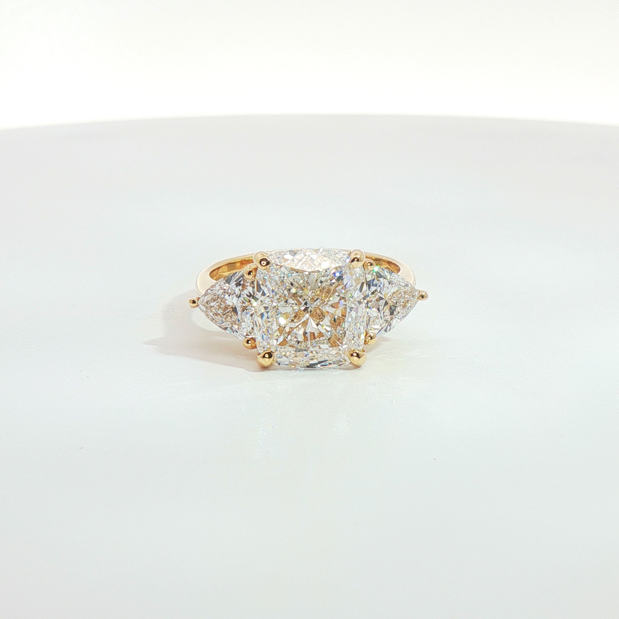 Luce e proporzioni si fondono in perfetto equilibrio in questo anello trilogy in oro giallo 18kt, costruito attorno a un sontuoso diamante Lab-Grown taglio cuscino da 5,02 carati, certificato IGI.
