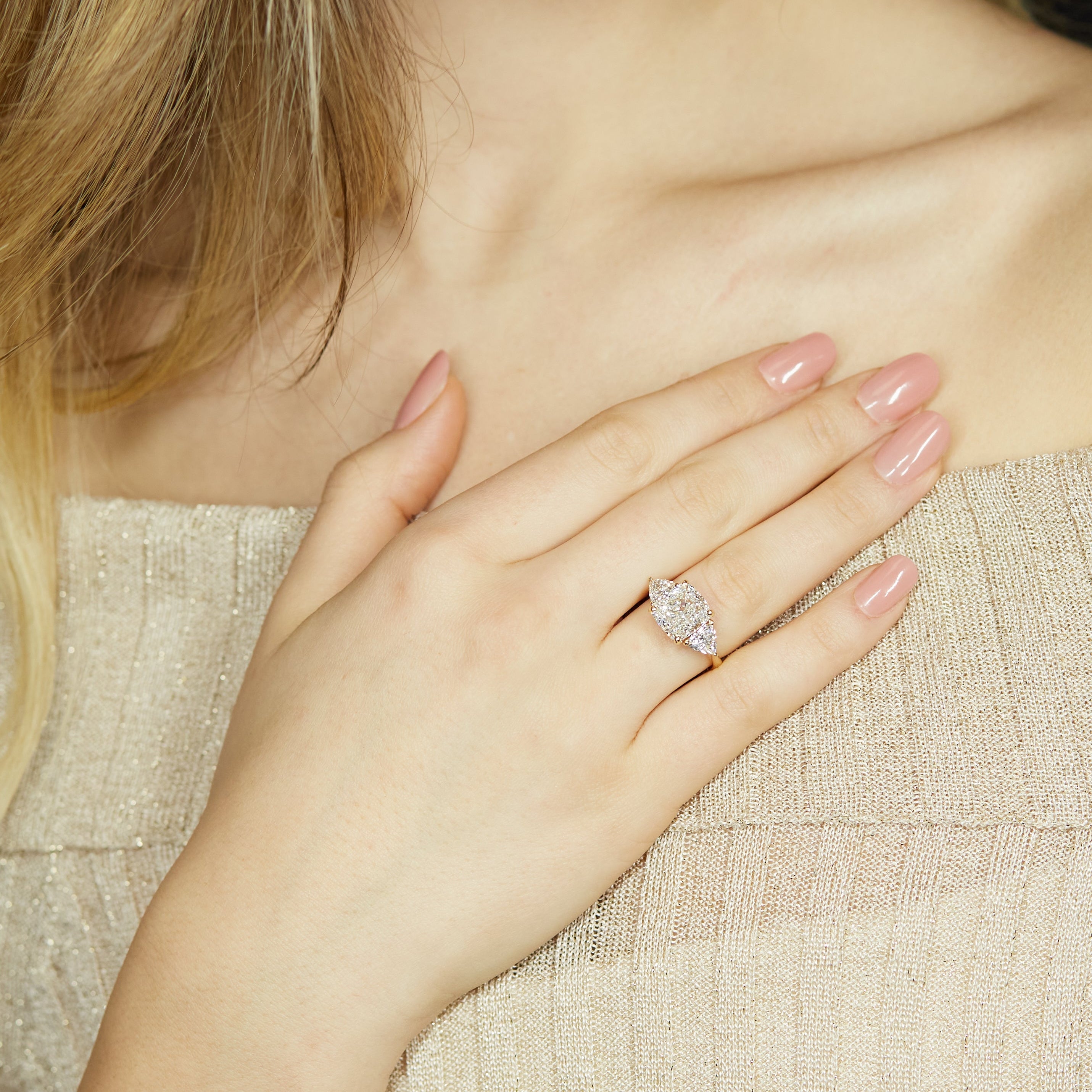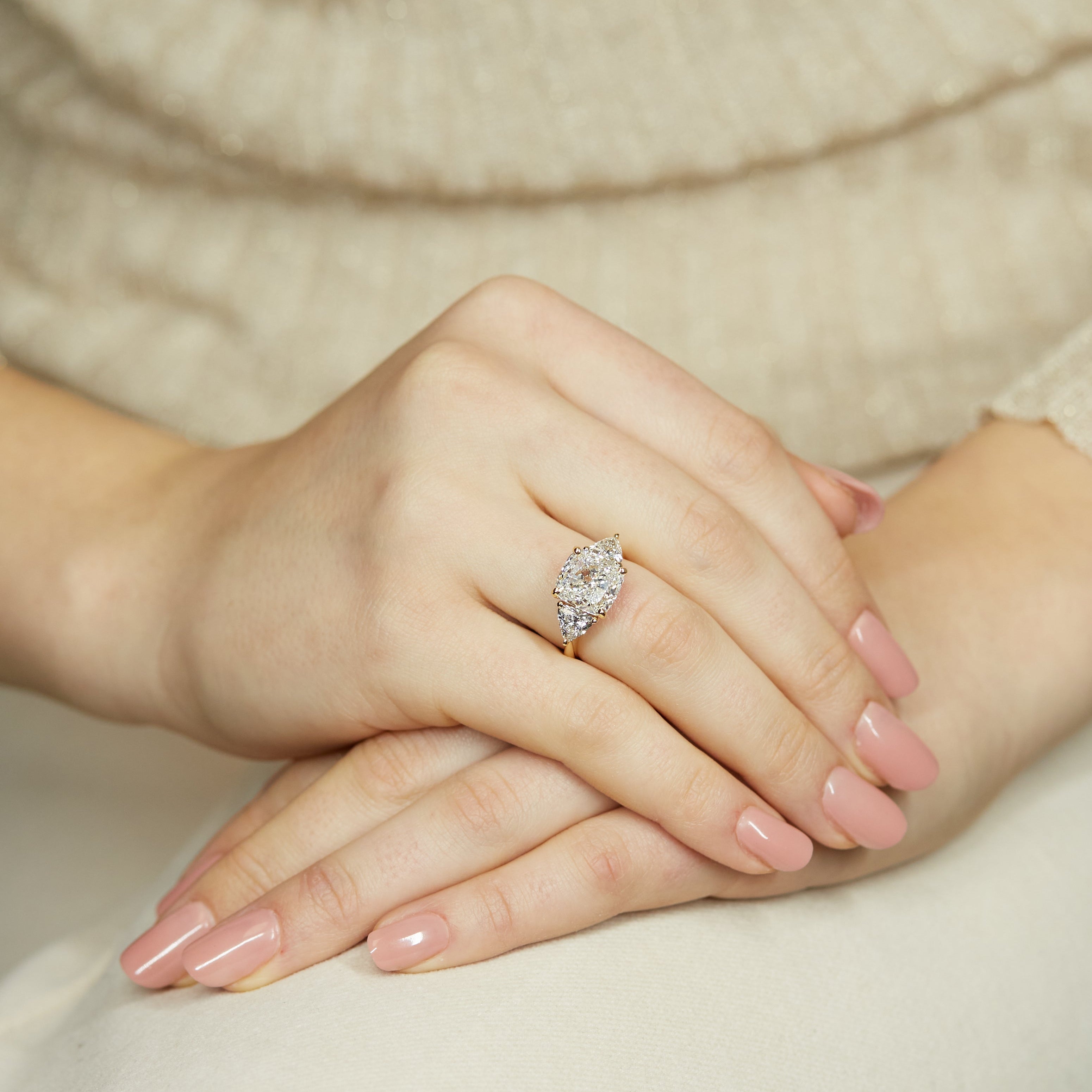 La pietra centrale, imponente per caratura e brillantezza, è accompagnata da due diamanti Lab-Grown taglio trillion per un totale di 1,41 carati, selezionati per colore E/F e purezza VS.
