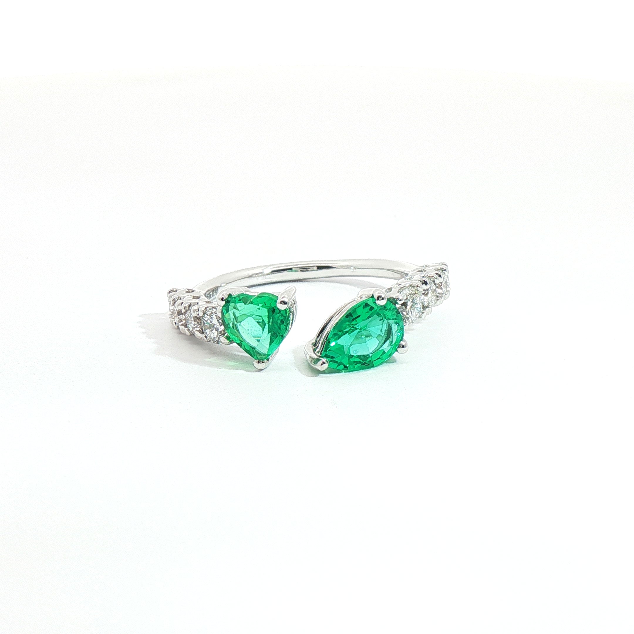 Realizzato in oro bianco 18kt, questo anello Twin si ispira alla forma del contrarié e celebra l’armonia delle differenze con due protagonisti assoluti: uno smeraldo Lab-Grown taglio cuore e uno smeraldo Lab-Grown taglio goccia, per un peso complessivo di 1,15 carati.