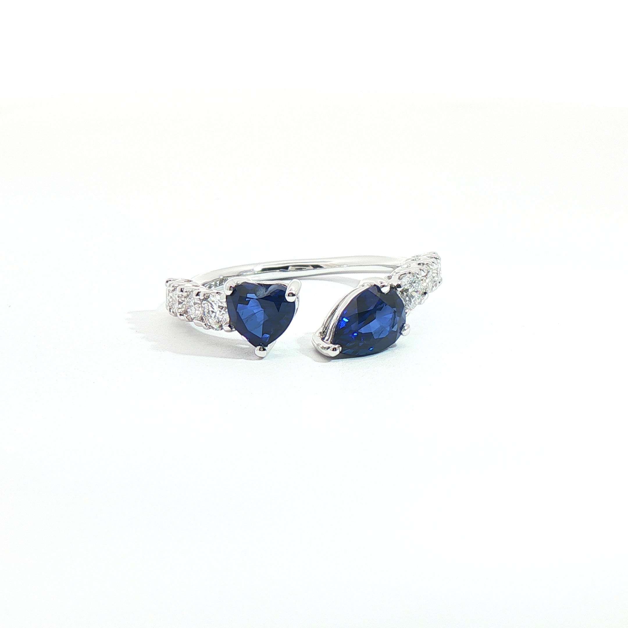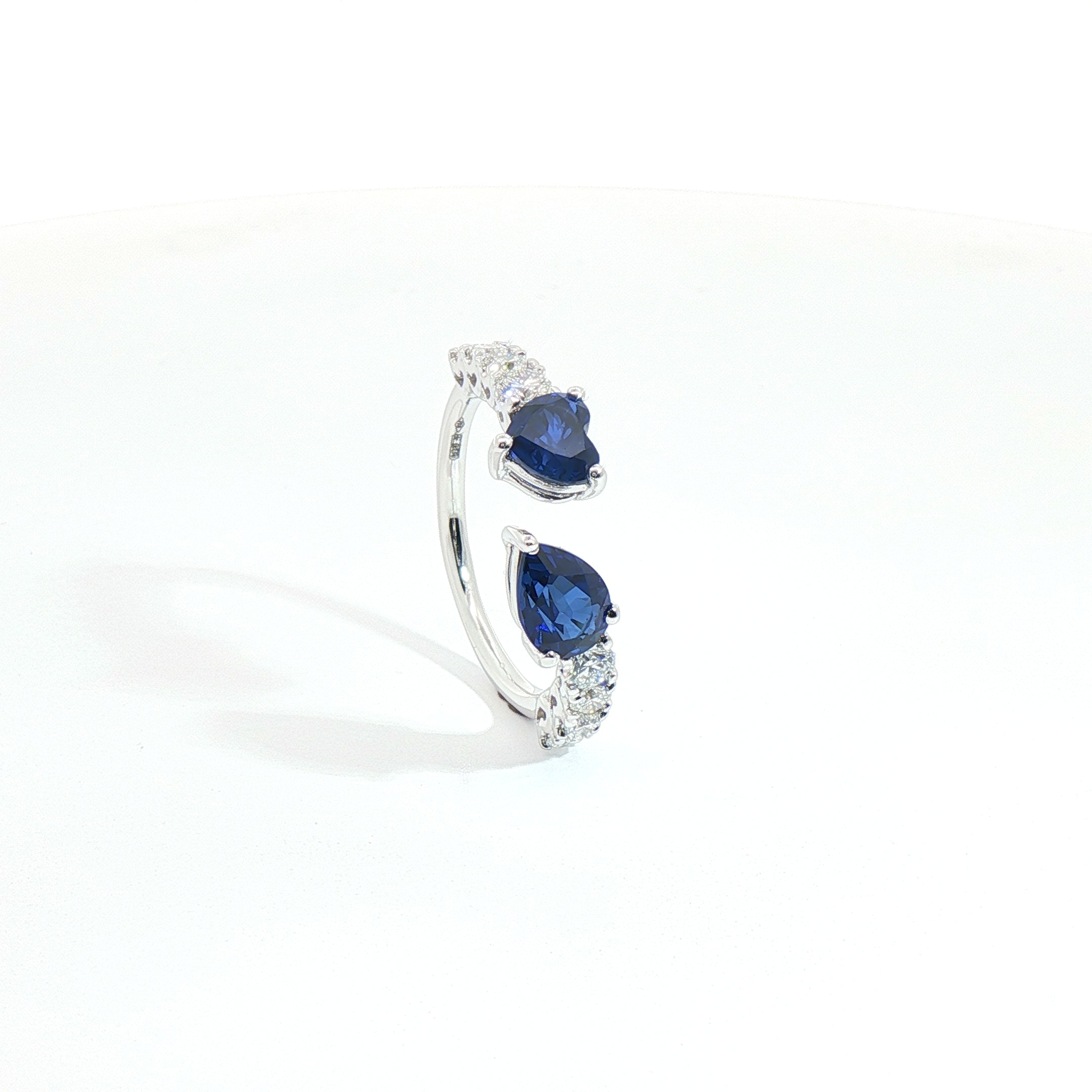 Protagonisti del gioiello sono uno zaffiro Lab-Grown taglio cuore e uno zaffiro Lab-Grown taglio goccia, per un peso complessivo di 1,68 carati, dal blu profondo e magnetico. Le due pietre, pur differenti nella forma, si bilanciano in un abbraccio asimmetrico ma perfettamente equilibrato.