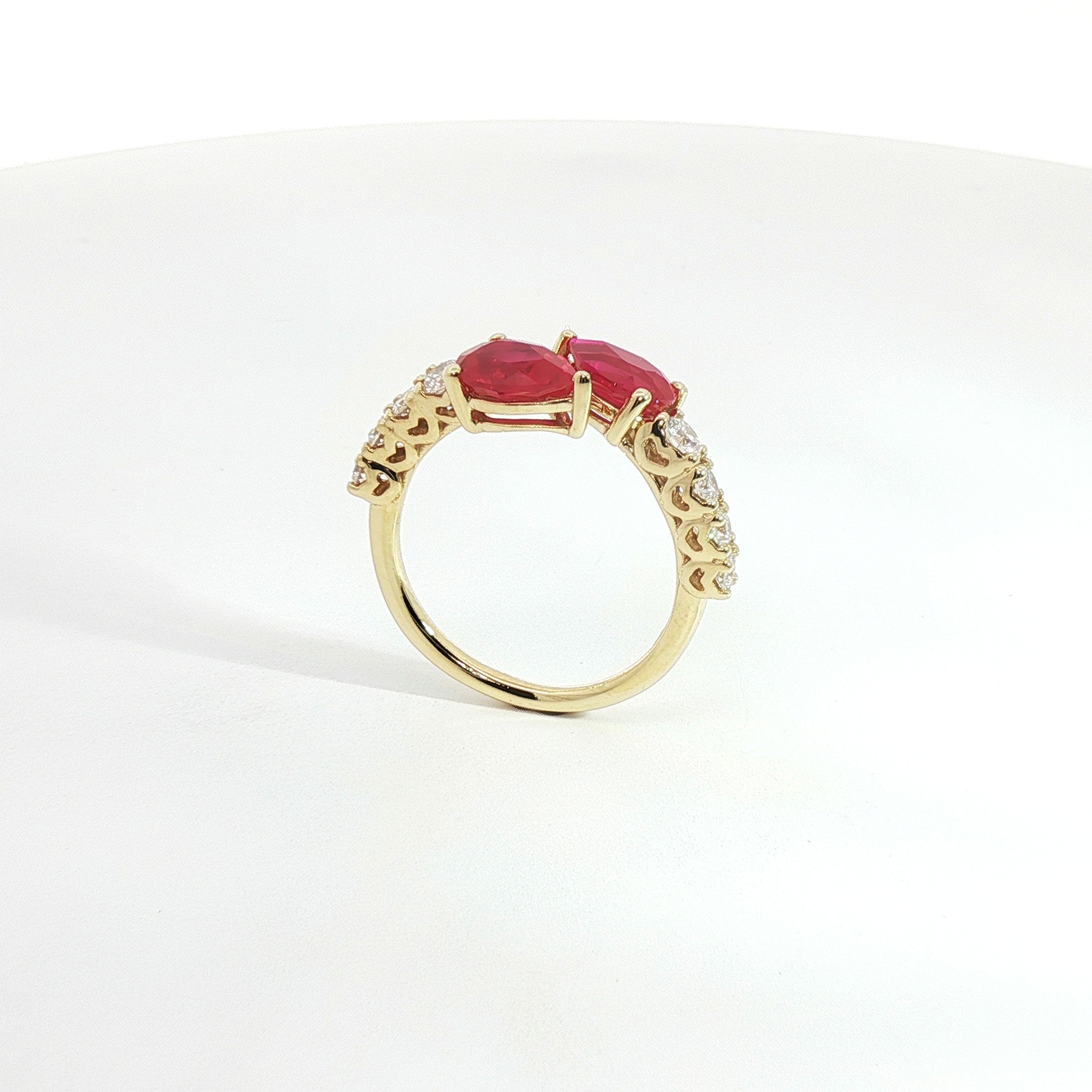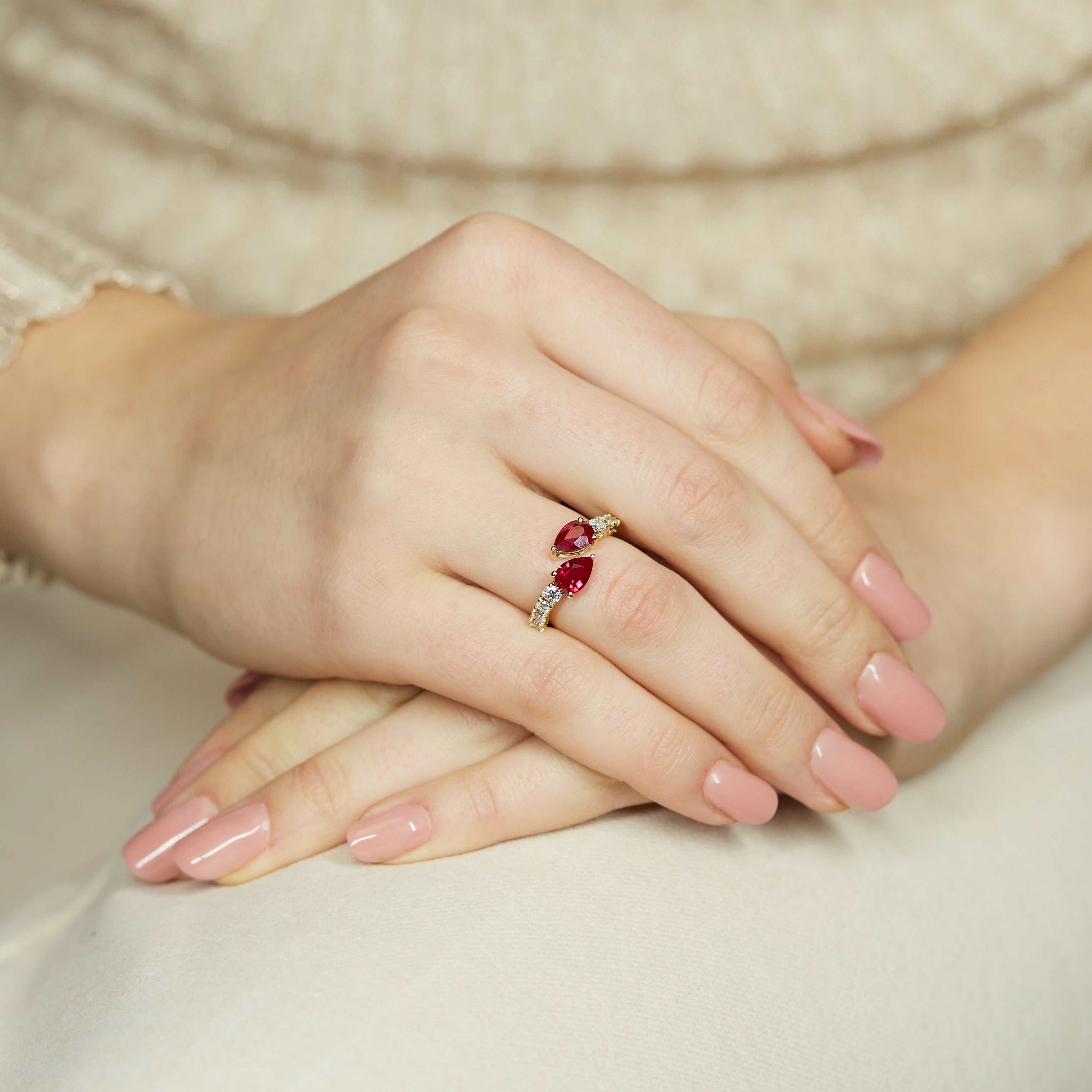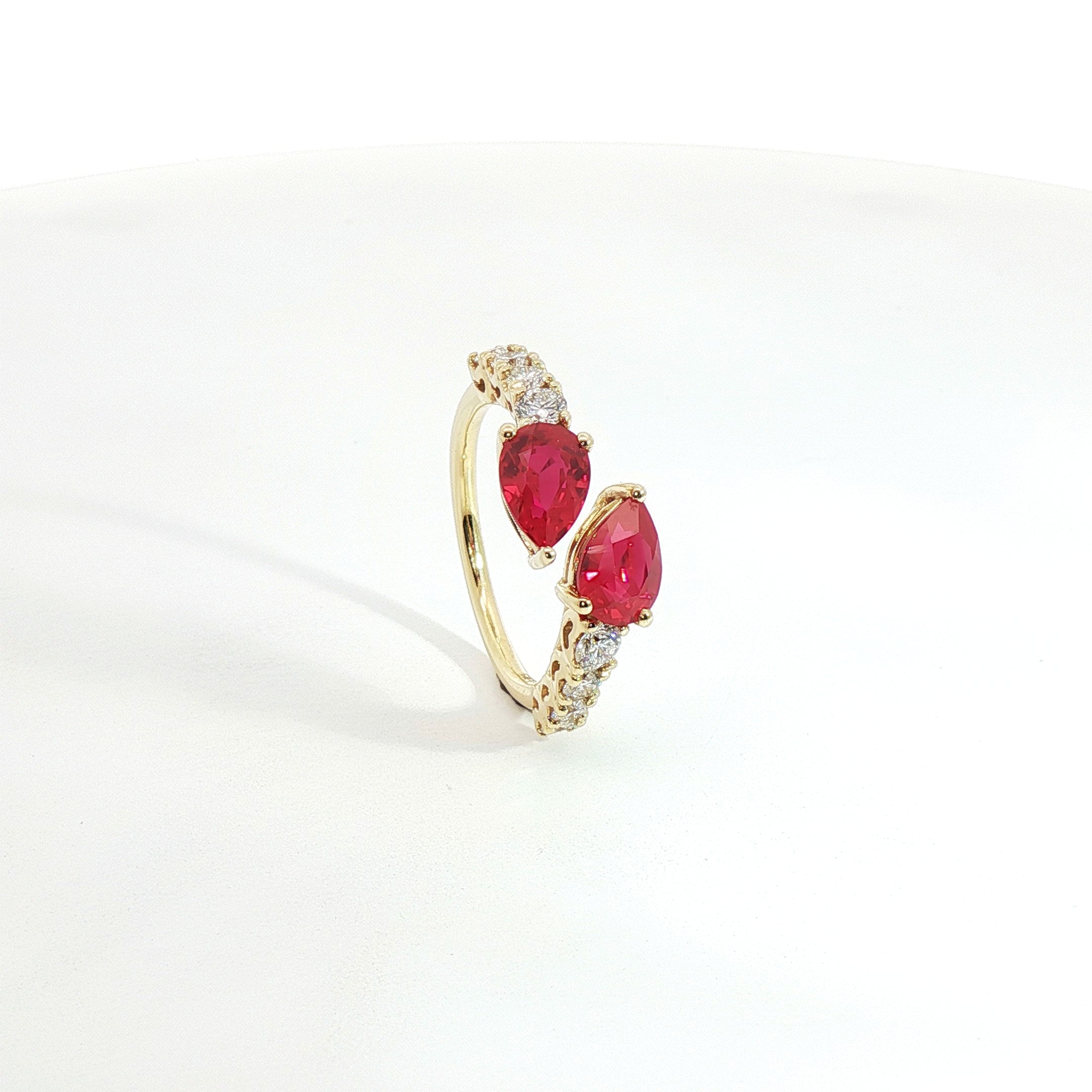 Anello Twin in oro giallo con rubini Lab-Grown taglio goccia e diamanti Lab-Grown taglio brillante.