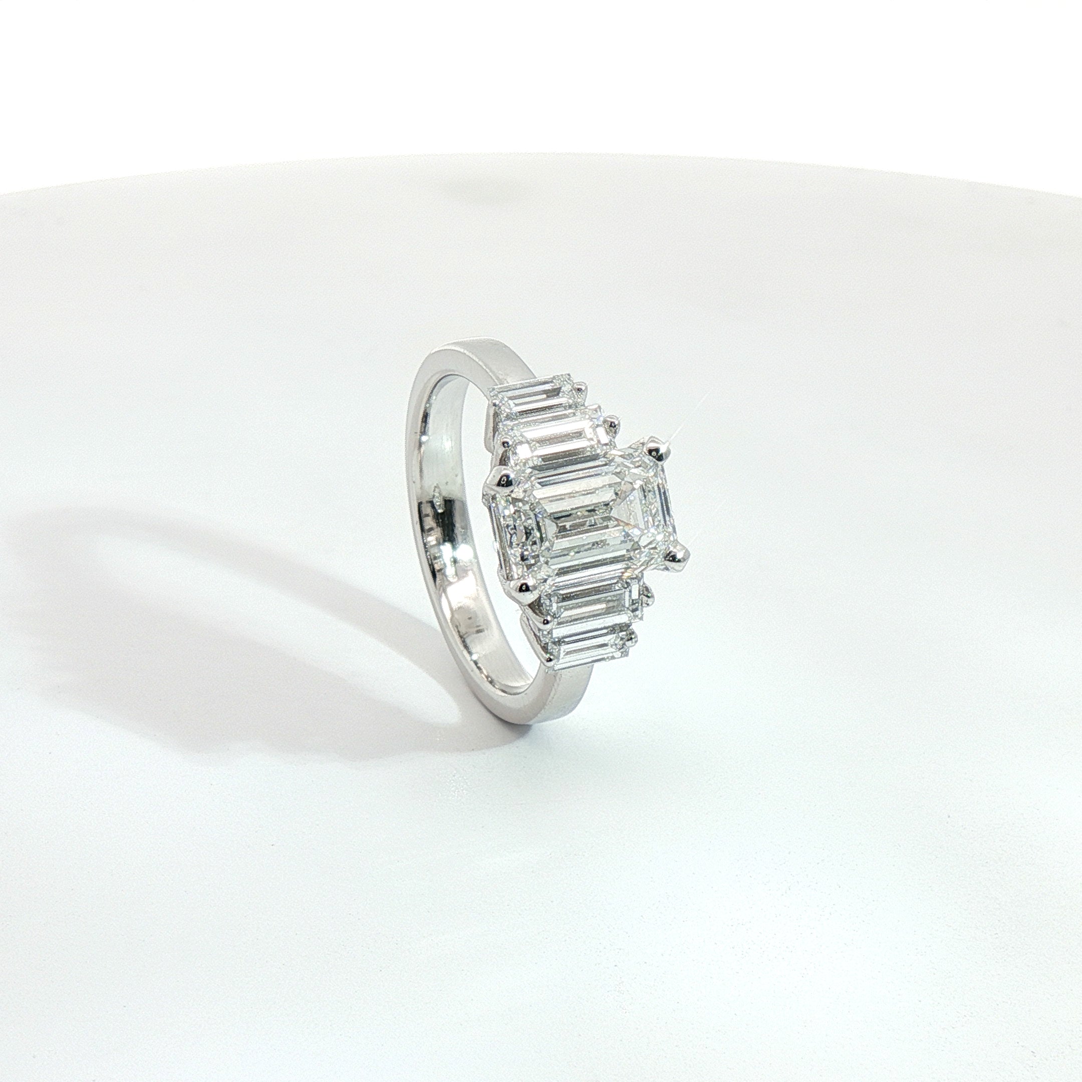 Ai lati, una sequenza di 4 diamanti Lab-Grown taglio smeraldo (2 per lato) dal taglio calibrato e dalla grandezza a scalare, per un totale di 0,92 carati, selezionati per colore E/F e purezza VS. La composizione genera un effetto visivo ordinato ma dinamico, esaltando la geometria del taglio smeraldo e amplificando la brillantezza lungo tutto il fronte dell’anello.