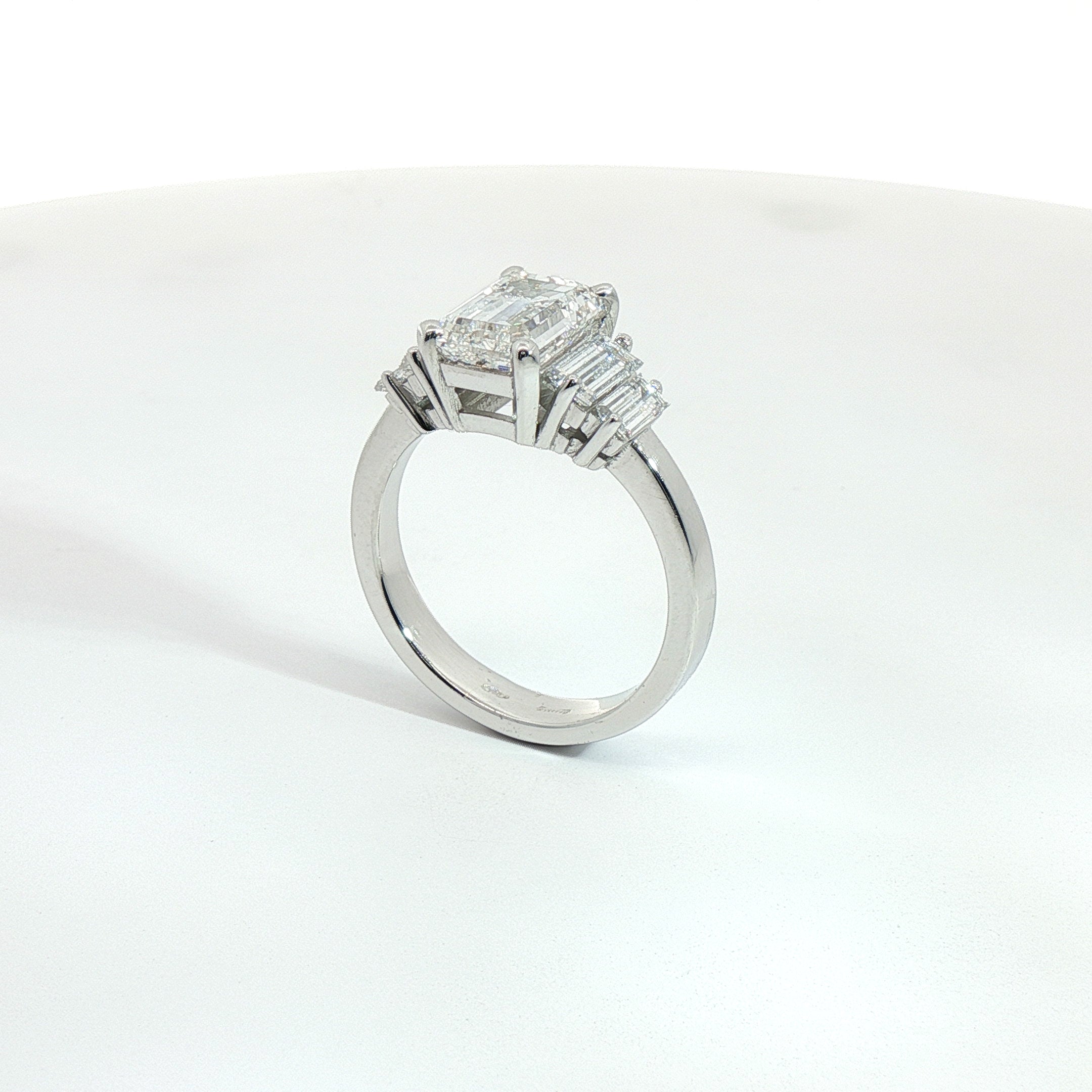 Un equilibrio perfetto tra simmetria e carattere definisce questa fedina in oro bianco 18kt, costruita attorno a un diamante Lab-Grown taglio smeraldo da 2,46 carati, protagonista centrale, accompagnato da certificazione internazionale IGI.