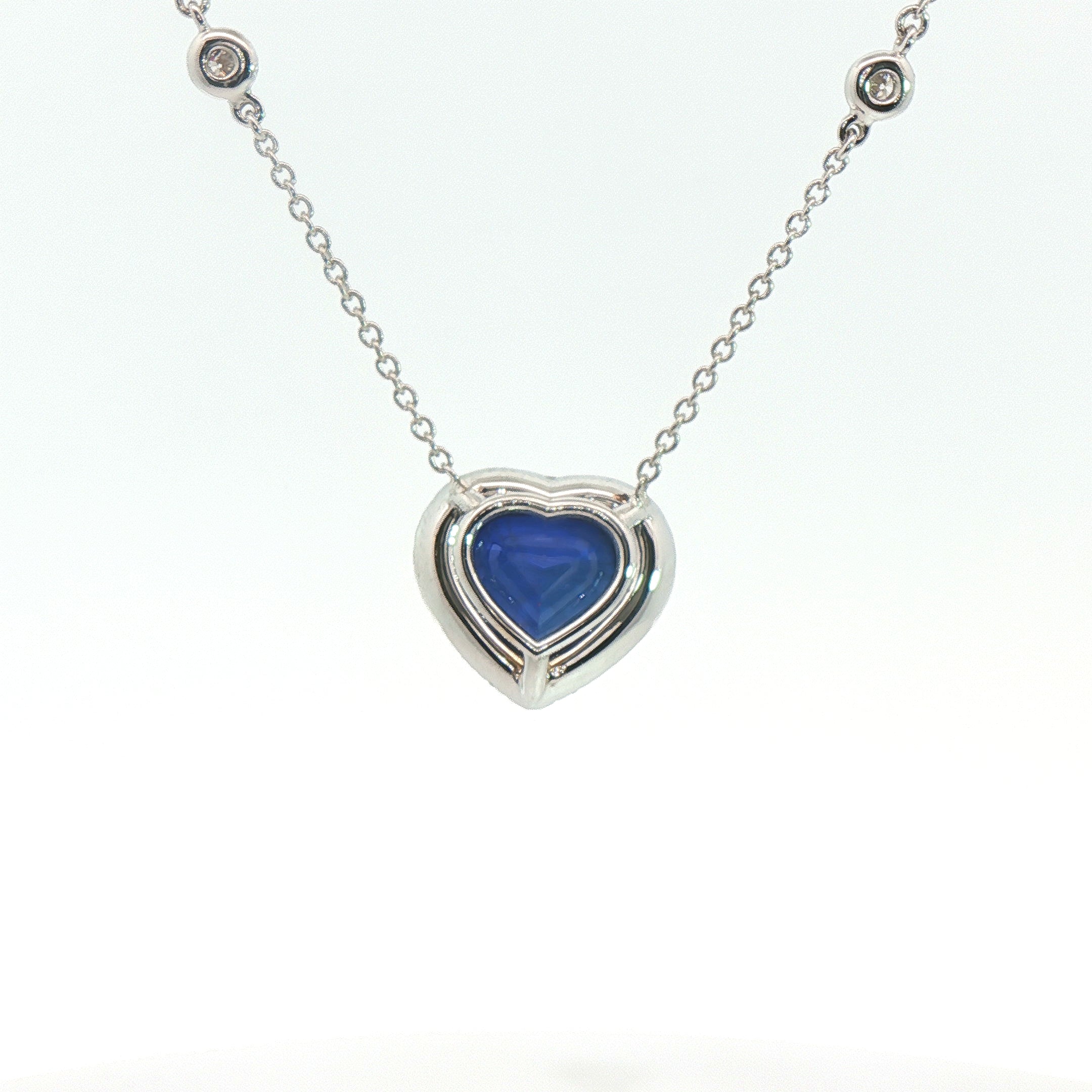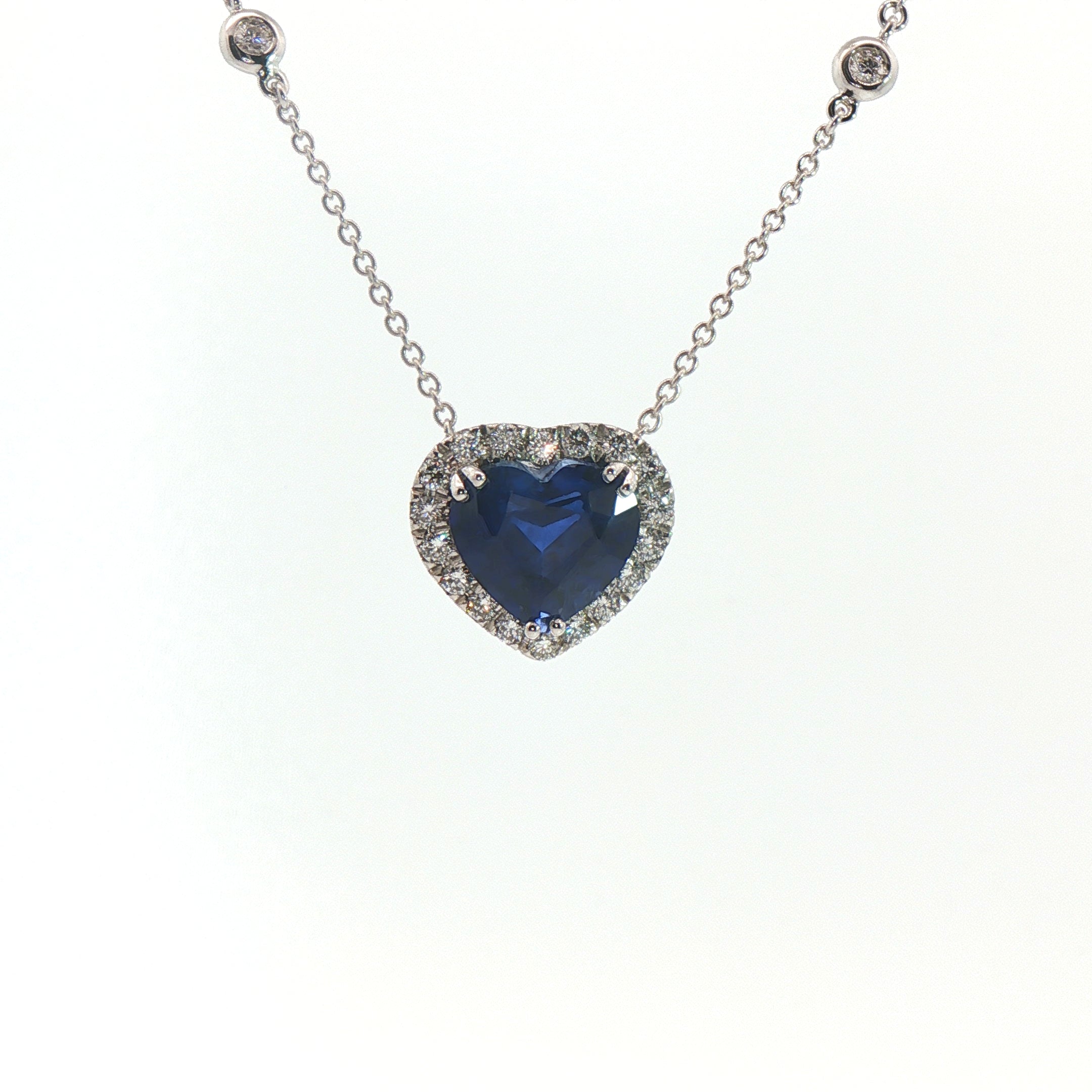 Realizzato in oro bianco 18kt, questo girocollo è dominato da un zaffiro Lab-Grown taglio cuore da 4,00 carati,  dal blu intenso che richiama la profondità dell’oceano.