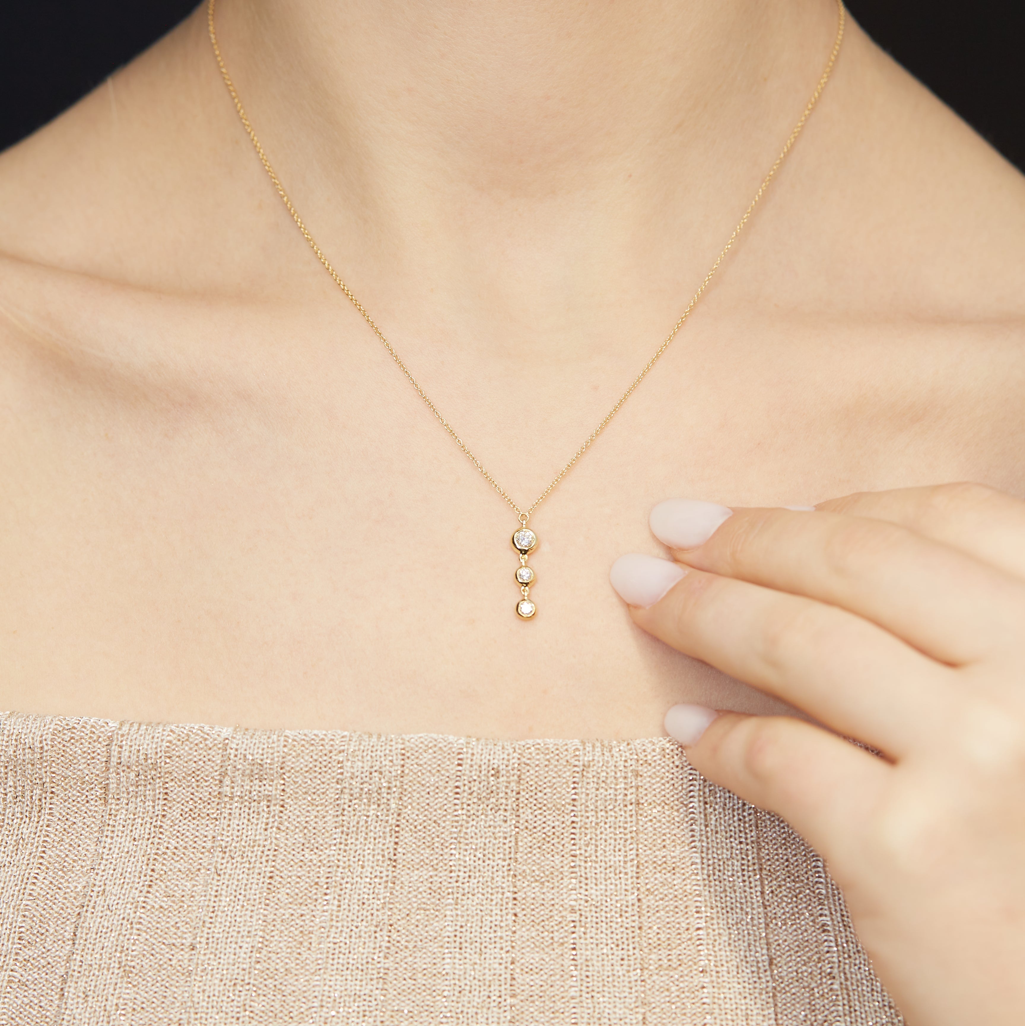 Un gioiello essenziale e luminoso, perfetto per l’uso quotidiano: tre diamanti Lab-Grown taglio brillante di grandezza a scalare, per un totale di 0,20 carati, selezionati per colore E/F e purezza VS, danno vita a un pendente sobrio ma d’impatto.