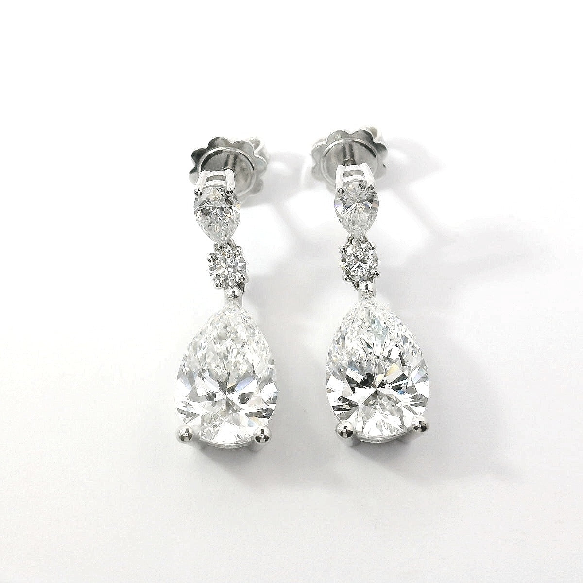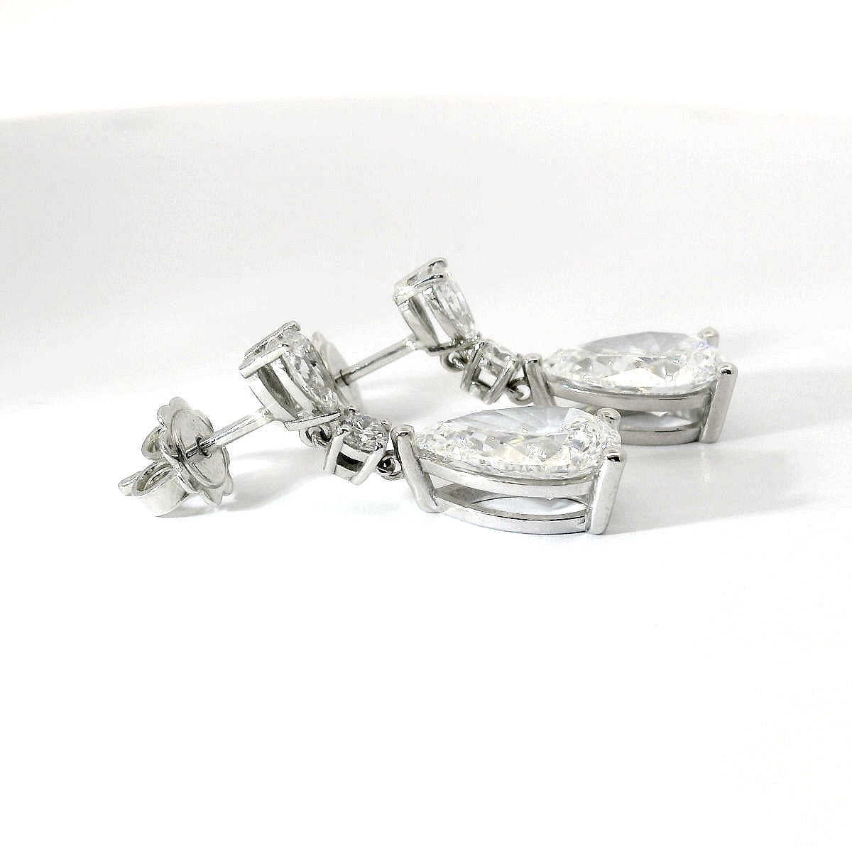 Le due gocce più grandi, per un totale di 5,68 carati, sono accompagnate da certificato IGI (LG650491682) e (LG652407394), con colore E e purezza VS1, mentre la caratura complessiva degli orecchini è di 6,24 carati.