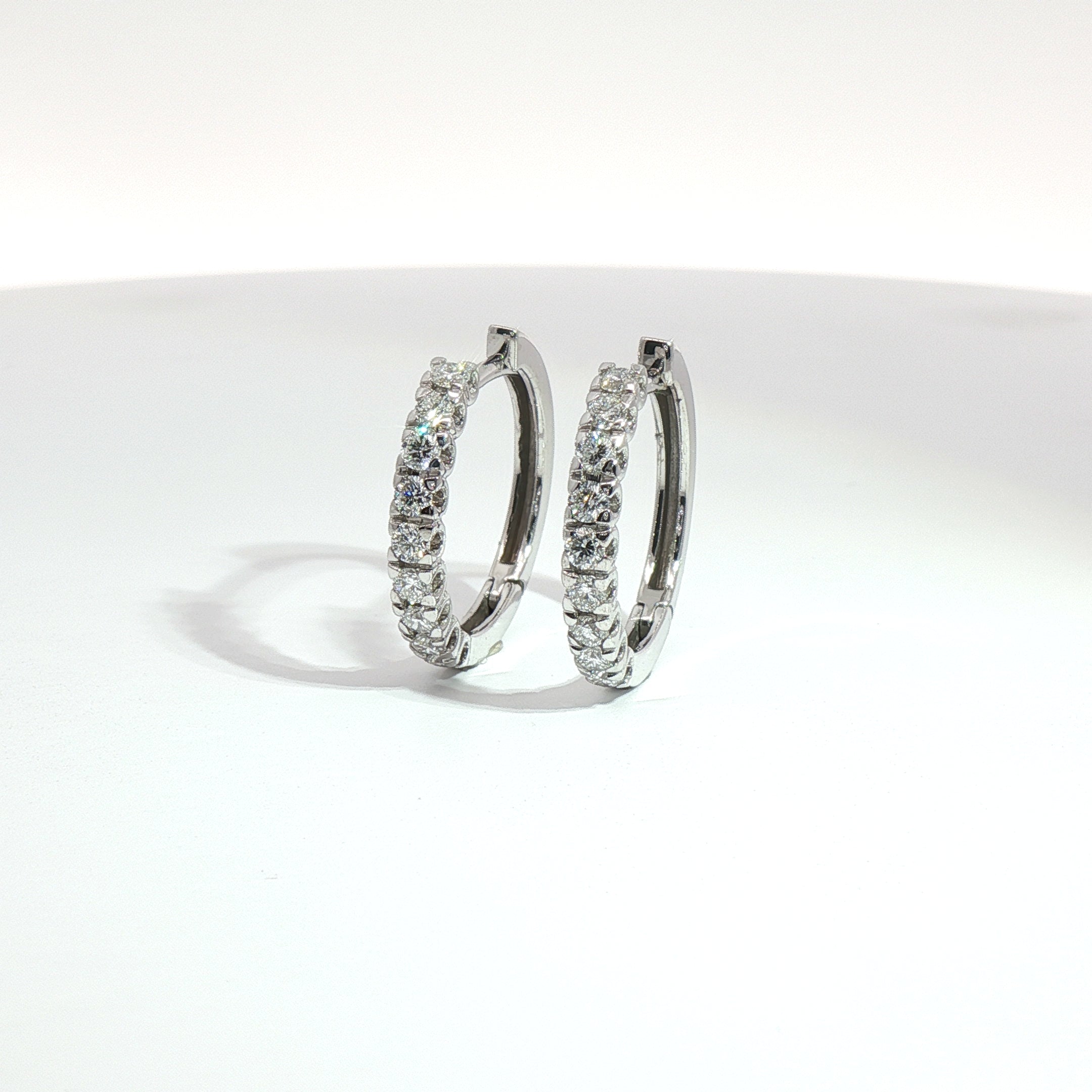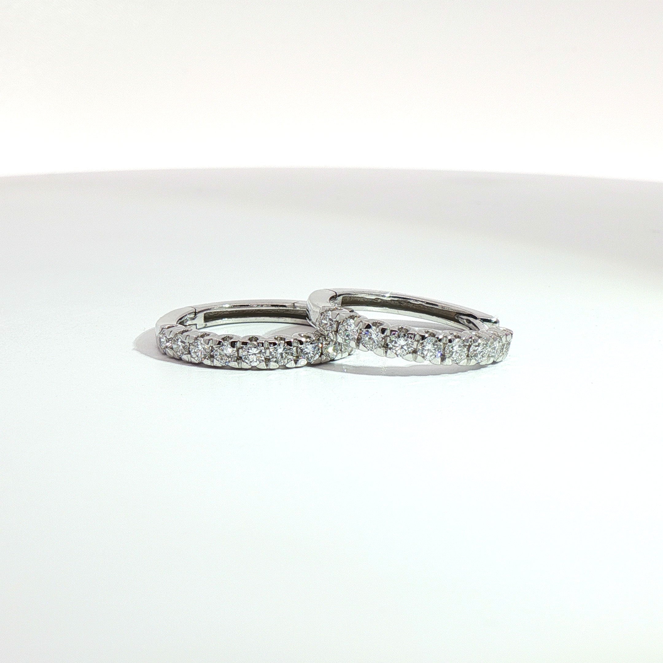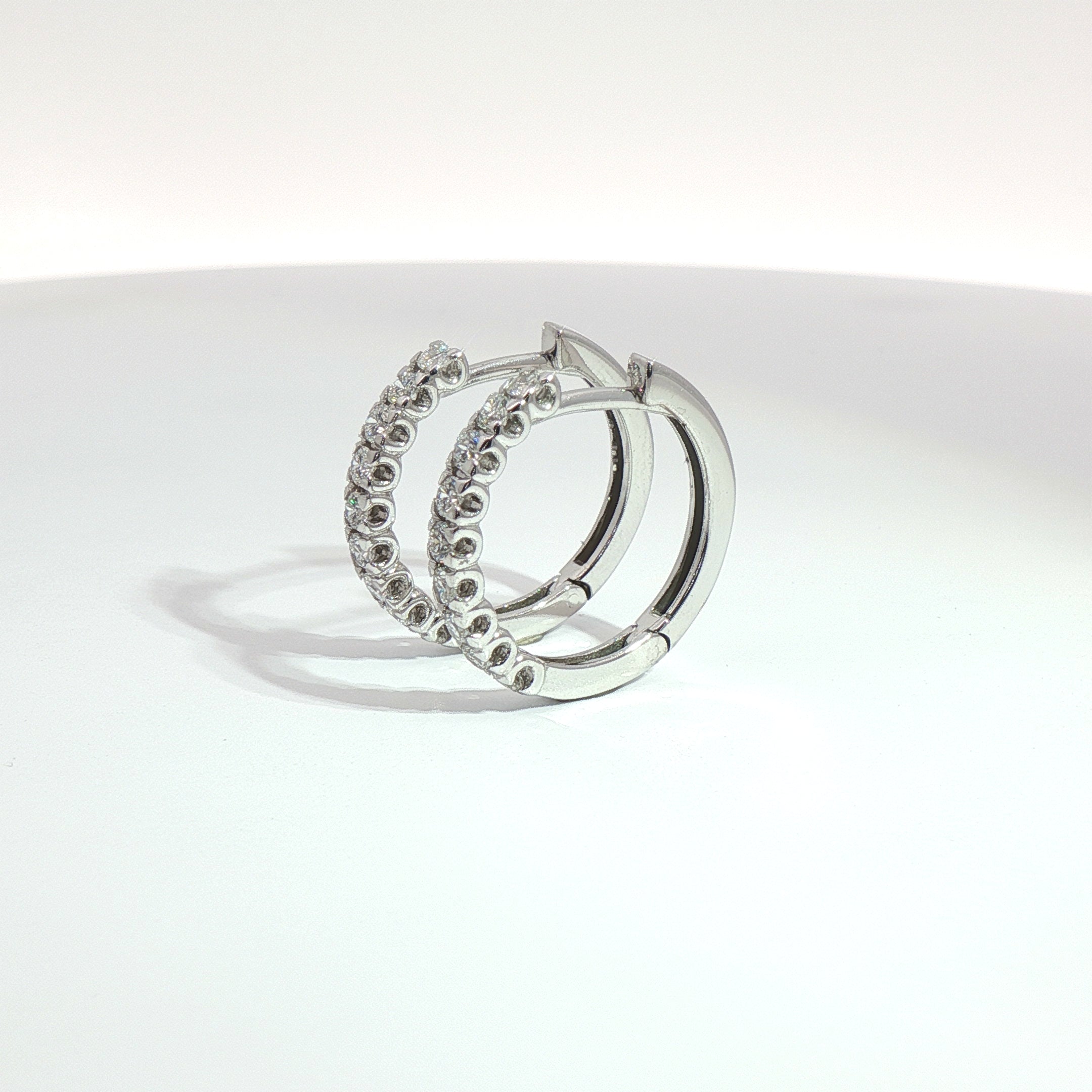 Orecchini a cerchio in oro bianco 18kt con diamanti Lab-Grown taglio brillante per un totale di 0,50 carati, selezionati per colore E/F e purezza VS. Ogni orecchino ospita 9 pietre incassate a giorno, che valorizzano la brillantezza di ogni diamante.