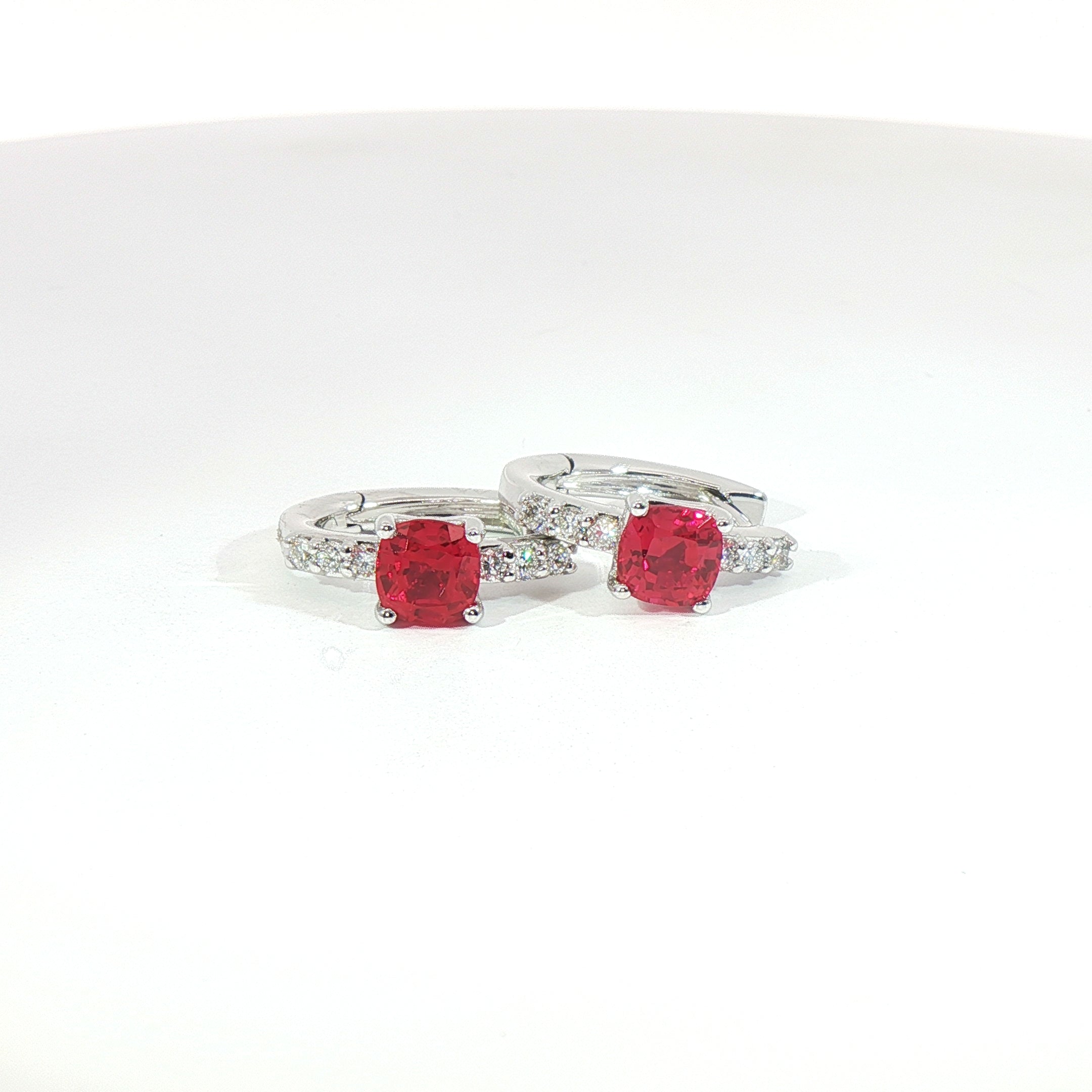Orecchini in oro bianco con rubini Lab-Grown taglio cuscino e diamanti Lab-Grown taglio brillante.