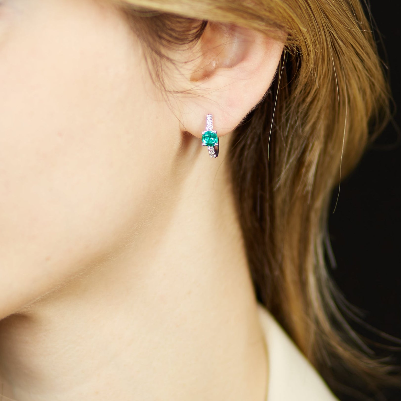 Al centro di ogni orecchino, uno smeraldo Lab-Grown taglio cuscino dalla tonalità verde intensa, per un totale di 1,01 carati, incastonato con maestria per esaltarne il volume e la simmetria. A incorniciare ogni pietra, sei diamanti Lab-Grown taglio brillante (tre sopra e tre sotto per ciascun orecchino), disposti per donare equilibrio e luce. Le pietre, selezionate per colore E/F e purezza VS, raggiungono una caratura complessiva di 0,22 carati.