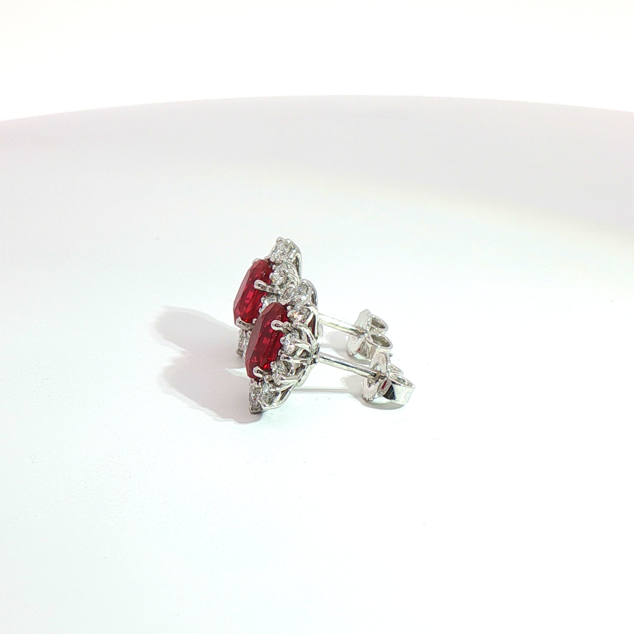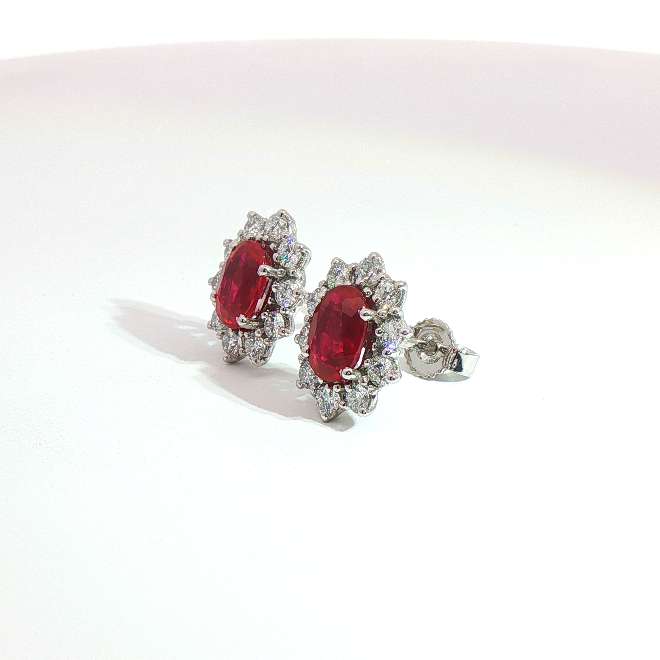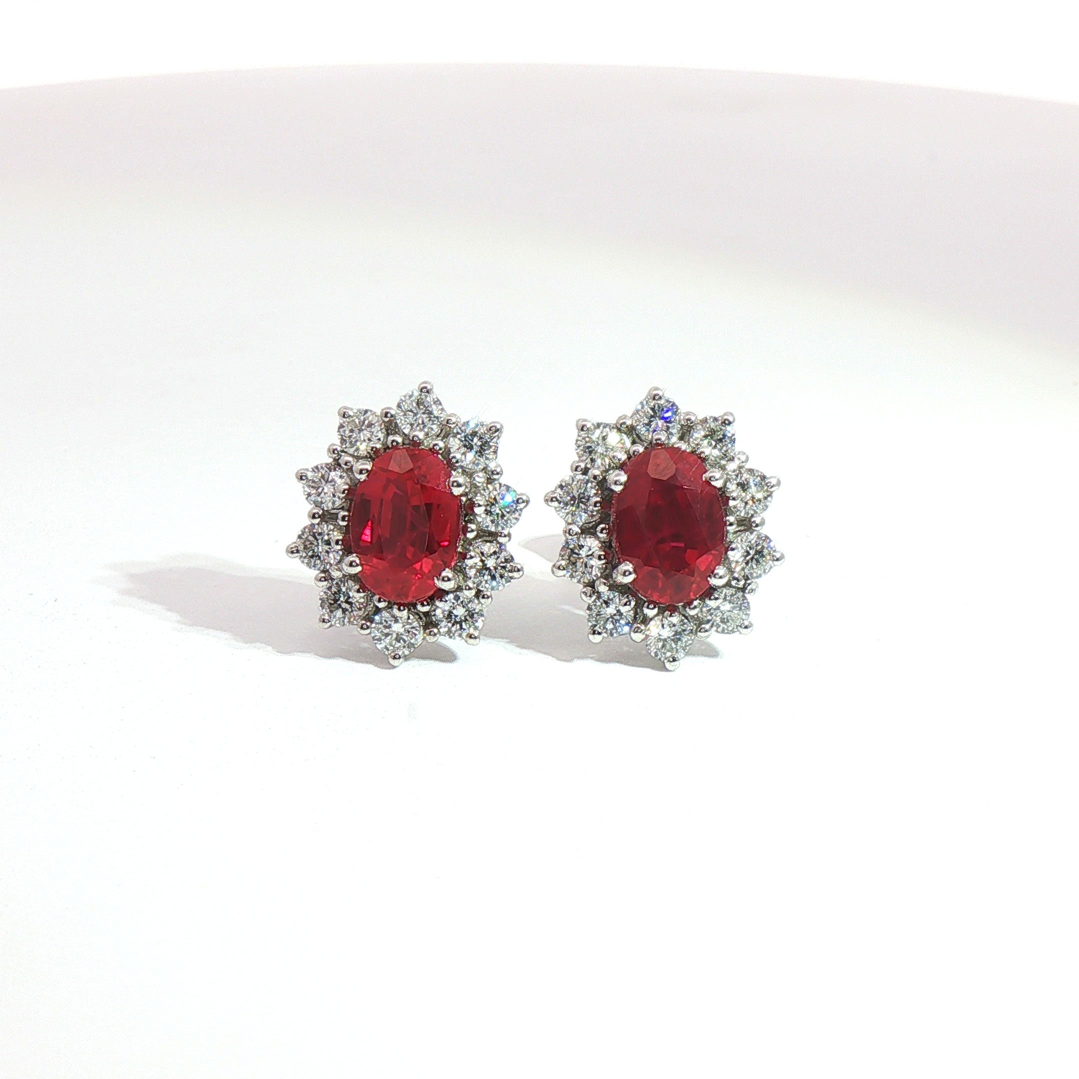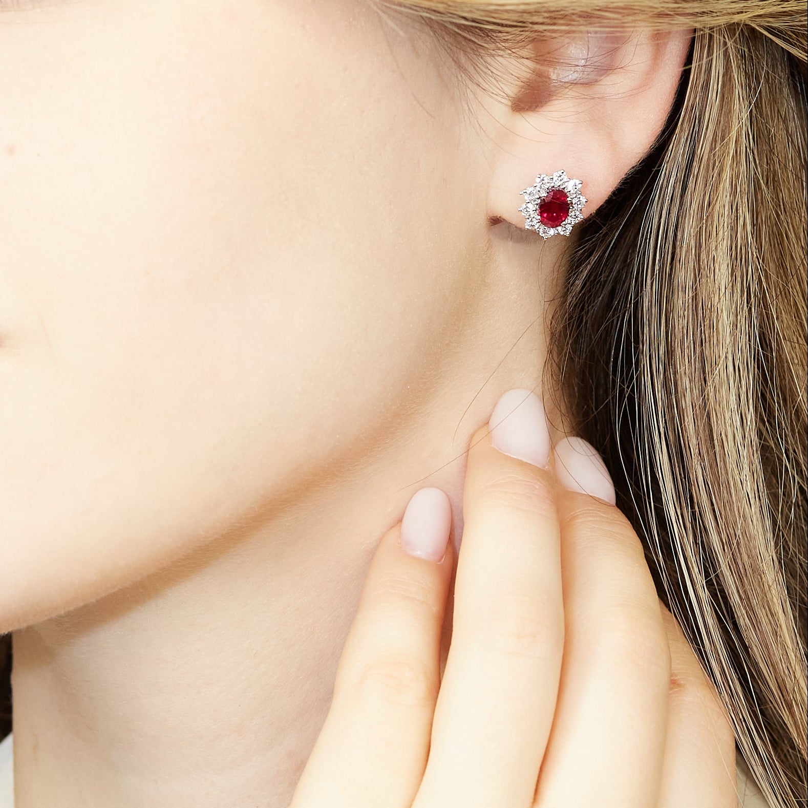 Un'eleganza senza tempo prende forma in questi orecchini in oro bianco 18kt, dove il protagonista è un rubino Lab-Grown taglio ovale per 2,10 carati avvolto da 10 diamanti Lab-Grown taglio brillante disposti a corona per un totale complessivo di 0,81 carati.