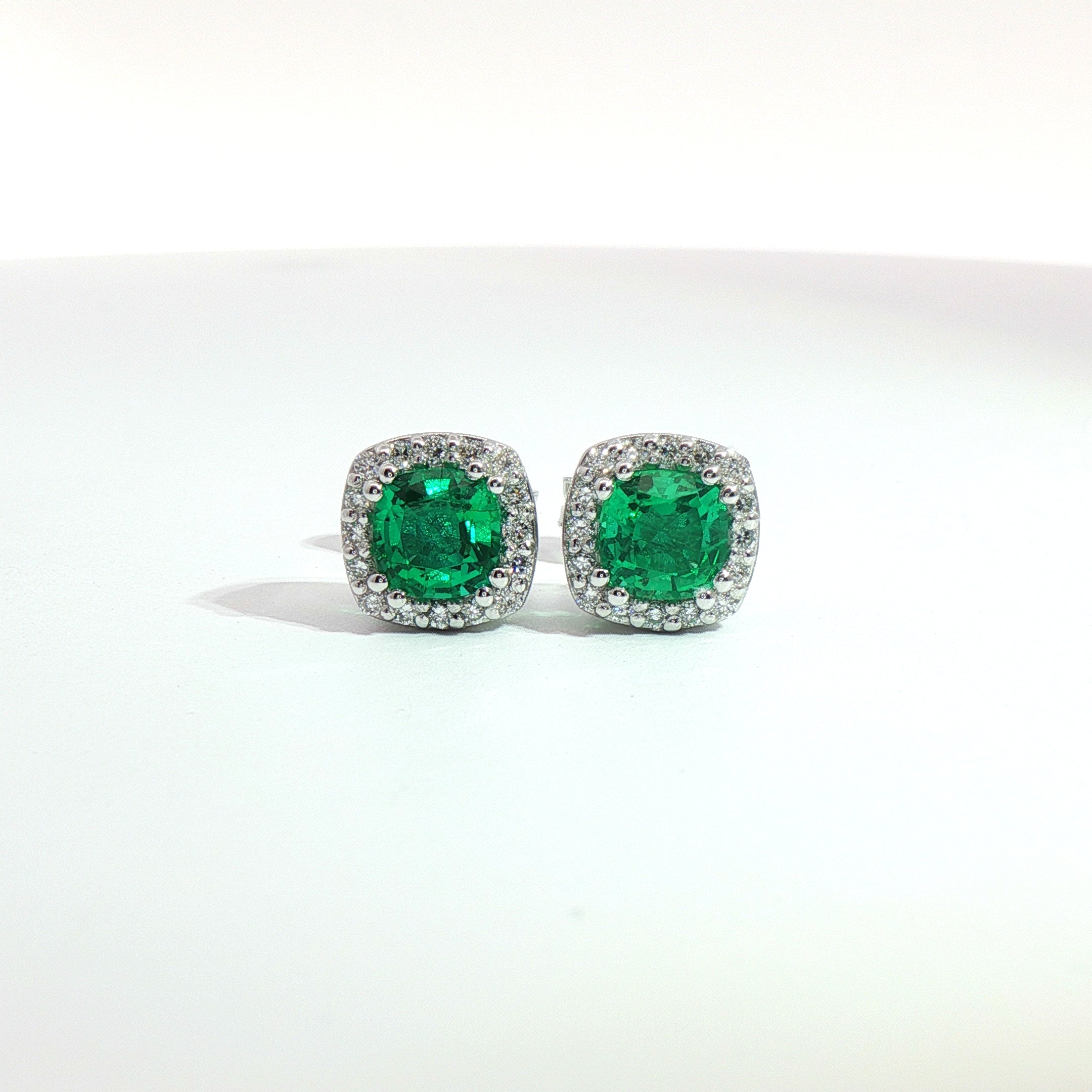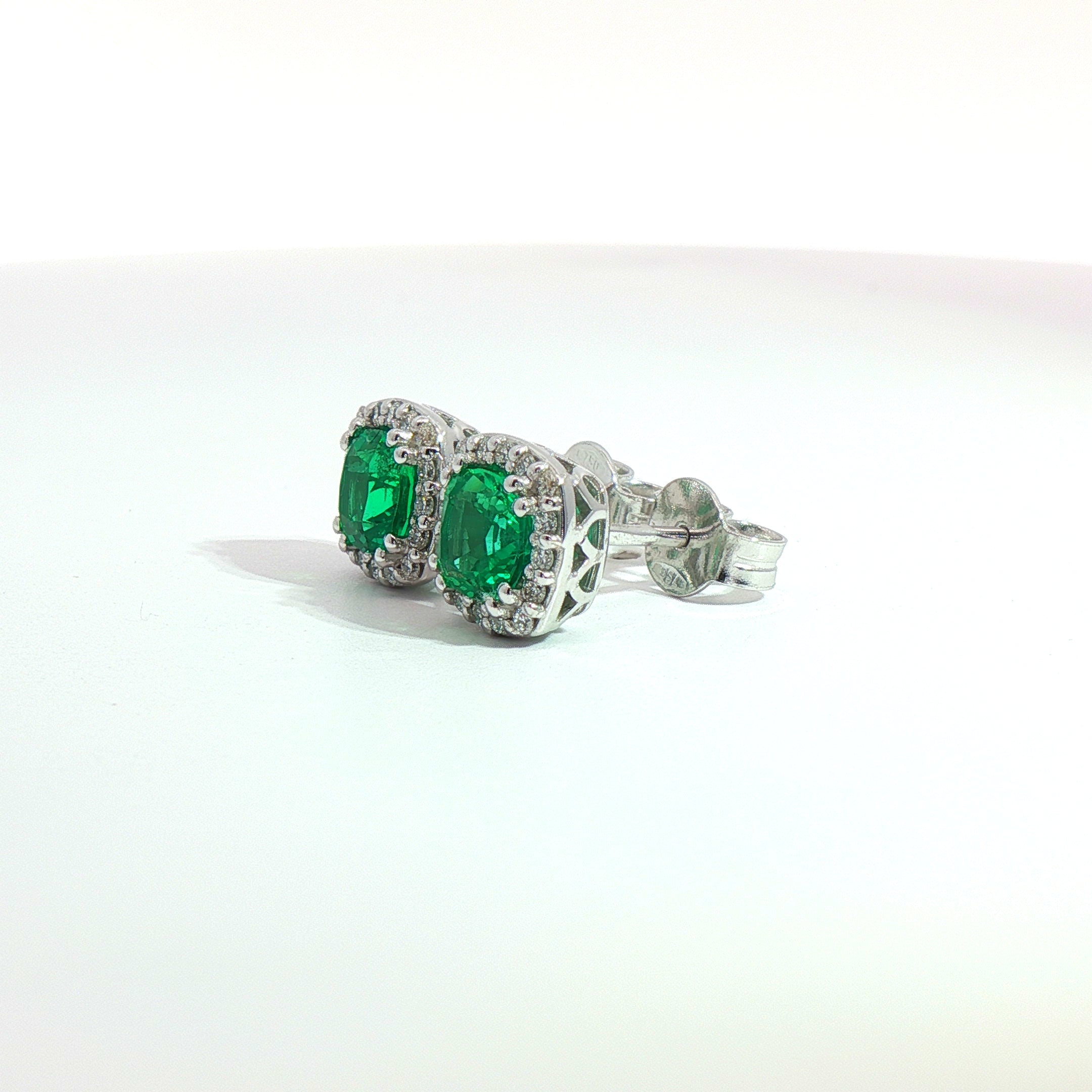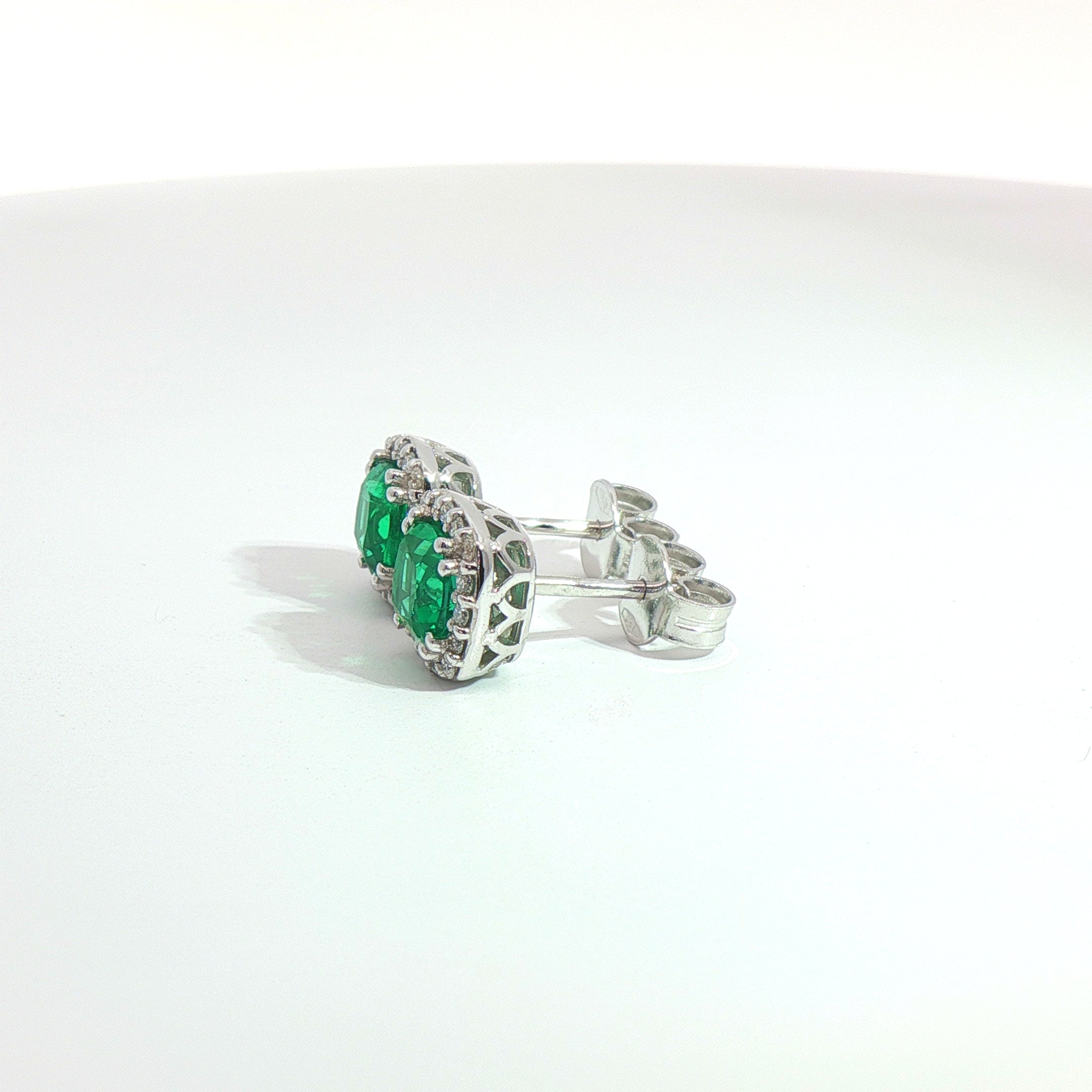 Orecchini punto luce in oro bianco con smeraldi Lab-Grown taglio cuscino e diamanti Lab-Grown taglio brillante.