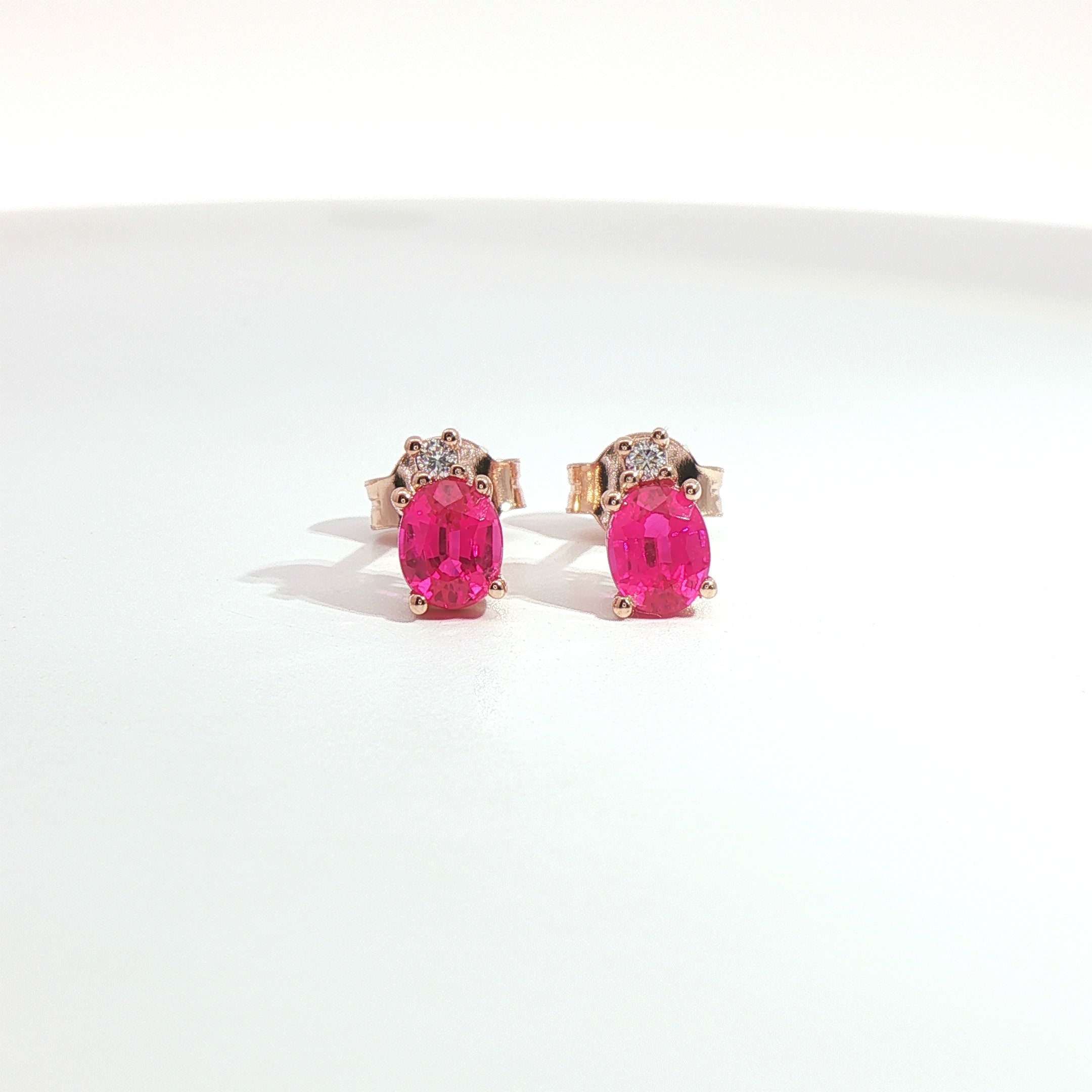 Orecchini punto luce in oro rosa con zaffiri rosa Lab-Grown taglio ovale e diamanti Lab-Grown taglio brillante.