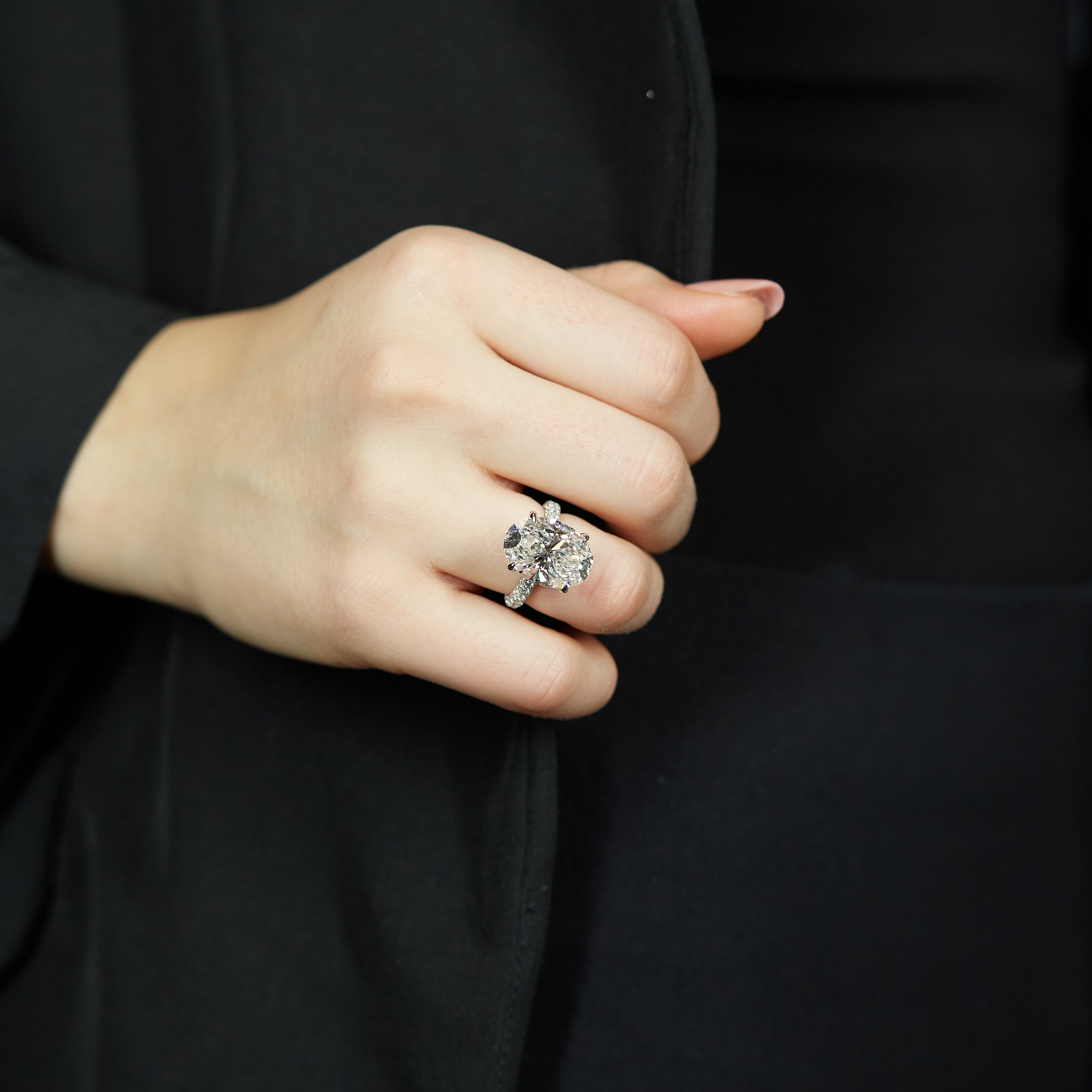 In oro bianco 18kt, questo solitario lascia senza fiato per imponenza e dettaglio. Al centro brilla un diamante Lab-Grown taglio ovale da 10 carati, corredato da certificazione IGI, selezionato per la sua straordinaria brillantezza e purezza.