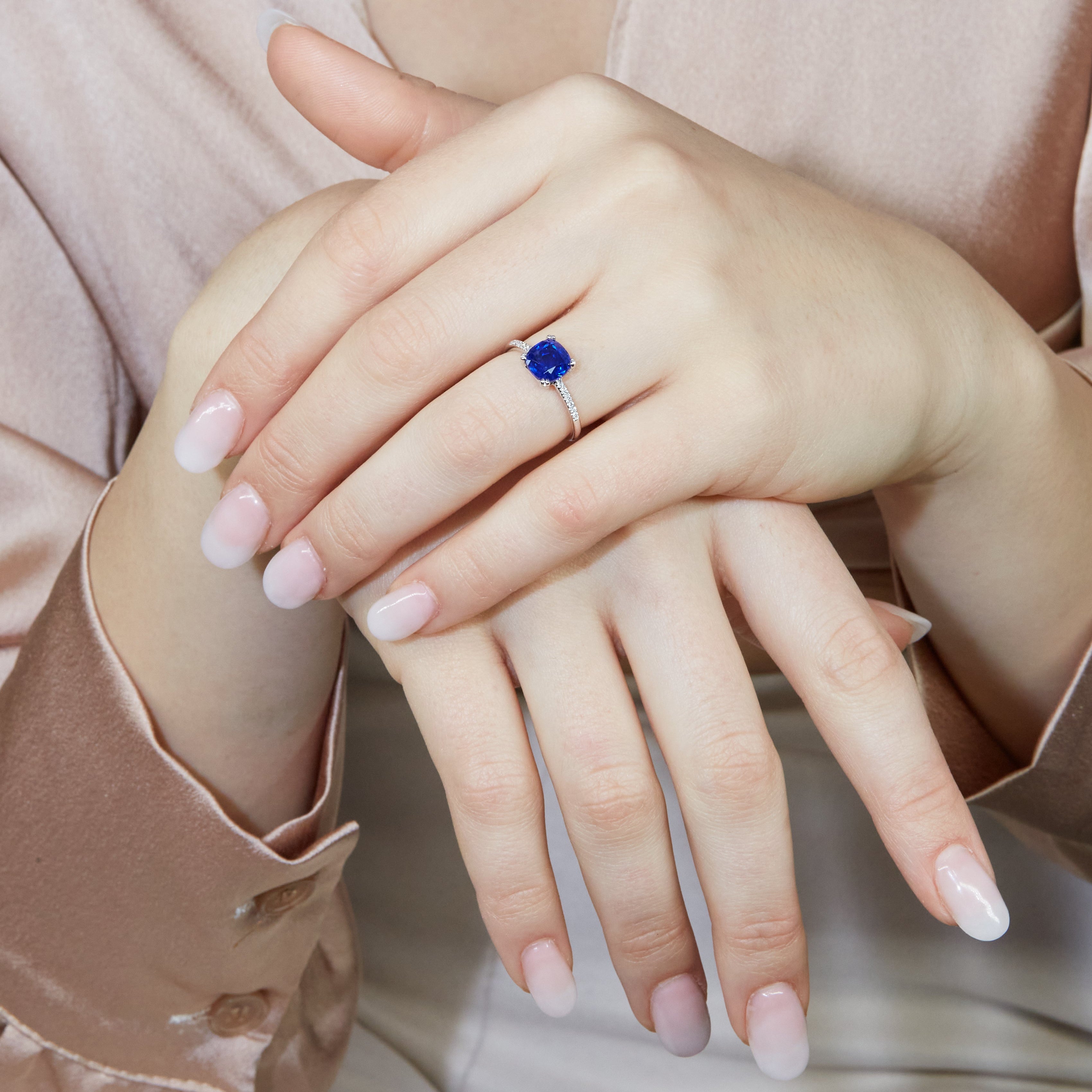 Anello solitario in oro bianco 18 kt con zaffiro Lab-Grown taglio cuscino da 2,30 carati, incastonato in un castone a 4 doppie punte che ne valorizza la forma regolare e la profondità cromatica. Il gambo sottile è arricchito da diamanti Lab-Grown taglio brillante da 0,05 carati complessivi, selezionati per colore E/F e purezza VS, disposti in linea per accompagnare con discrezione la pietra centrale.