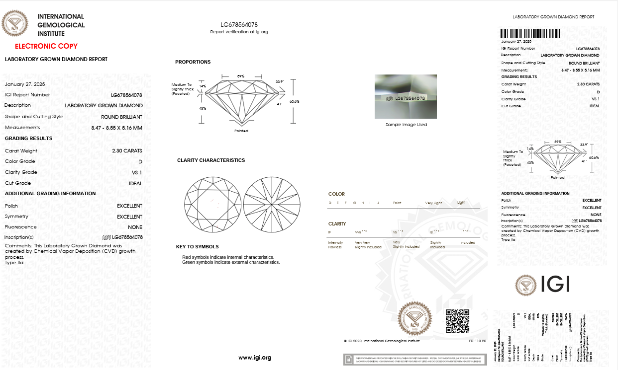 Tutti i diamanti di C-01 jewels sopra 1,00 ct (per quanto riguarda i tagli di forma) sono dotati di di certificatione IGI internazionale.