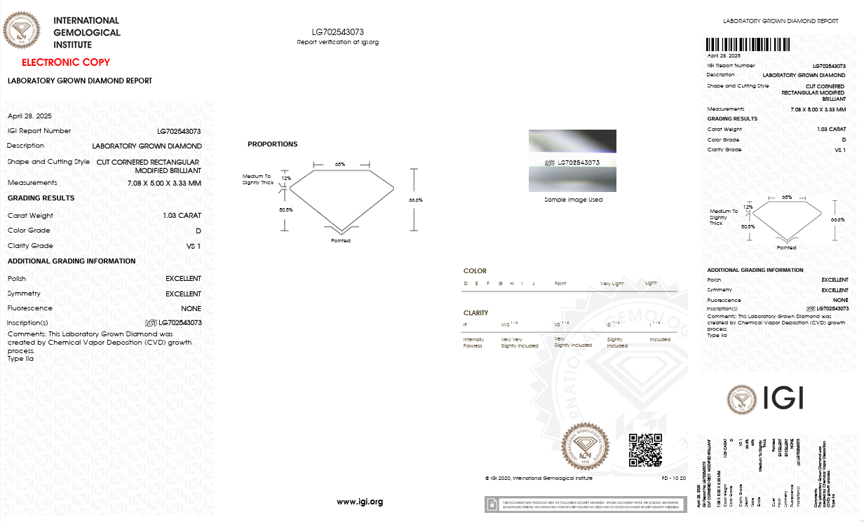 Tutti i diamanti di C-01 jewels sopra 1,00 ct (per quanto riguarda i tagli di forma) sono dotati di di certificatione IGI internazionale.