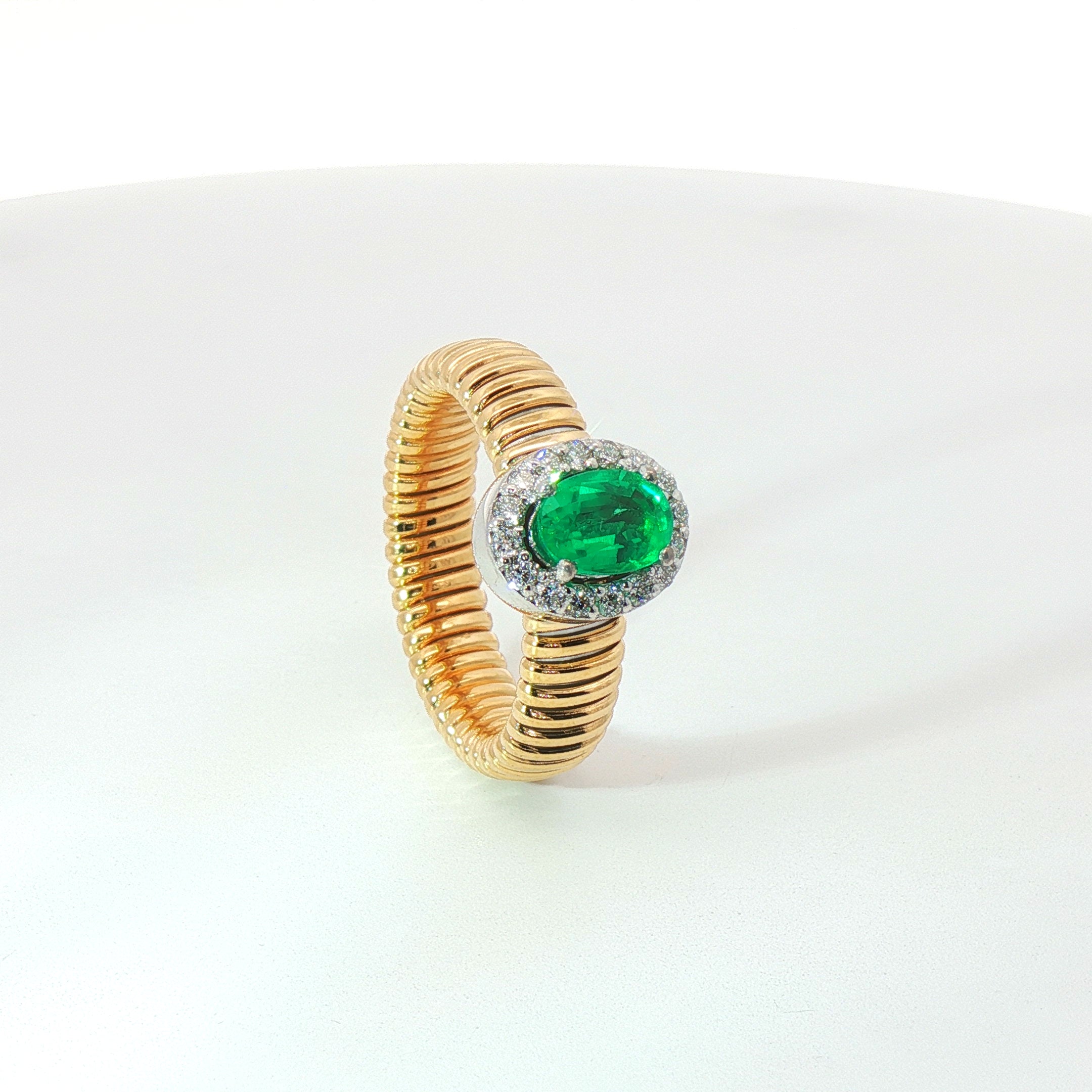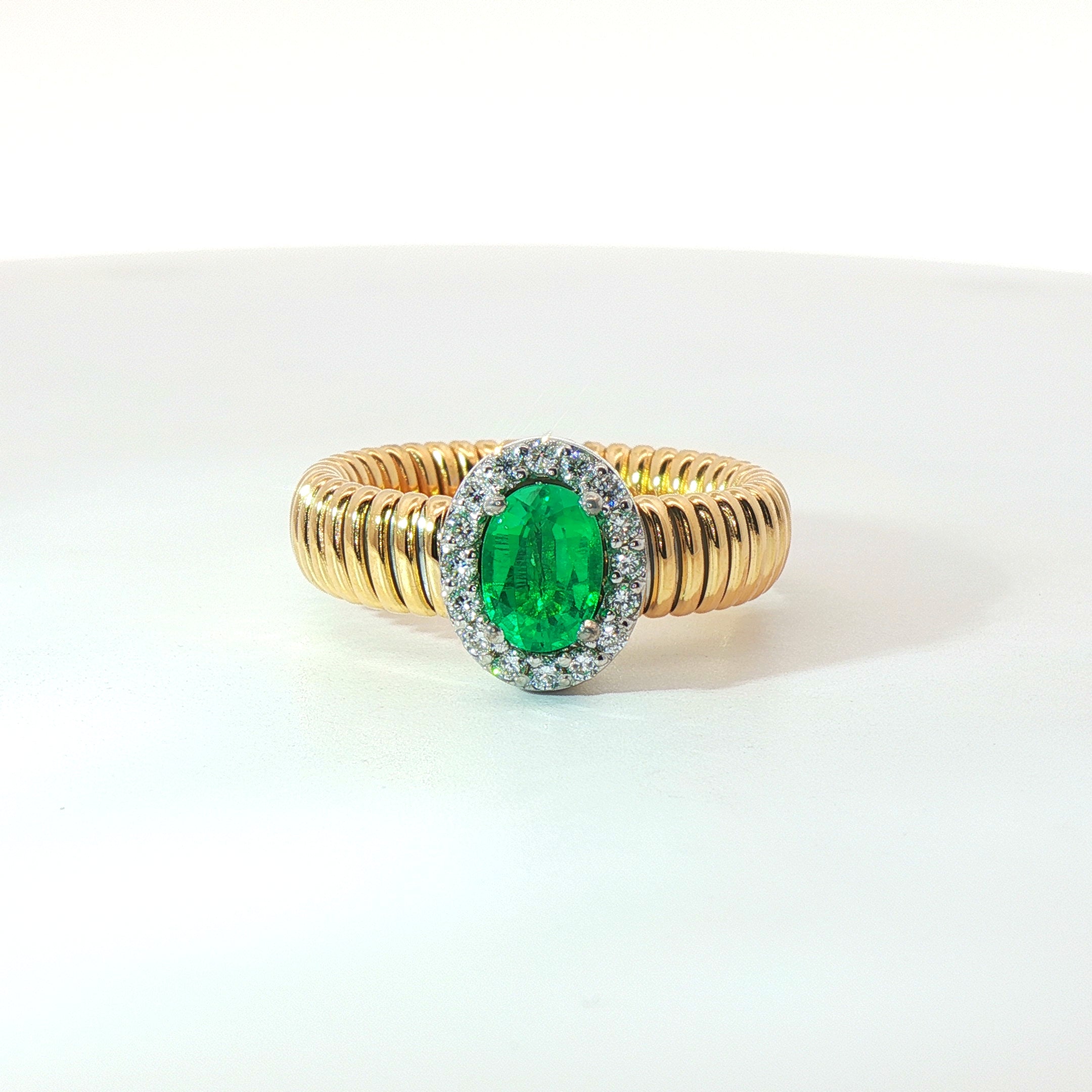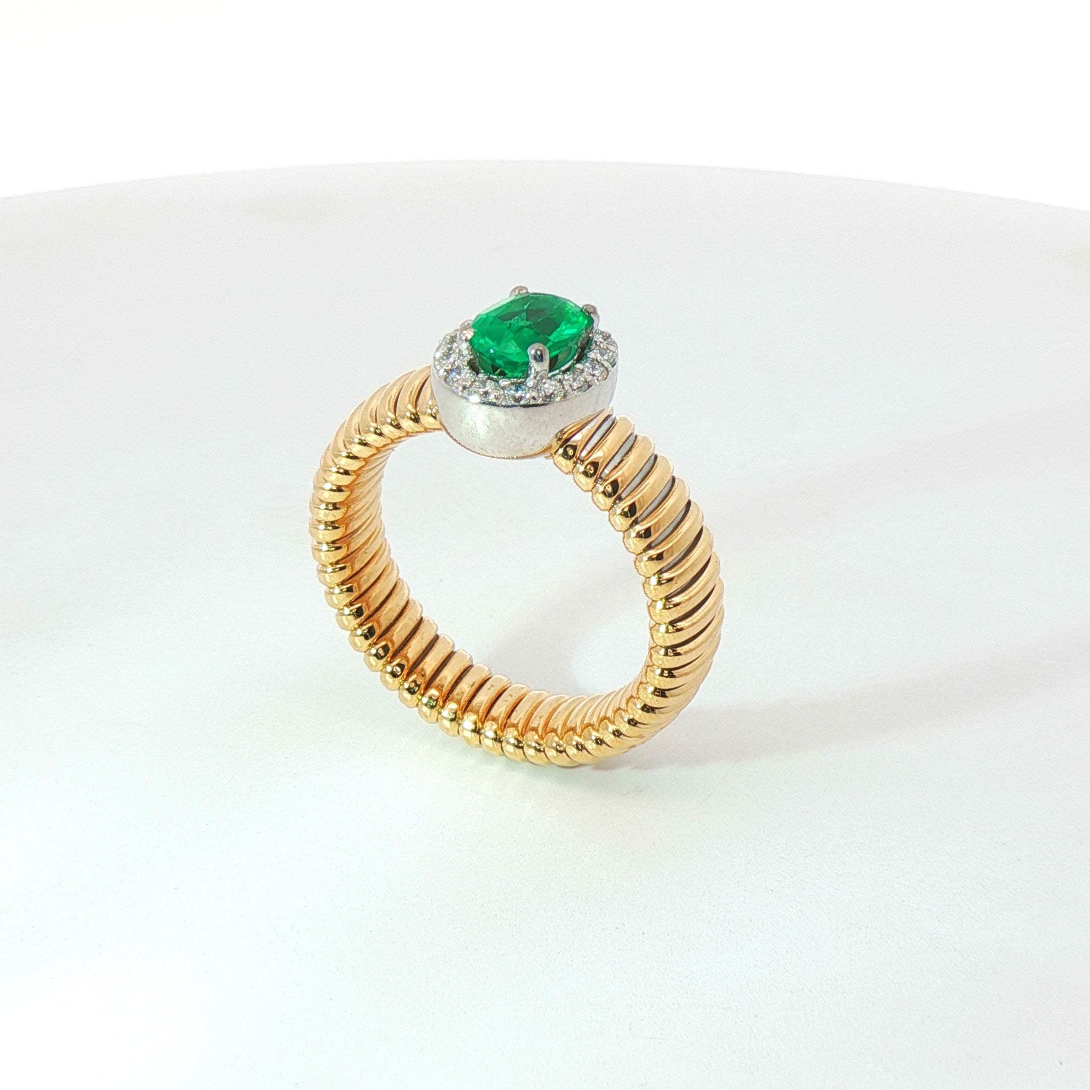 Solitario Queen con contorno in oro giallo tubogas con Smeraldo Lab-Grown taglio ovale e Diamanti Lab-Grown taglio brillante.