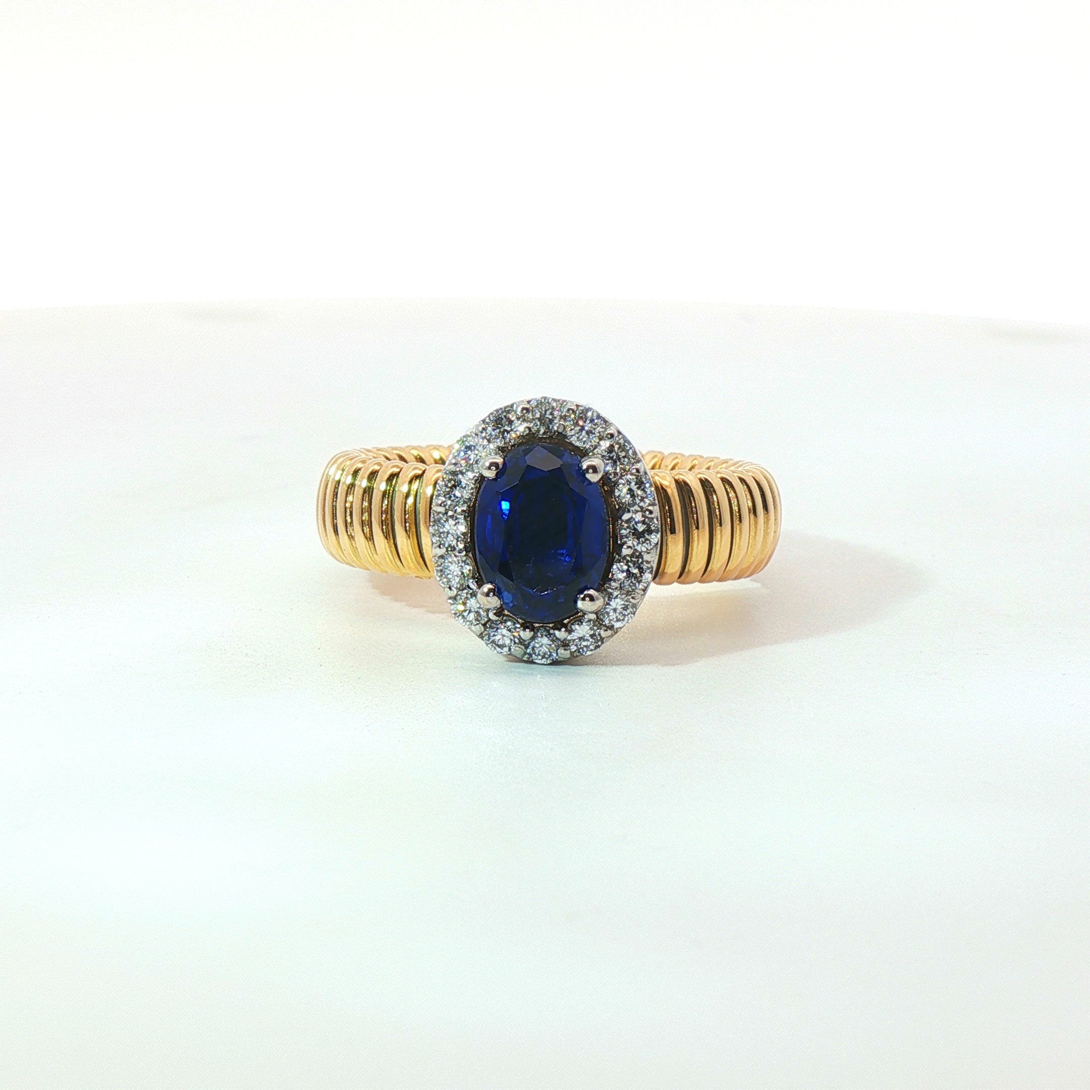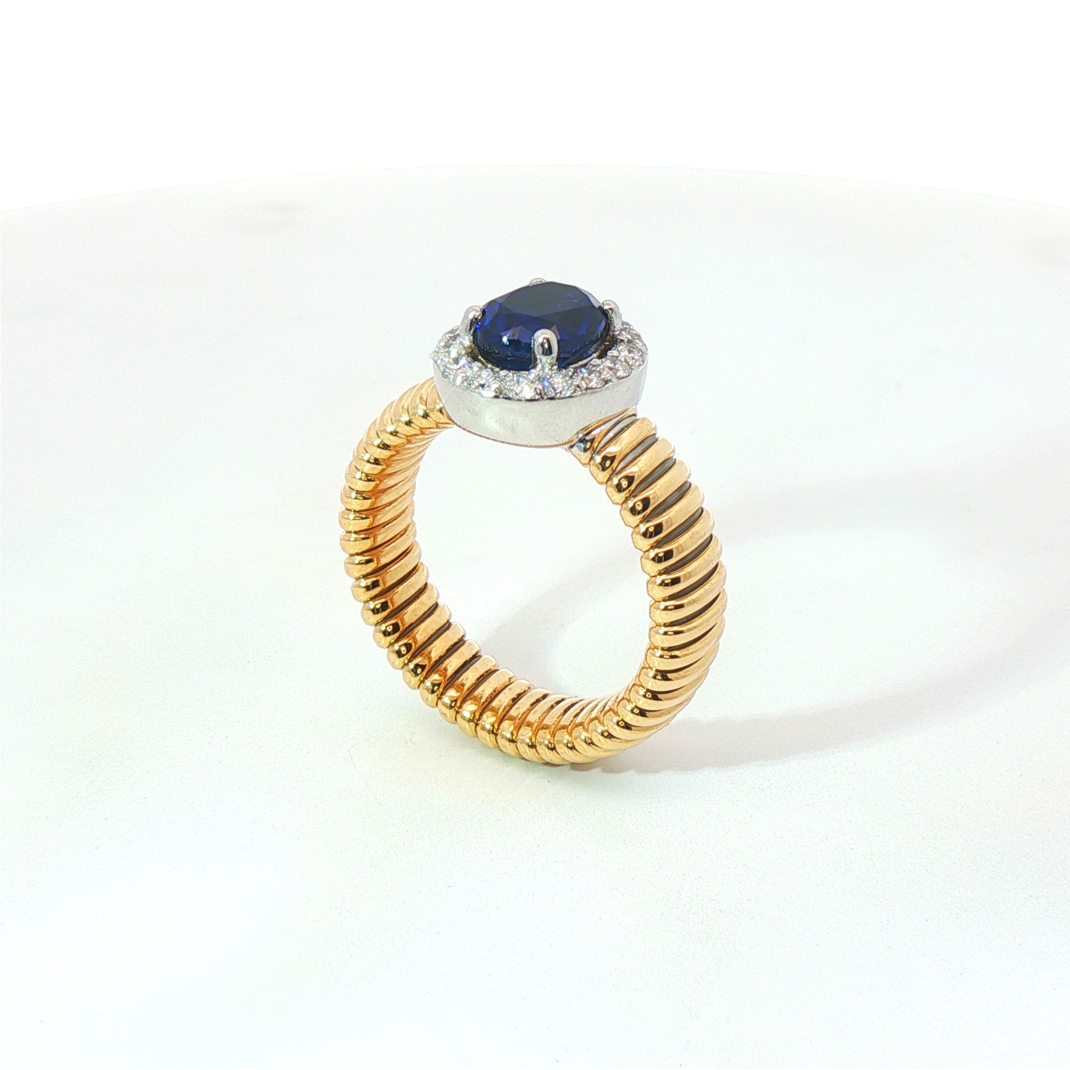 Solitario collezione Queen realizzato in maglia Tubogas in oro giollo 18kt, dal design flessibile e senza tempo, impreziosito da uno zaffiro Lab-Grown taglio ovale da 2,06 carati che cattura la luce con profondità e intensità.
