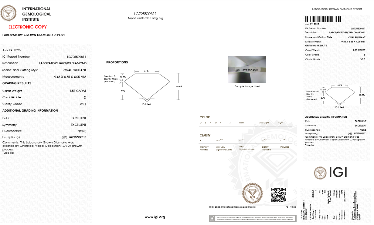 Tutti i diamanti di C-01 jewels sopra 1,00 ct (per quanto riguarda i tagli di forma) sono dotati di di certificatione IGI internazionale.
