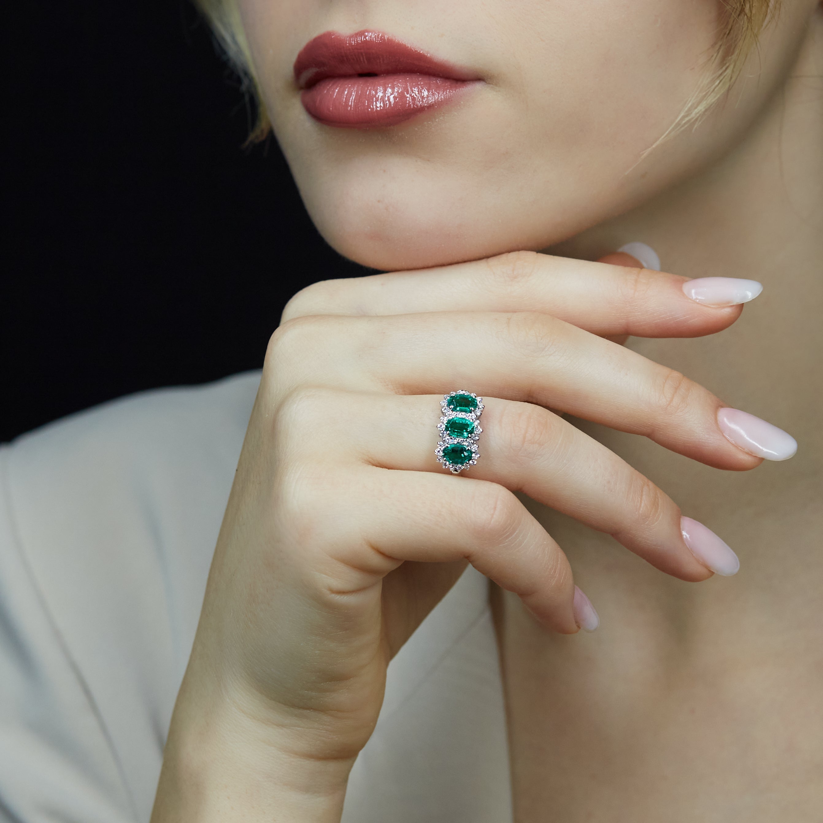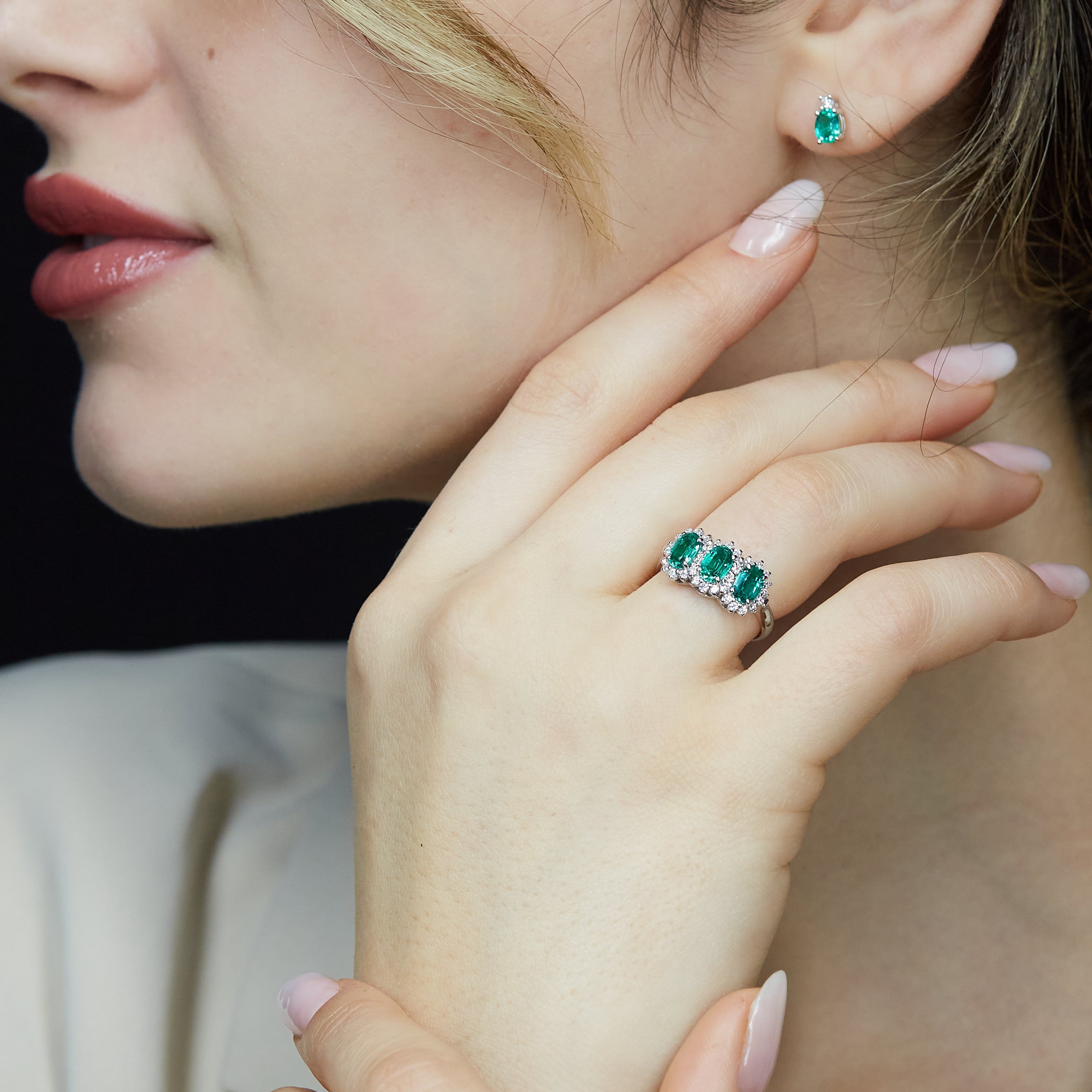 Trilogy in oro bianco 18 kt con smeraldi Lab-Grown taglio ovale da 1,33 carati totali e diamanti Lab-Grown taglio brillante per un totale di 0,34 carati.