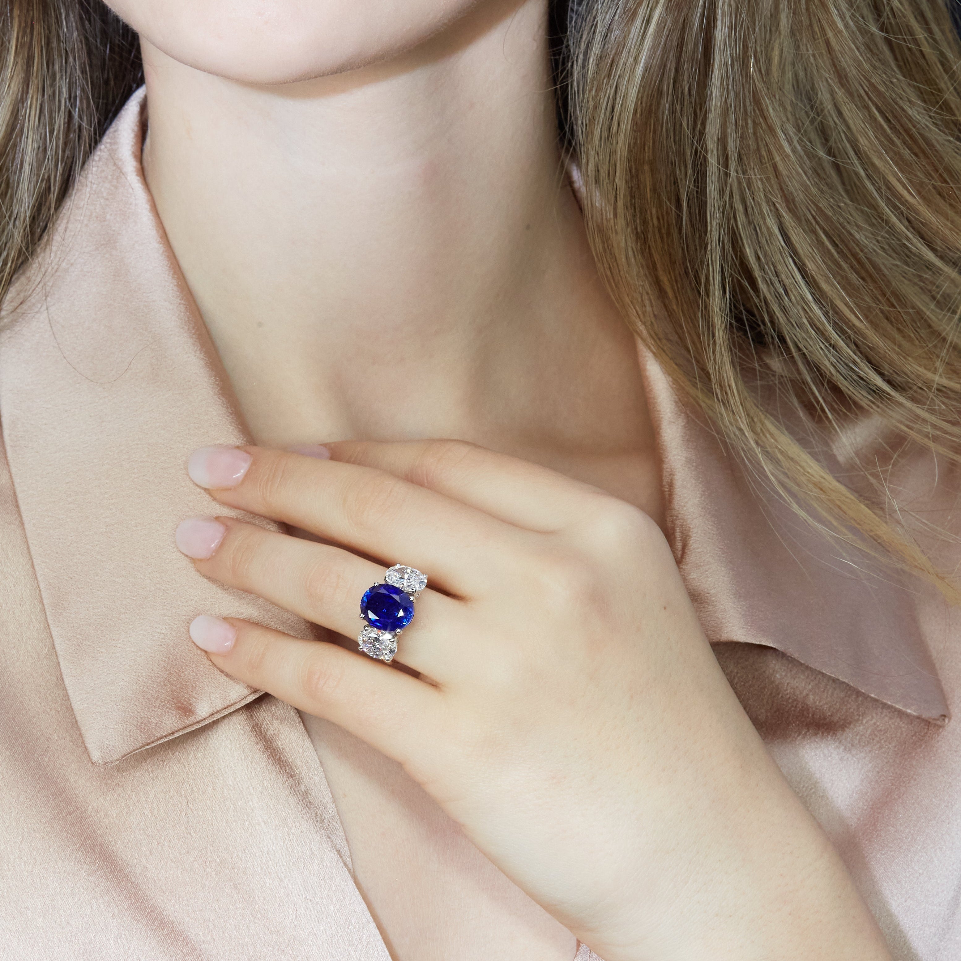 Protagonista assoluto, un intenso zaffiro Lab-Grown taglio ovale da 7,80 carati, certificato, domina la composizione con il suo blu profondo e luminoso.